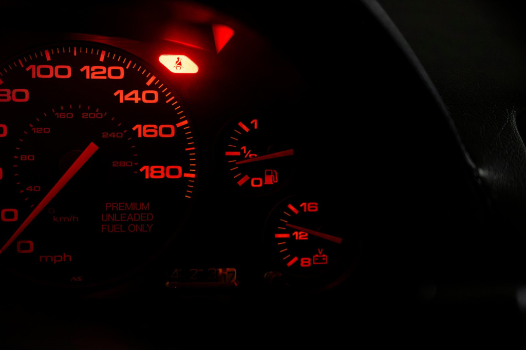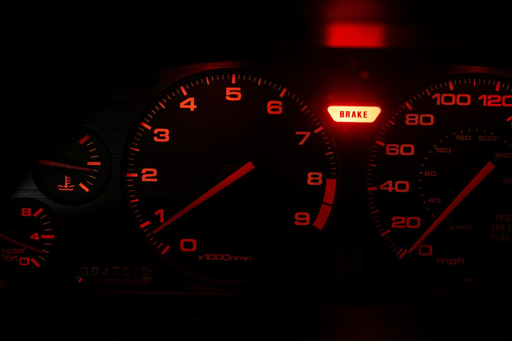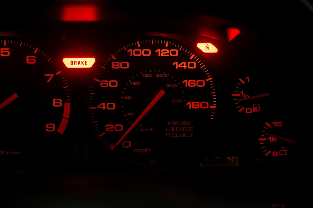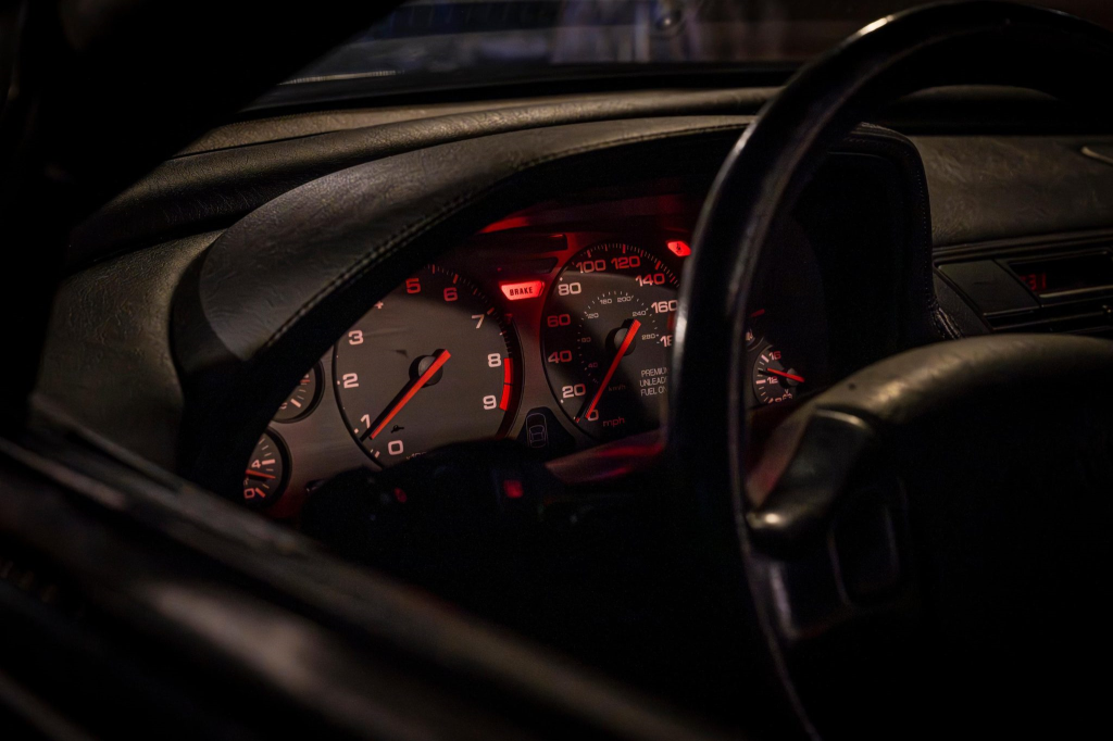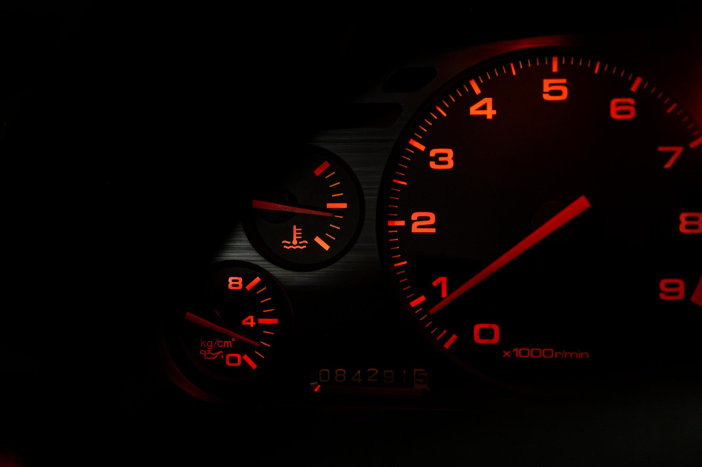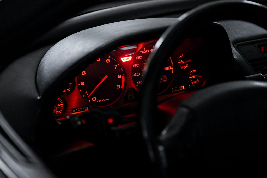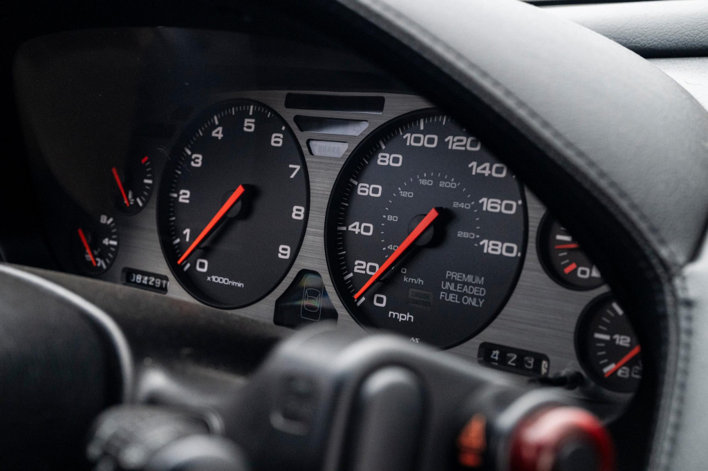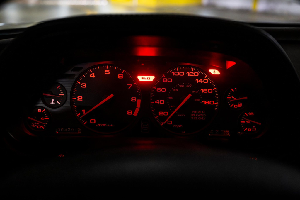 The leather-wrapped steering wheel frames a tachometer with -rpm redline, a 188-mph speedometer, and gauges for coolant temperature, oil pressure, voltage, and fuel level. The six-digit odometer shows 84k miles, approximately 600 of which were added under current ownership.