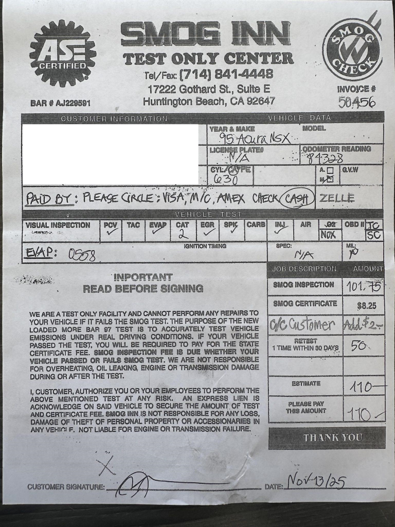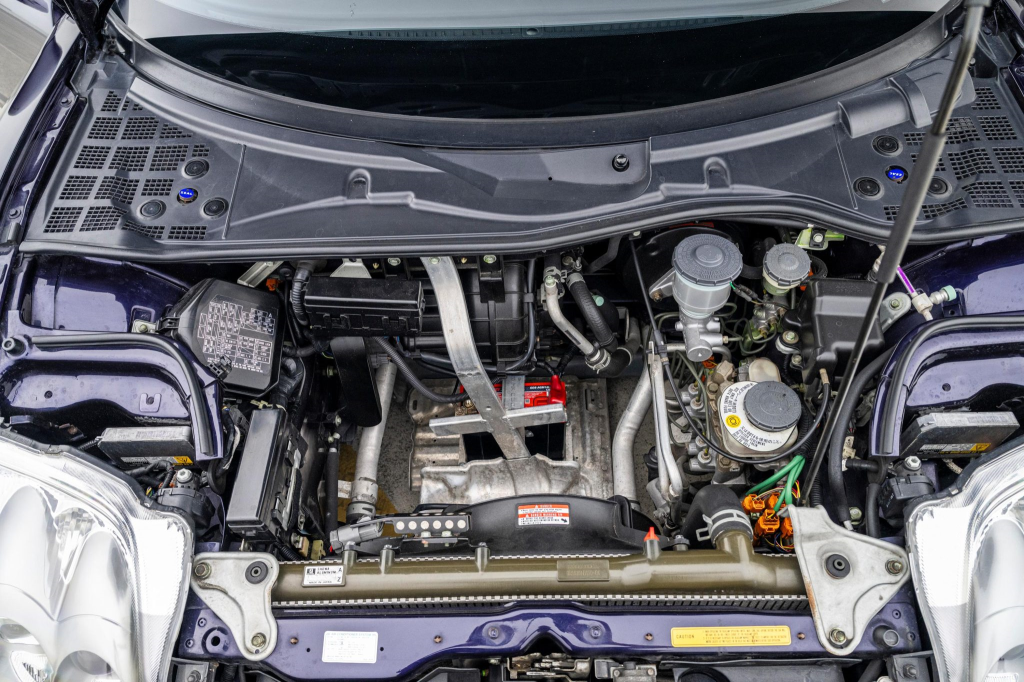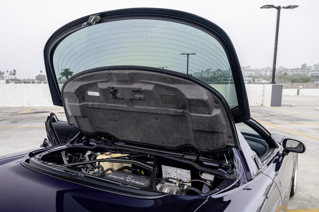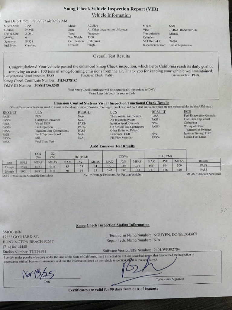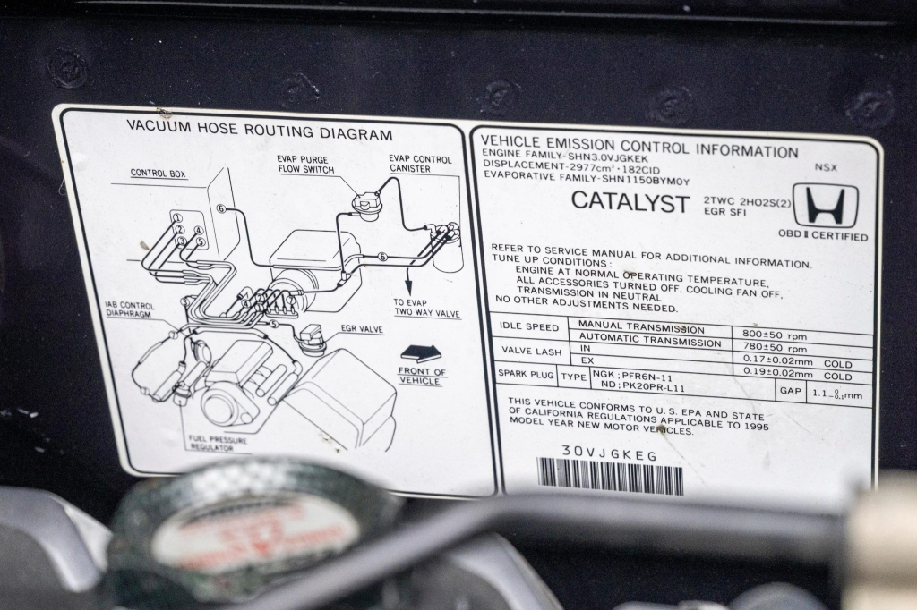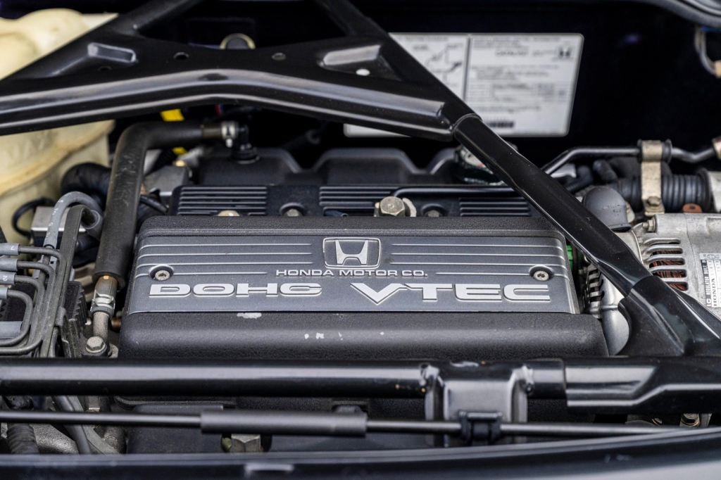 The mid-mounted 3.0-liter V6 features VTEC variable valve timing and was factory rated at 270 horsepower and 210 lb-ft of torque. Power is routed to the rear wheels via a retrofitted six-speed manual transaxle that was reportedly sourced from an NA2 NSX and installed under previous ownership. The seller notes that the serpentine belt was replaced in 2021. A November 2025 Smog Check Vehicle Inspection Report can be viewed in the gallery.