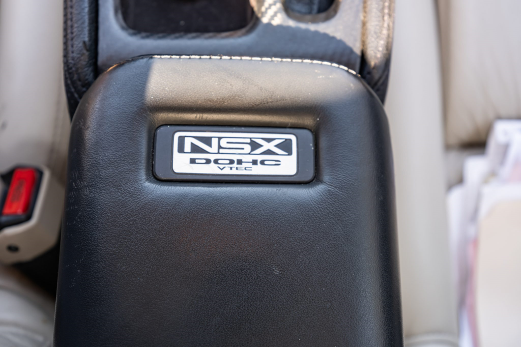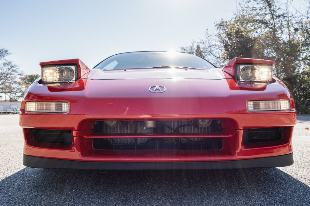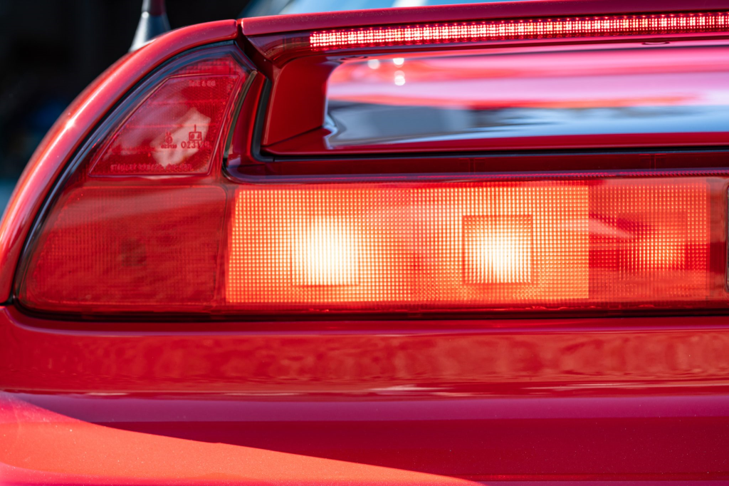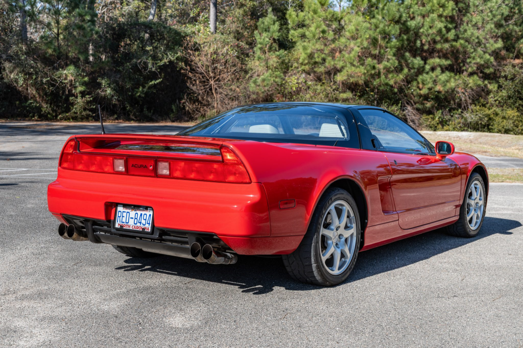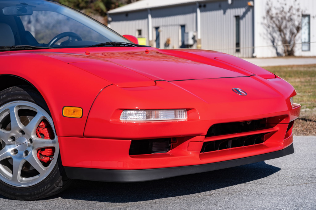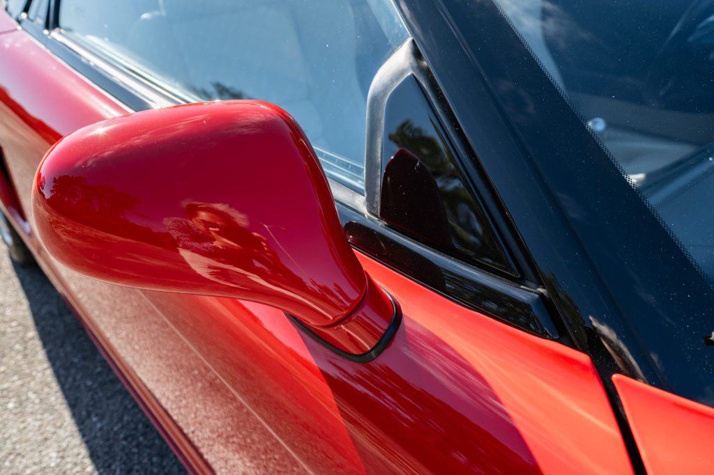 The NSX featured aluminum bodywork, and this example is finished in Formula Red with a black roof panel and pillars. Features include pop-up headlights, an integrated rear wing, side air intakes, power-adjustable side mirrors, and quad exhaust outlets. The front bumper cover is said to have been repainted under previous ownership, and the seller states a ceramic coating was applied to the body following their acquisition. Scratches are noted on the rear bumper cover.