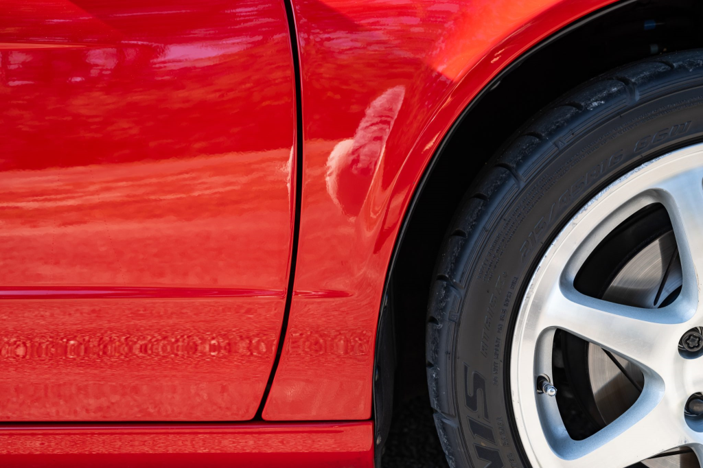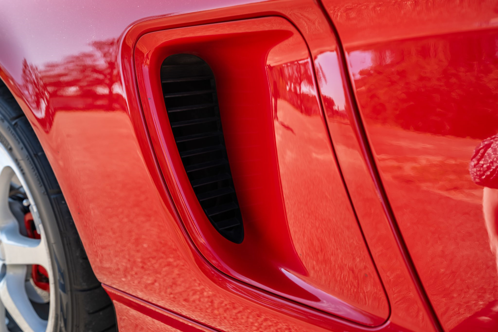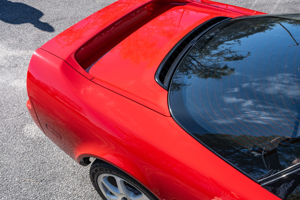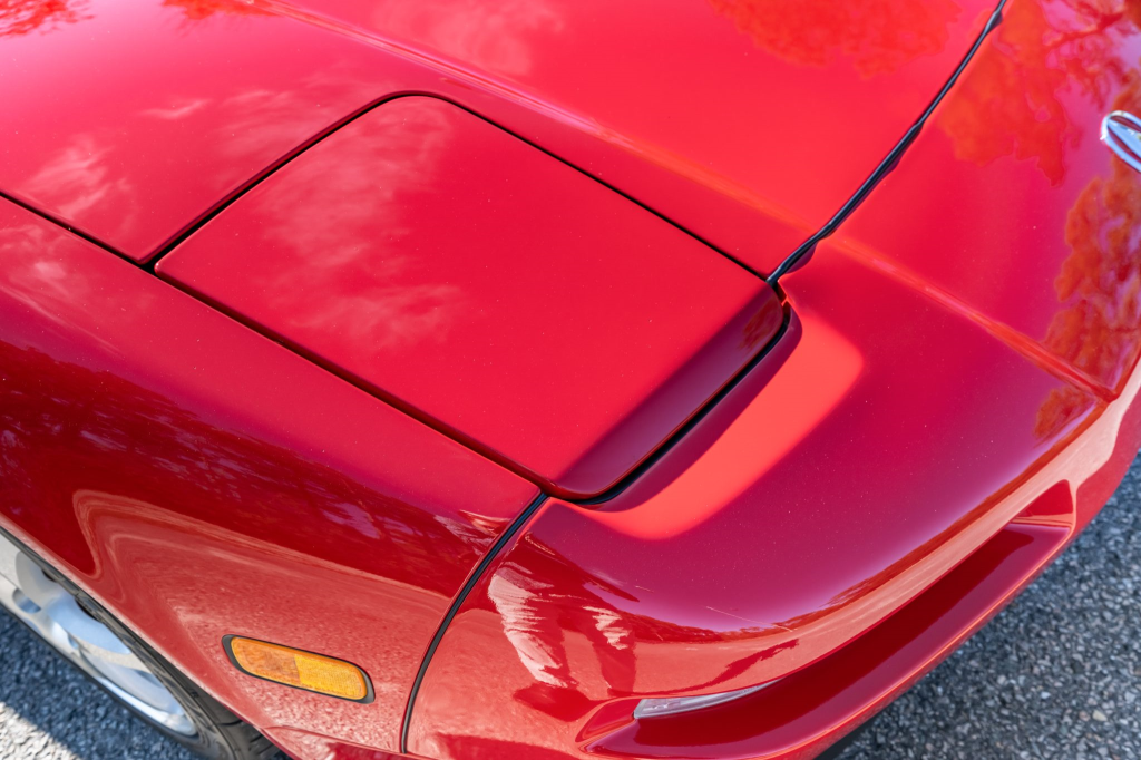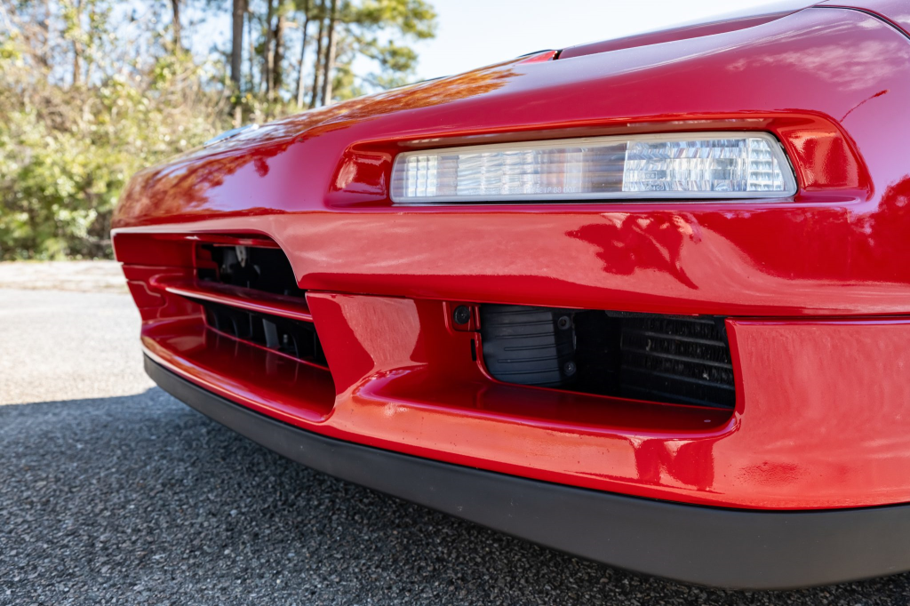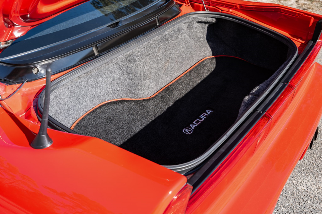 The NSX featured aluminum bodywork, and this example is finished in Formula Red with a black roof panel and pillars. Features include pop-up headlights, an integrated rear wing, side air intakes, power-adjustable side mirrors, and quad exhaust outlets. The front bumper cover is said to have been repainted under previous ownership, and the seller states a ceramic coating was applied to the body following their acquisition. Scratches are noted on the rear bumper cover.