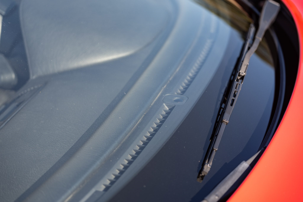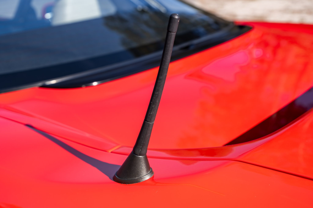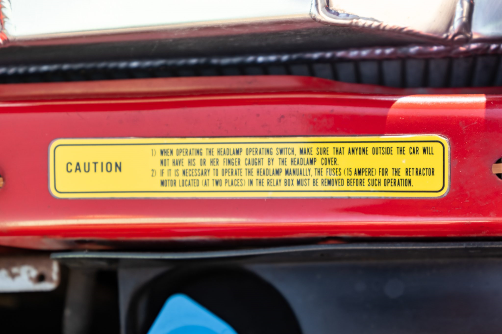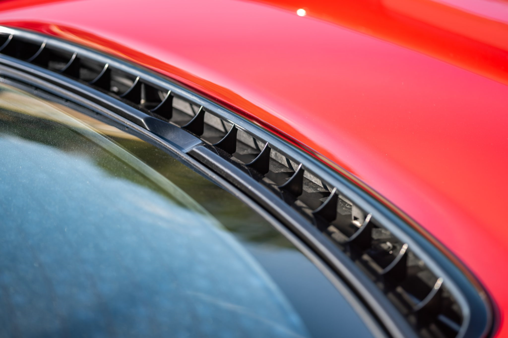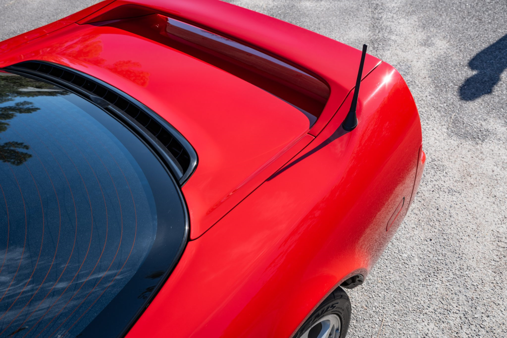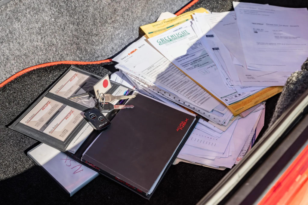 The NSX featured aluminum bodywork, and this example is finished in Formula Red with a black roof panel and pillars. Features include pop-up headlights, an integrated rear wing, side air intakes, power-adjustable side mirrors, and quad exhaust outlets. The front bumper cover is said to have been repainted under previous ownership, and the seller states a ceramic coating was applied to the body following their acquisition. Scratches are noted on the rear bumper cover.