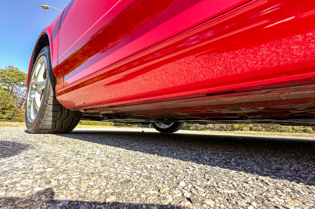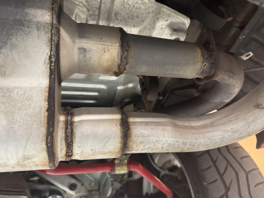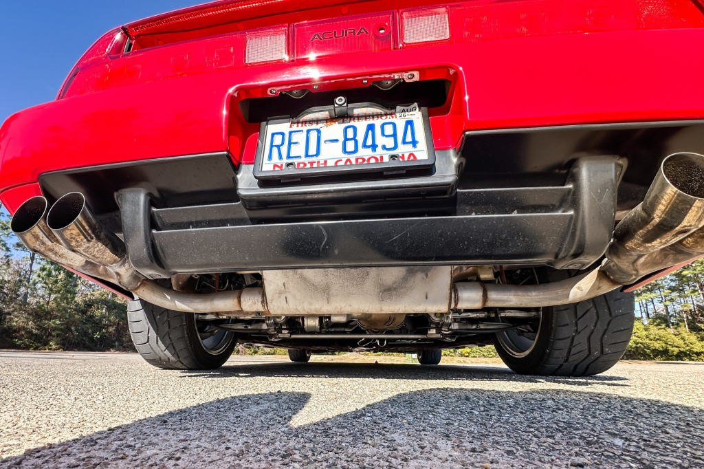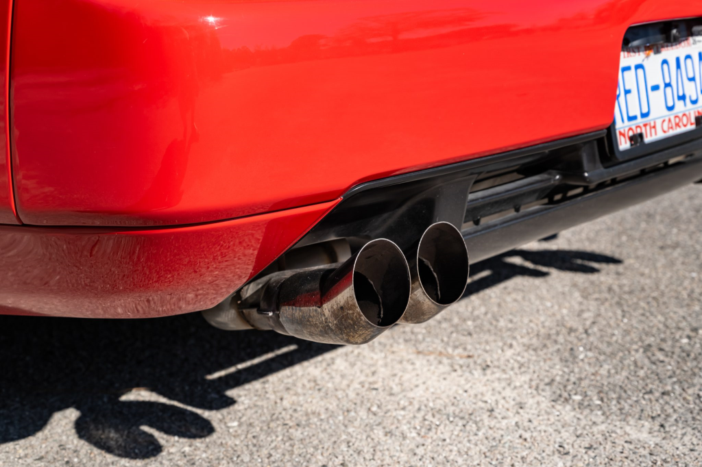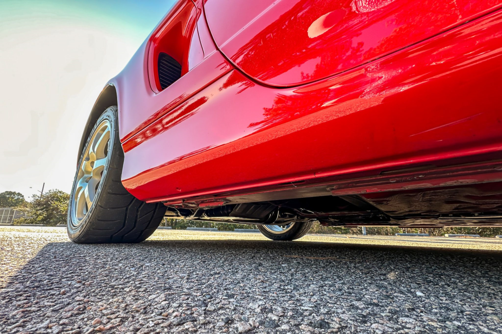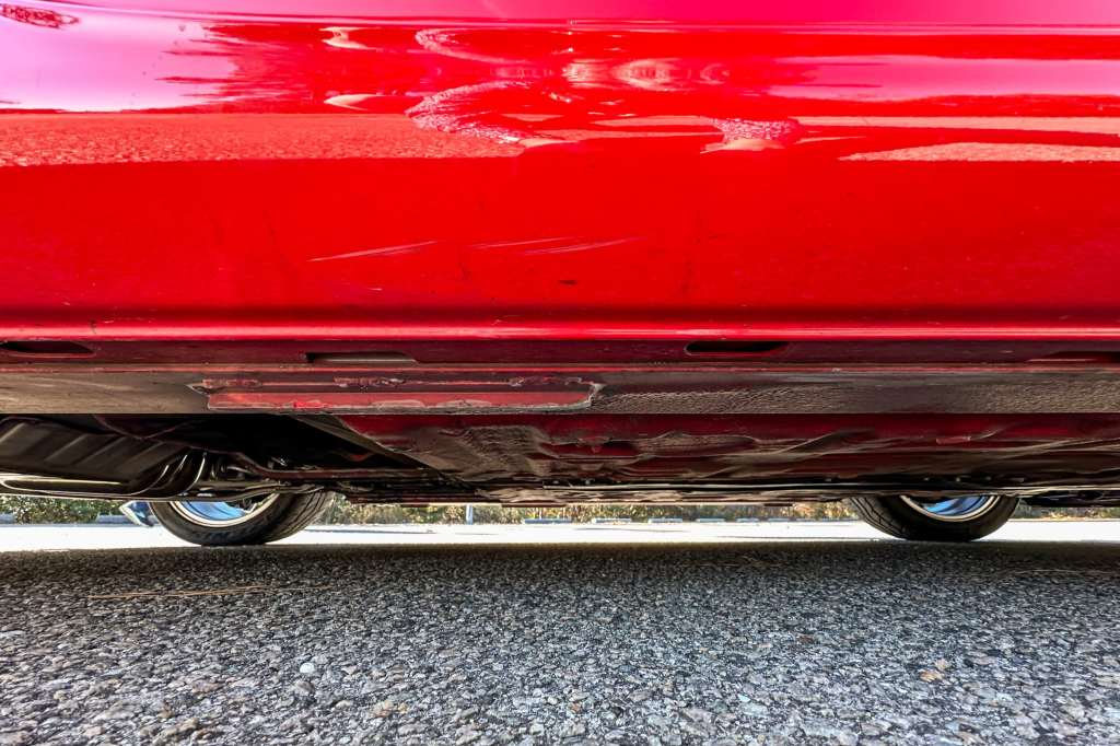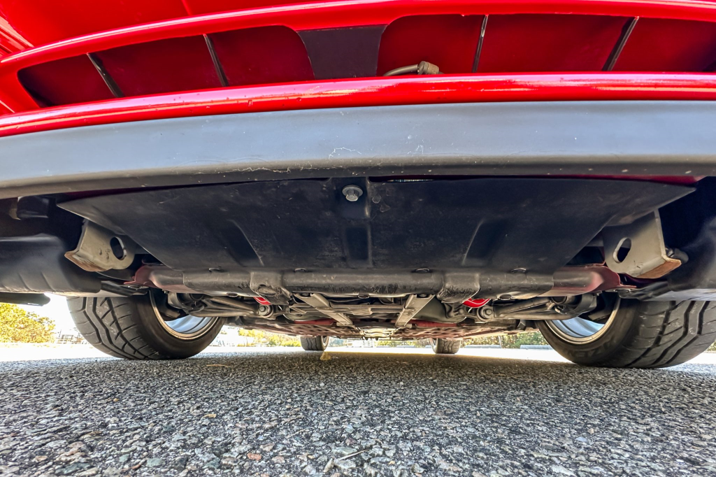 Power is routed to the rear wheels via a five-speed manual transaxle and a limited-slip differential. A photo showing transaxle serial number J4A4-1001540 is provided in the prior listing, indicating that the unit falls outside the snap ring failure range. The clutch was replaced in 2020, and the CV axle boots were serviced under current ownership according to the seller. An aftermarket exhaust system and headers were installed under prior ownership.