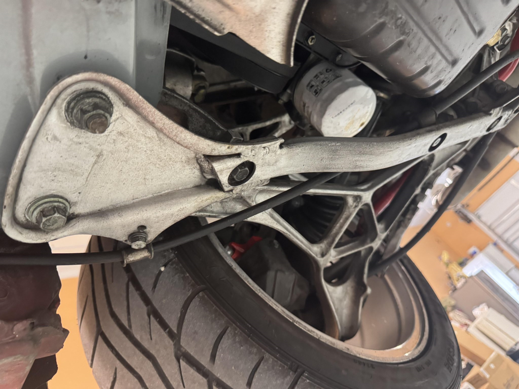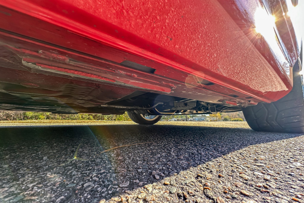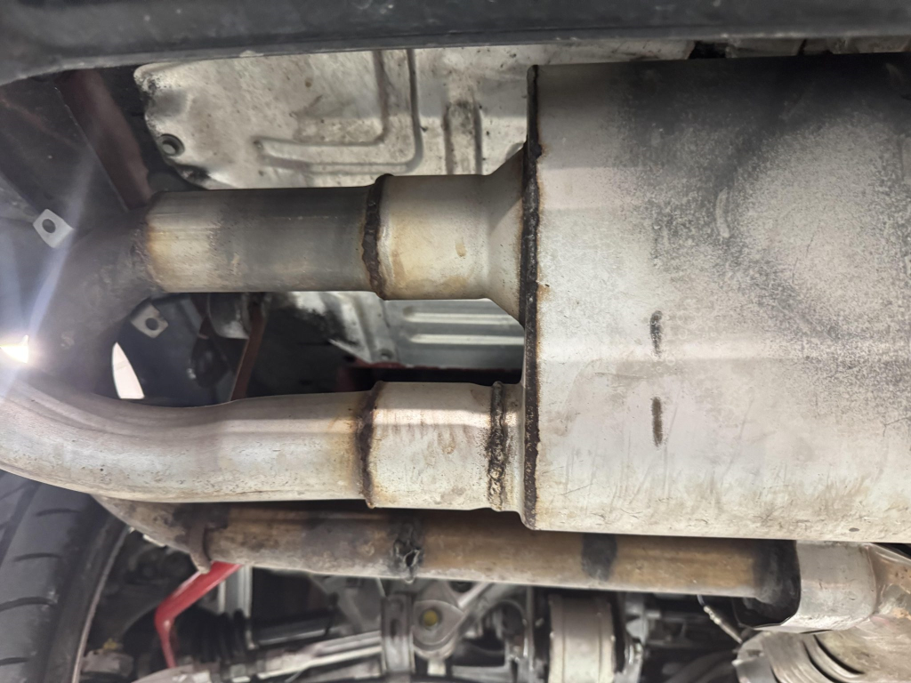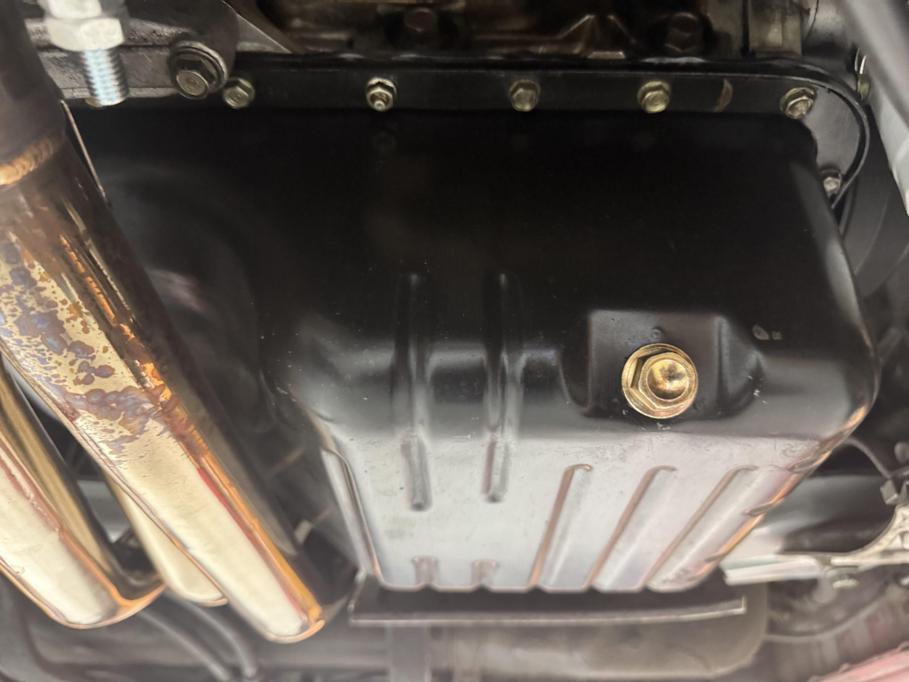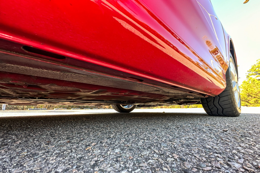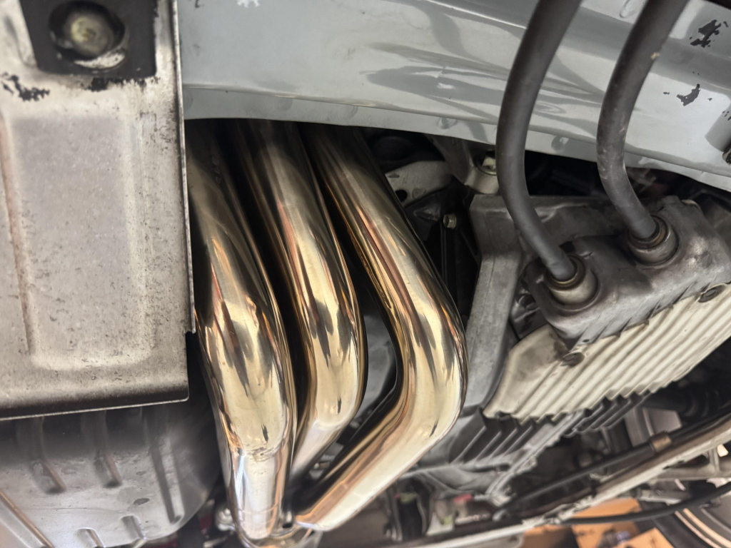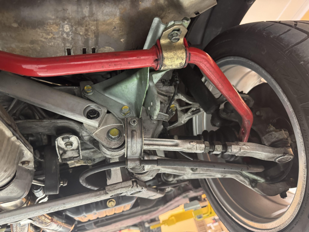 Power is routed to the rear wheels via a five-speed manual transaxle and a limited-slip differential. A photo showing transaxle serial number J4A4-1001540 is provided in the prior listing, indicating that the unit falls outside the snap ring failure range. The clutch was replaced in 2020, and the CV axle boots were serviced under current ownership according to the seller. An aftermarket exhaust system and headers were installed under prior ownership.