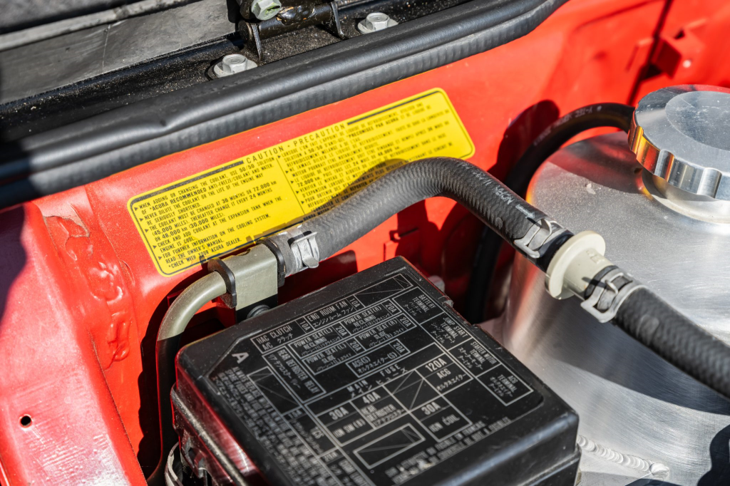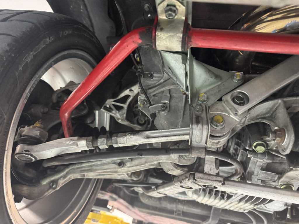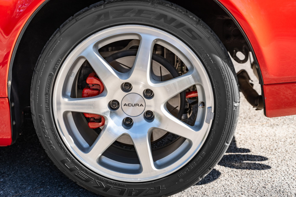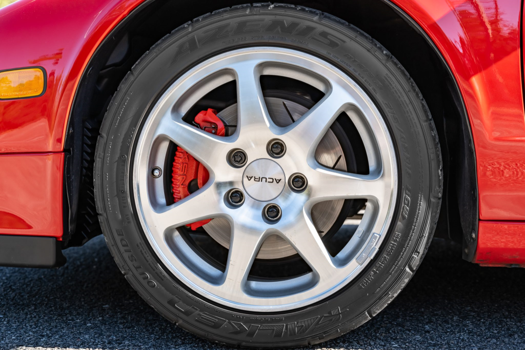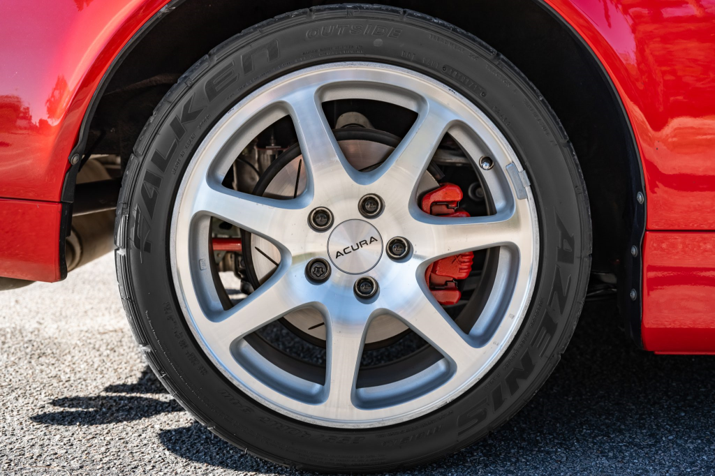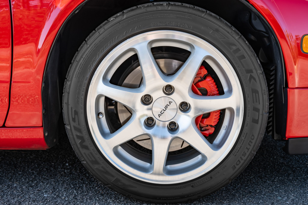 NA2-specification 16” and 17” seven-spoke aluminum wheels are mounted with Falken Azenis tires measuring 215/45 up front and 255/40 out back. The car features a four-wheel double-wishbone suspension and aftermarket front and rear stabilizer bars. A reported NA2-specification ABS system was installed under previous ownership, and work since 2022 included rebuilding the red NSX-branded brake calipers and installing Stop Tech slotted rotors and braided lines as well as a replacement steering rack bushing.