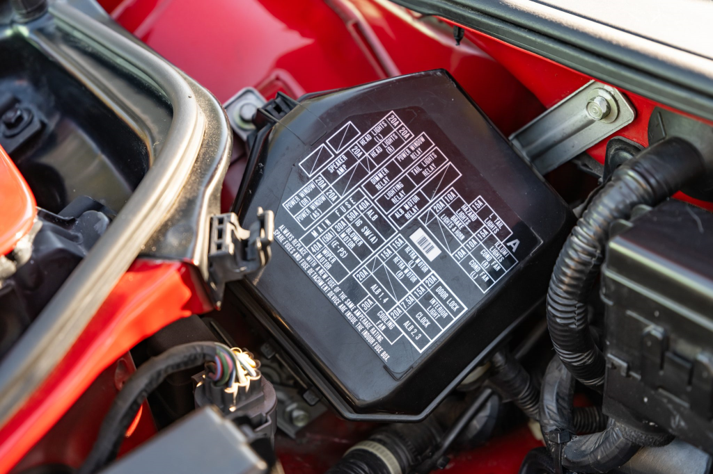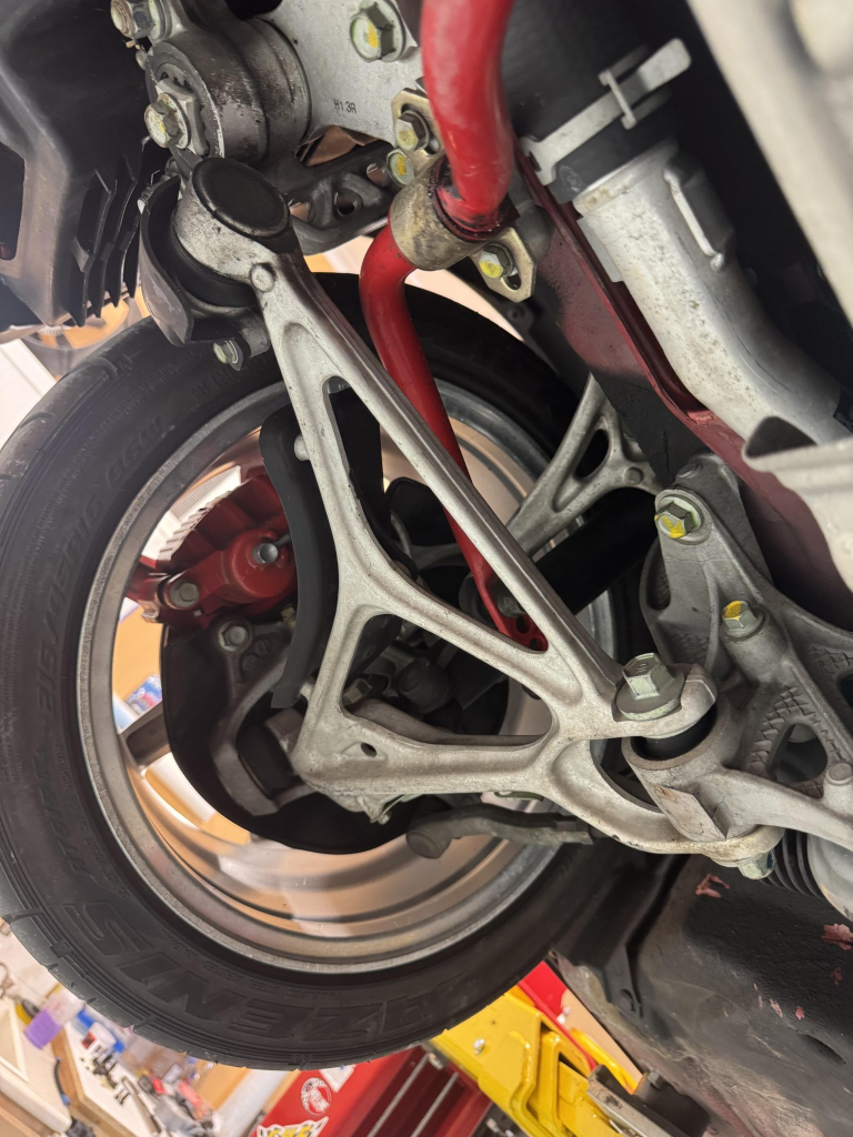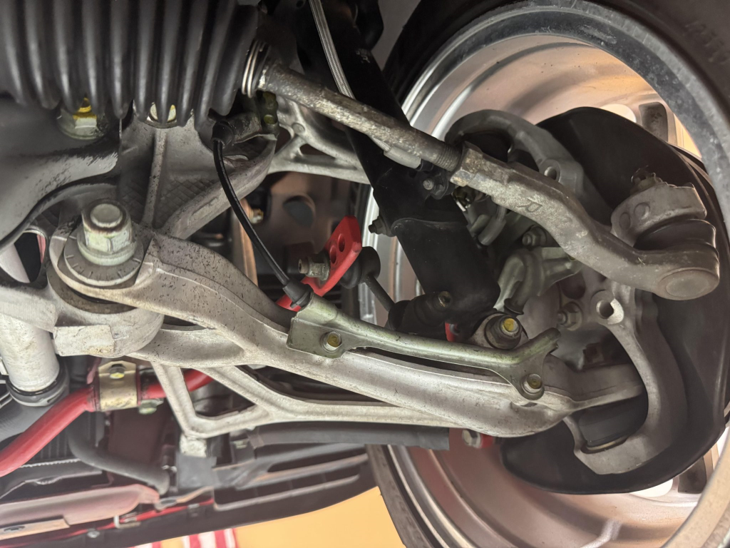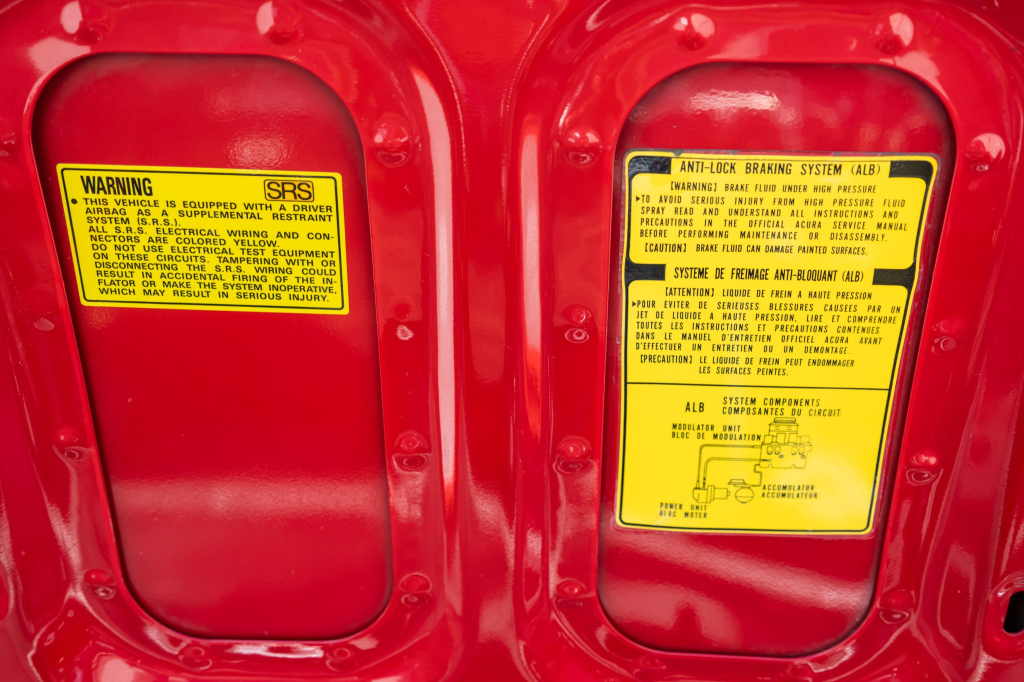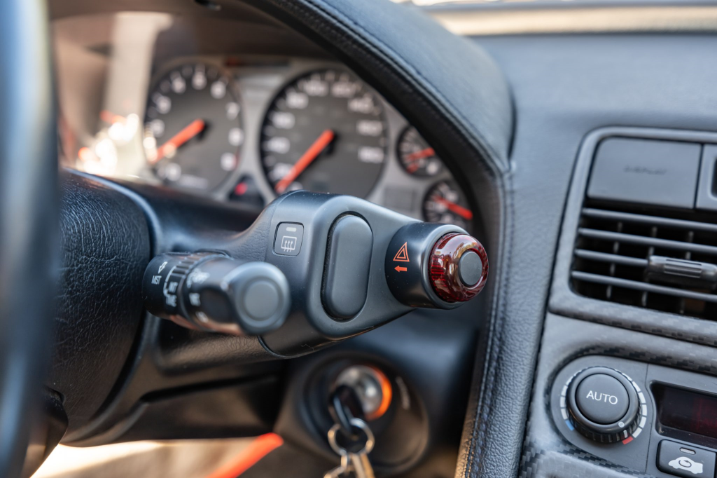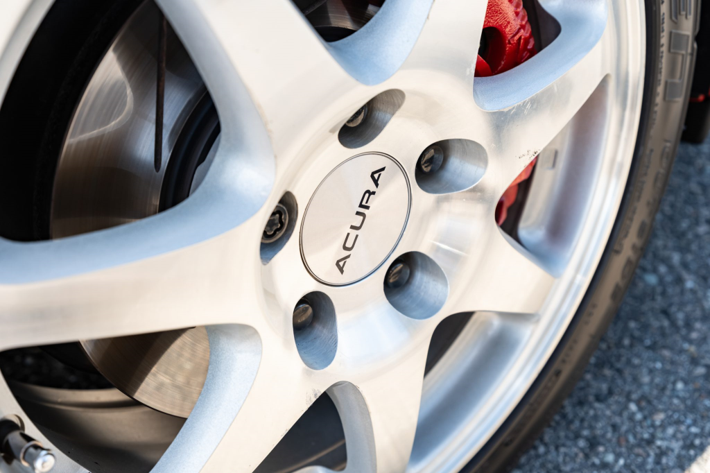 NA2-specification 16” and 17” seven-spoke aluminum wheels are mounted with Falken Azenis tires measuring 215/45 up front and 255/40 out back. The car features a four-wheel double-wishbone suspension and aftermarket front and rear stabilizer bars. A reported NA2-specification ABS system was installed under previous ownership, and work since 2022 included rebuilding the red NSX-branded brake calipers and installing Stop Tech slotted rotors and braided lines as well as a replacement steering rack bushing.