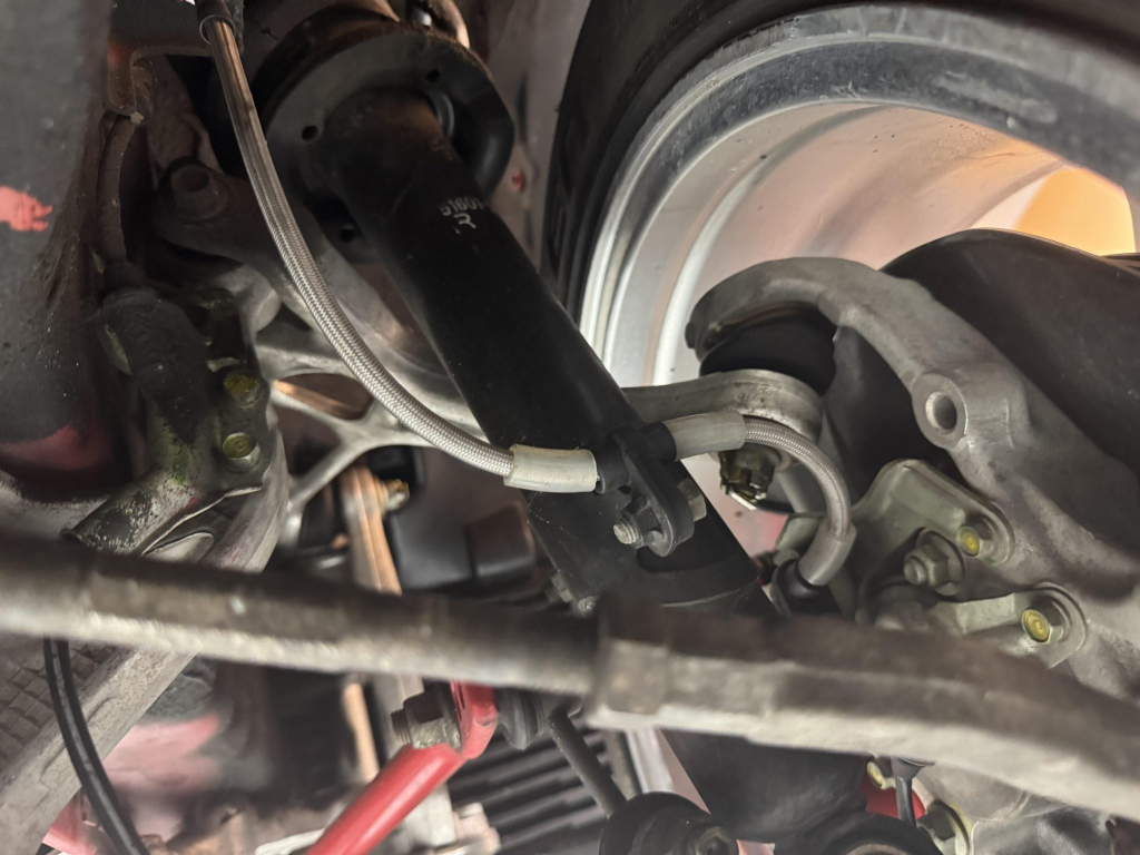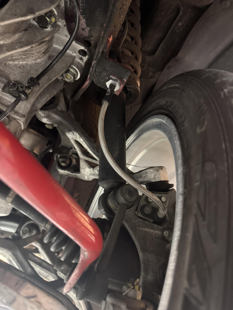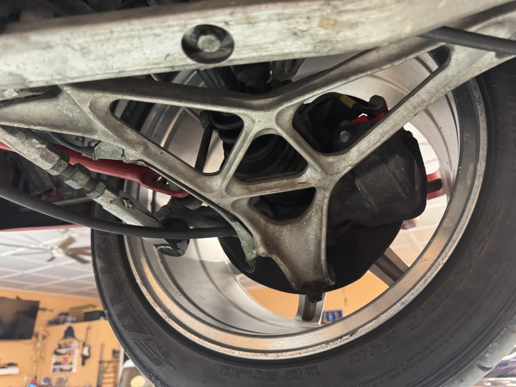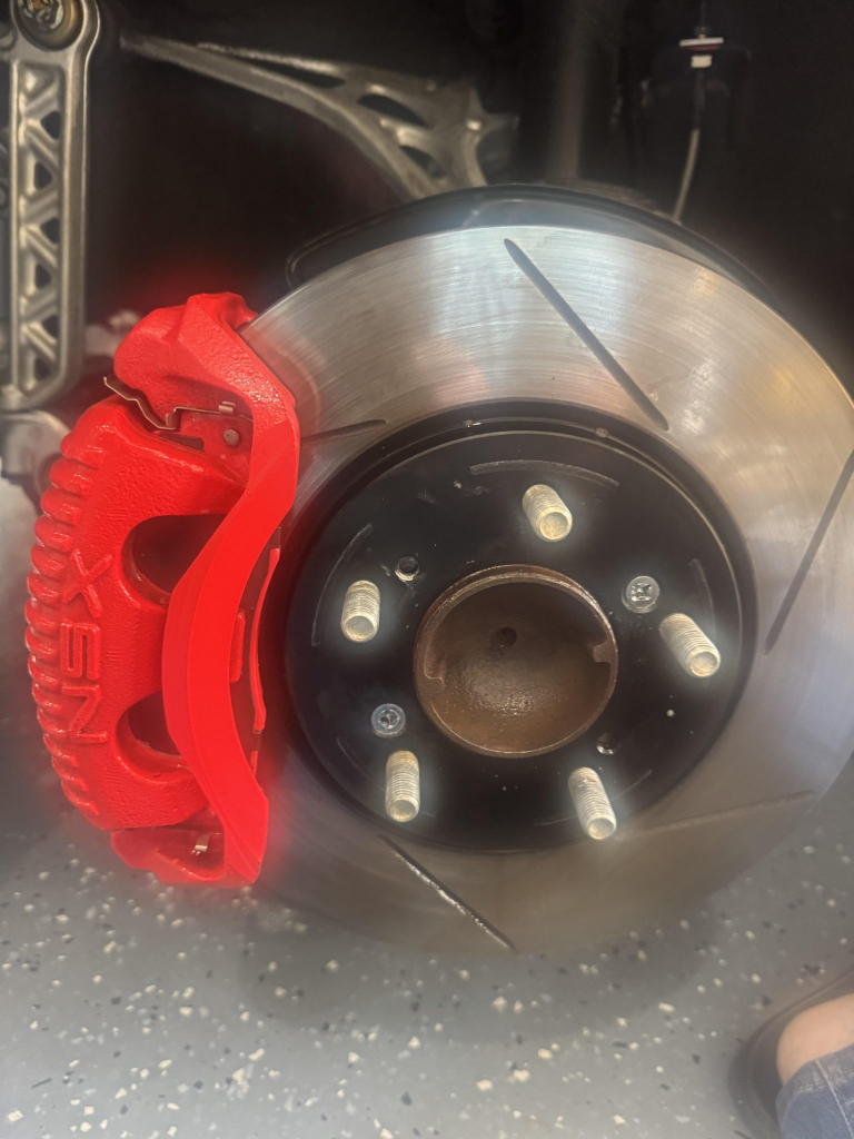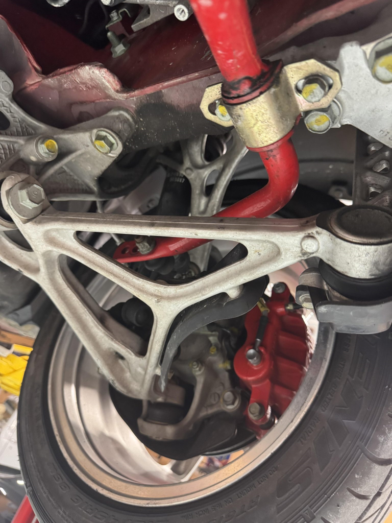 NA2-specification 16” and 17” seven-spoke aluminum wheels are mounted with Falken Azenis tires measuring 215/45 up front and 255/40 out back. The car features a four-wheel double-wishbone suspension and aftermarket front and rear stabilizer bars. A reported NA2-specification ABS system was installed under previous ownership, and work since 2022 included rebuilding the red NSX-branded brake calipers and installing Stop Tech slotted rotors and braided lines as well as a replacement steering rack bushing.