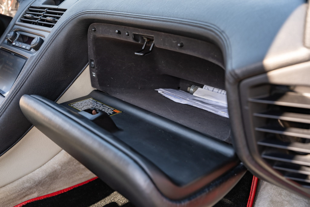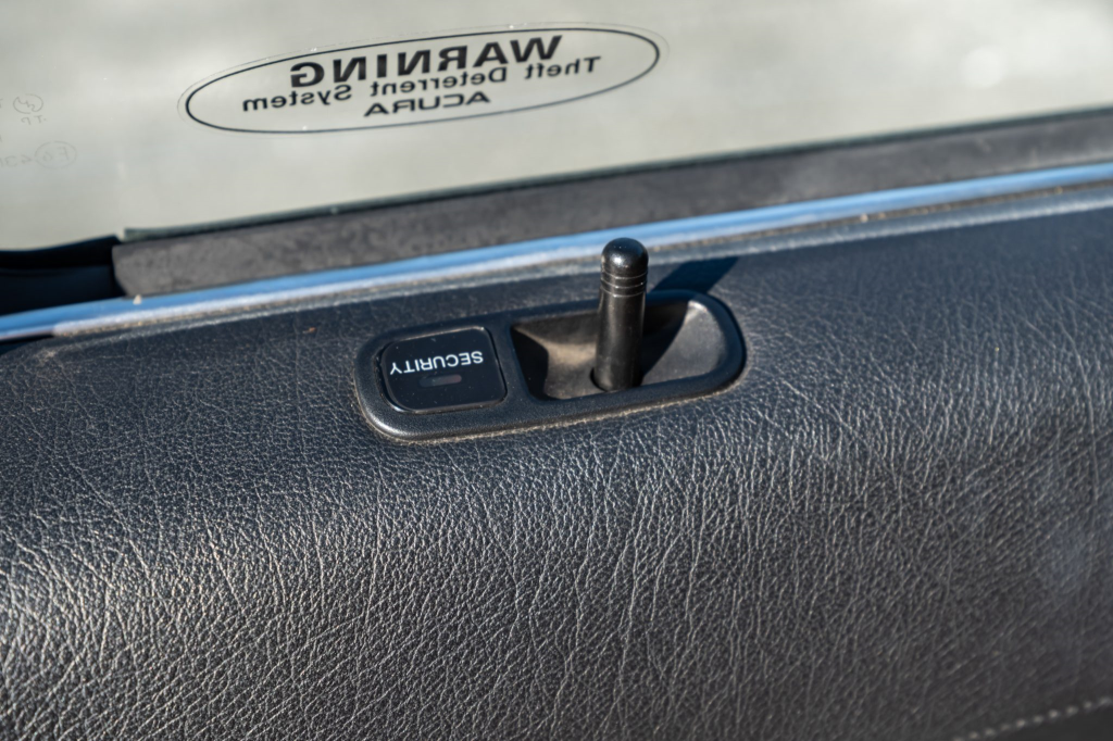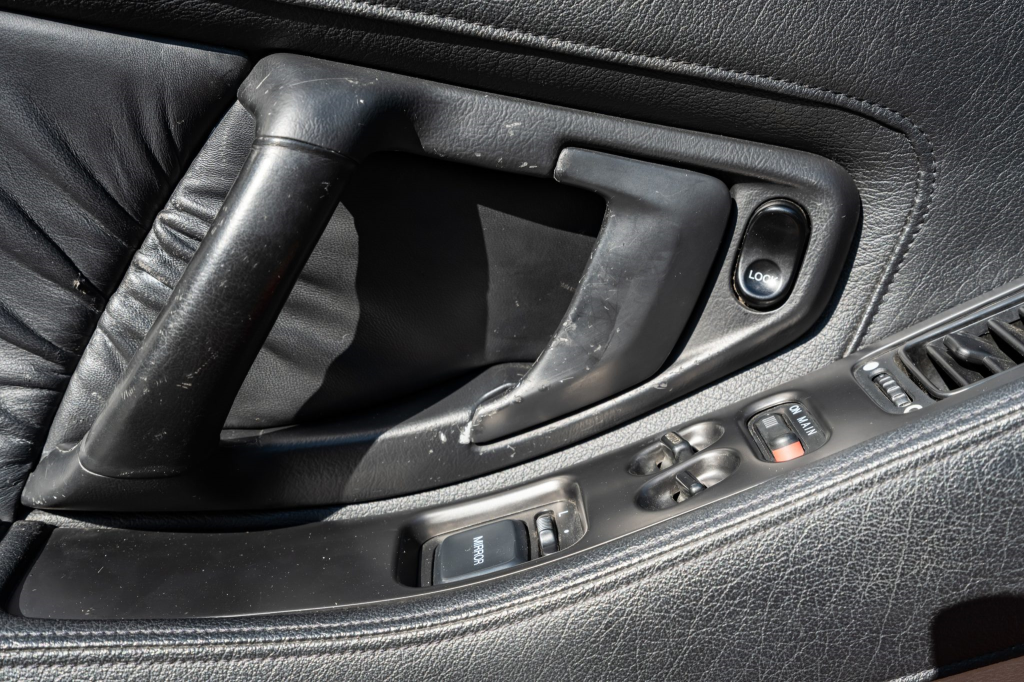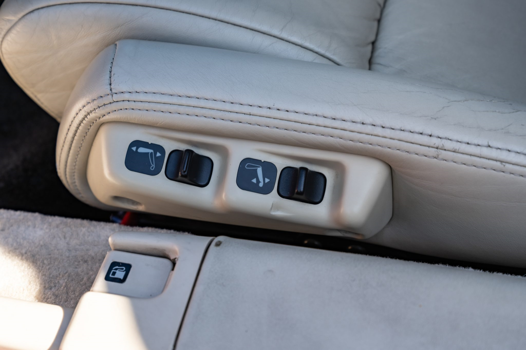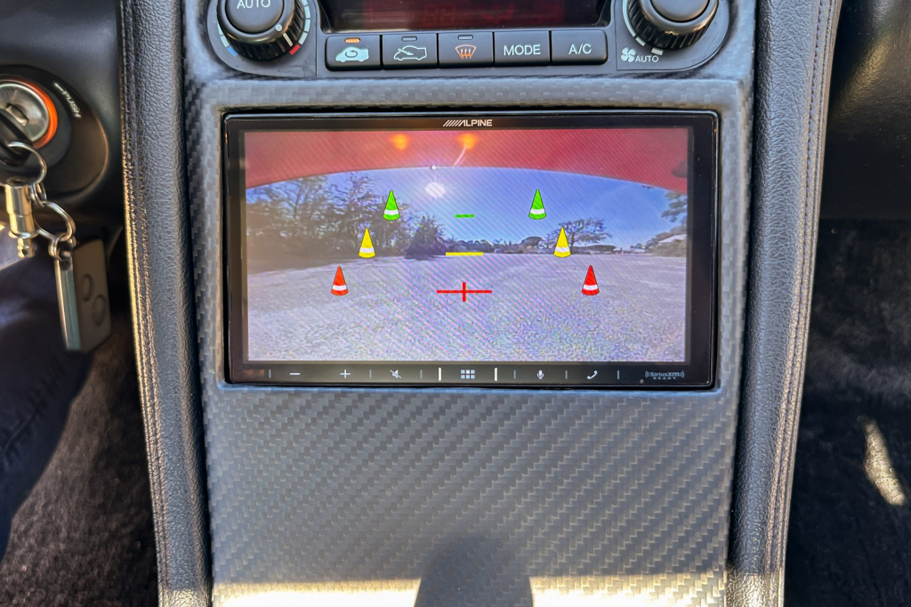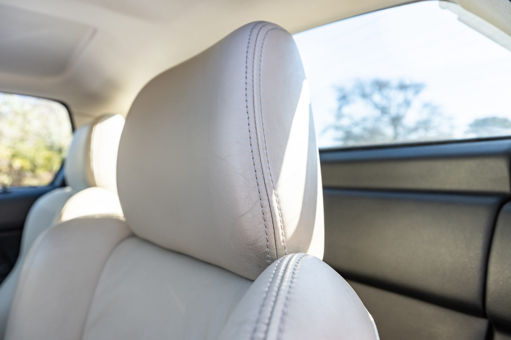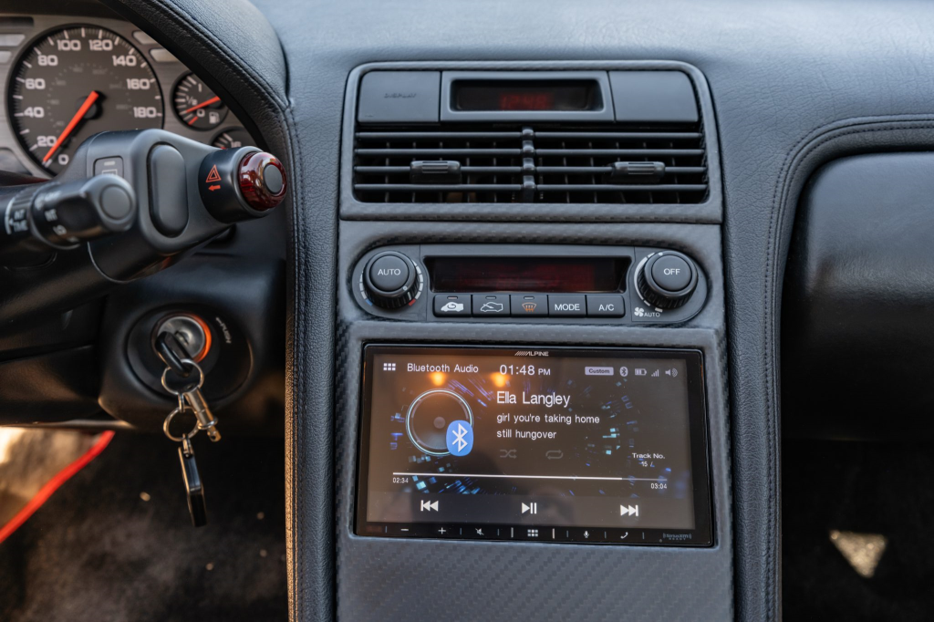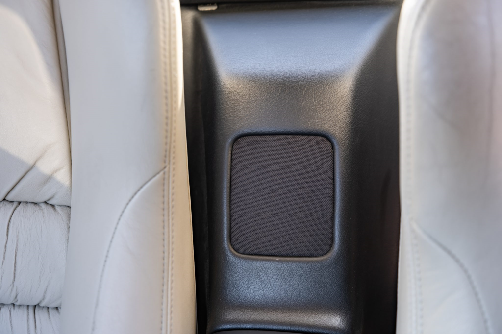 The cabin features power-adjustable sport seats upholstered in Ivory leather, while black leather covers the dashboard as well as the upper center console and door surfaces. The stainless-steel door sill plates are stamped with the car’s serial number, and automatic climate control and cruise control are additional elements. Noted modifications installed since 2022 include a EuroBoutique carbon-fiber double-DIN dash panel with a satin gloss carbon-fiber A/C vent frame as well as a ScienceofSpeed Type-S-style shift knob, a mesh shift boot, a Hertz amplifier, a JL Audio subwoofer, a custom Angus 10″ subwoofer under the passenger-side floor, and an Alpine head unit linked to a rearview camera. The seller reports the window regulators were replaced in 2022. A noise from the climate-control system is noted upon start-up.