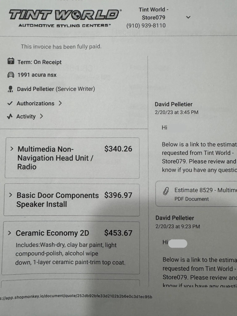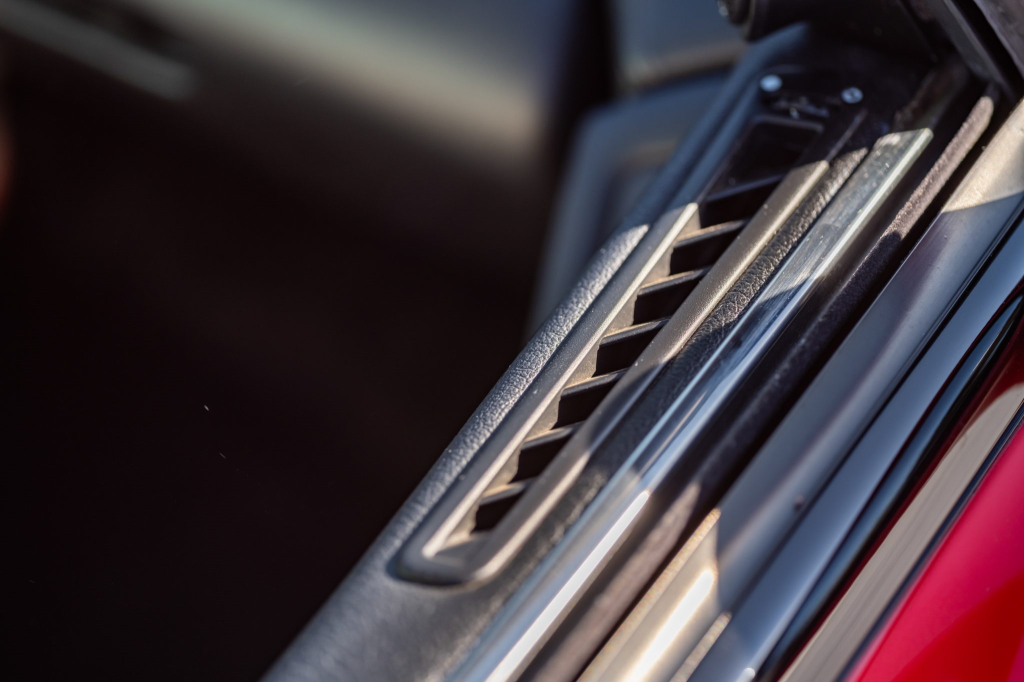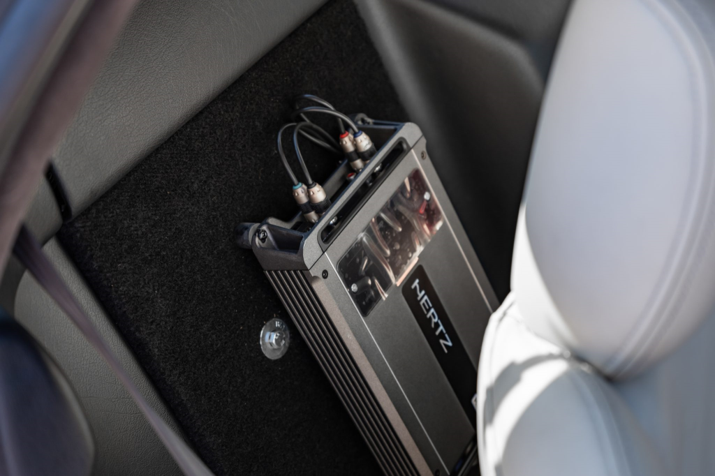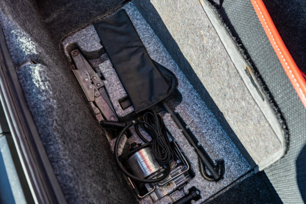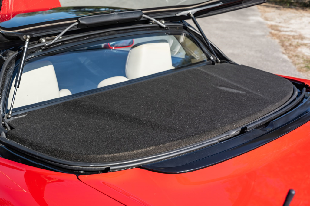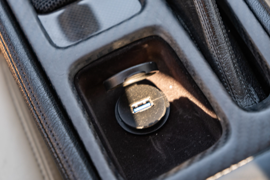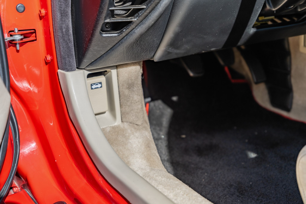 The cabin features power-adjustable sport seats upholstered in Ivory leather, while black leather covers the dashboard as well as the upper center console and door surfaces. The stainless-steel door sill plates are stamped with the car’s serial number, and automatic climate control and cruise control are additional elements. Noted modifications installed since 2022 include a EuroBoutique carbon-fiber double-DIN dash panel with a satin gloss carbon-fiber A/C vent frame as well as a ScienceofSpeed Type-S-style shift knob, a mesh shift boot, a Hertz amplifier, a JL Audio subwoofer, a custom Angus 10″ subwoofer under the passenger-side floor, and an Alpine head unit linked to a rearview camera. The seller reports the window regulators were replaced in 2022. A noise from the climate-control system is noted upon start-up.