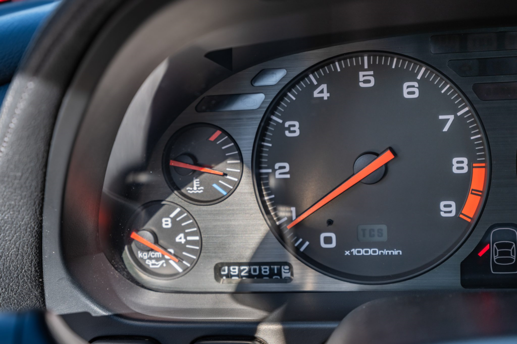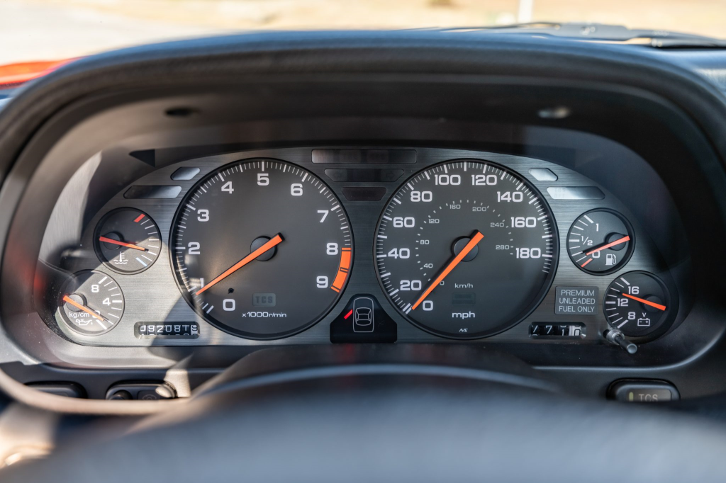 The leather-wrapped steering wheel frames a tachometer with an 8,000-rpm redline, a 188-mph speedometer, and gauges for coolant temperature, voltage, fuel level, and oil pressure, the latter of which was replaced under current ownership. The six-digit odometer shows 92k miles, approximately 4k of which were added under current ownership.