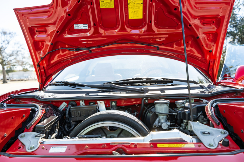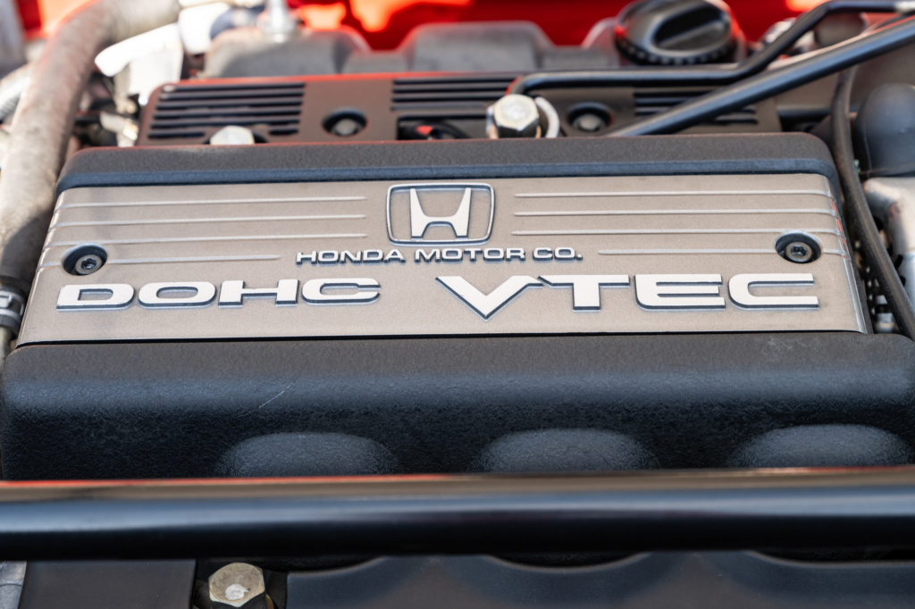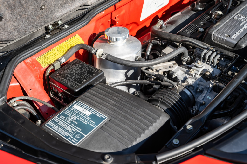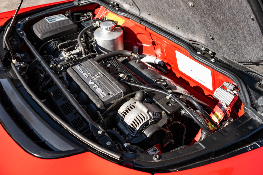 The mid-mounted 3.0-liter V6 features VTEC variable valve timing and was factory rated at 270 horsepower and 210 lb-ft of torque. A Dali Racing aluminum coolant tank and cap have been installed along with a Koyorad radiator. Work in 2025 included performing a valve job, resurfacing the cylinder heads, and installing ARP head studs, a rebuilt starter, and a ScienceofSpeed lost motion assembly kit. The following components were replaced at that time: