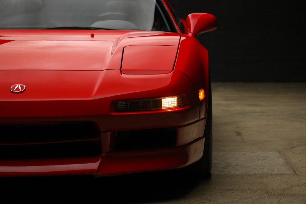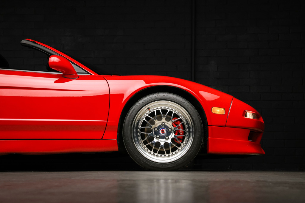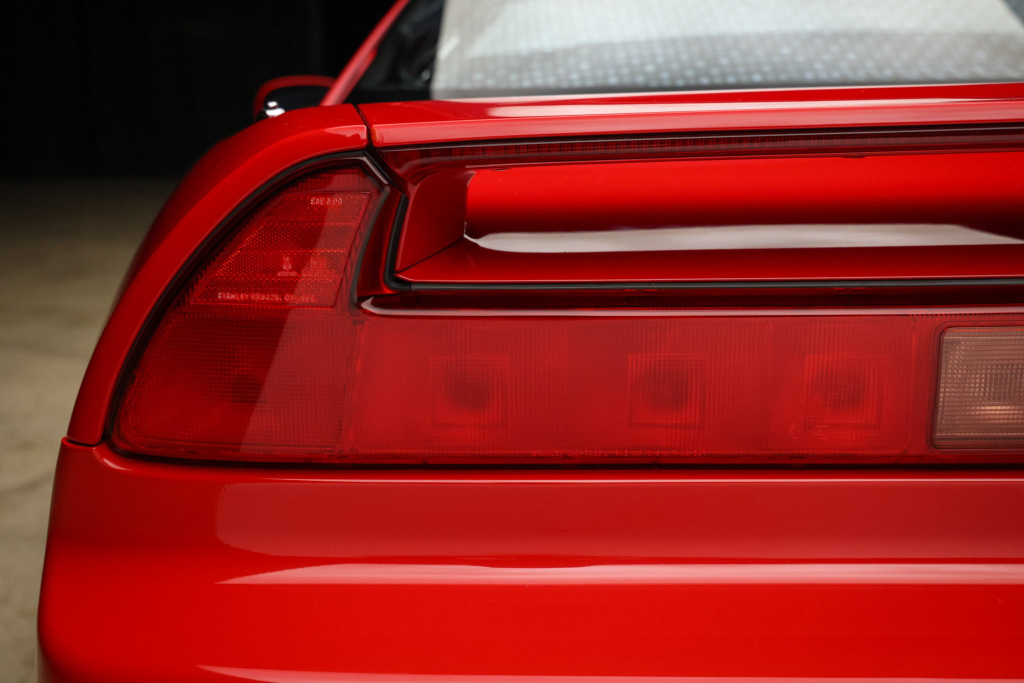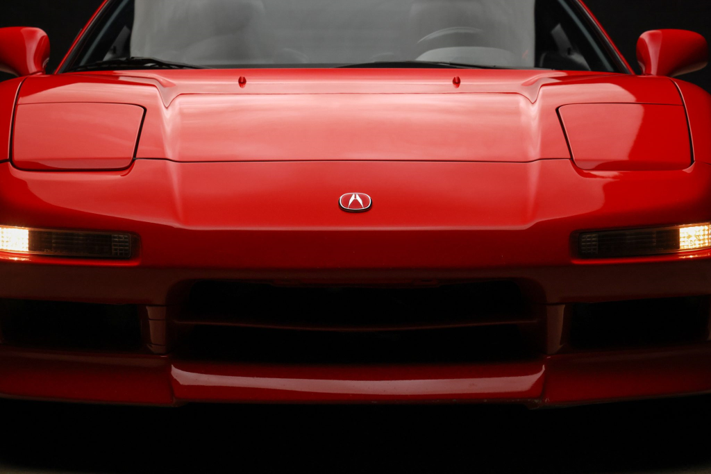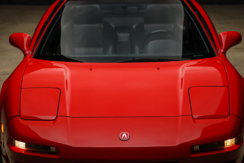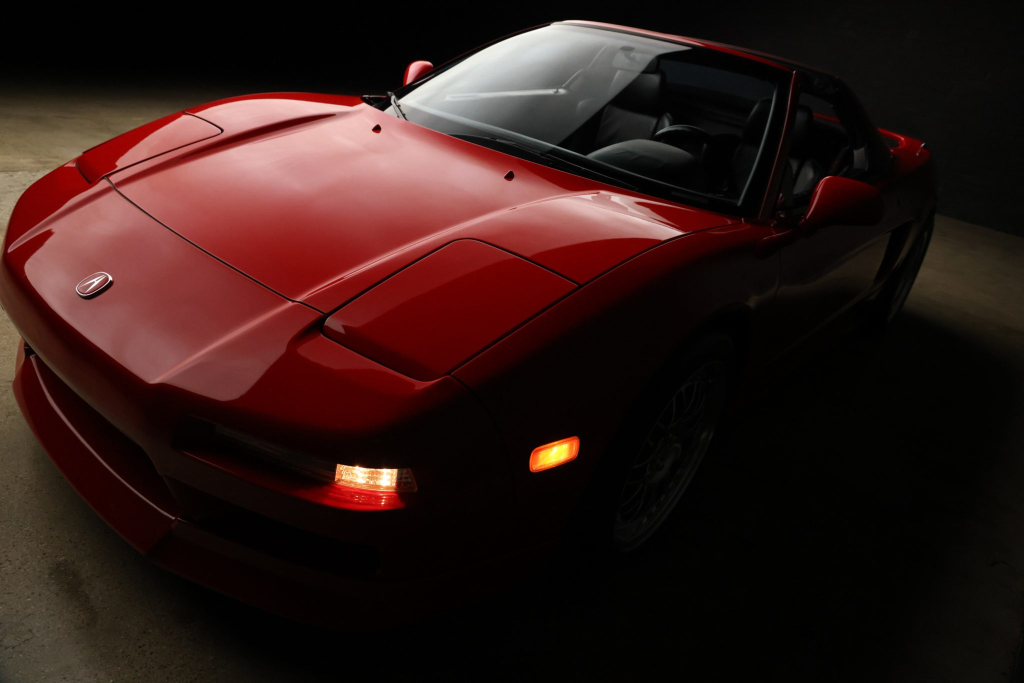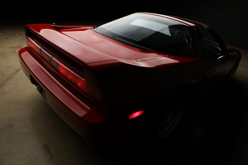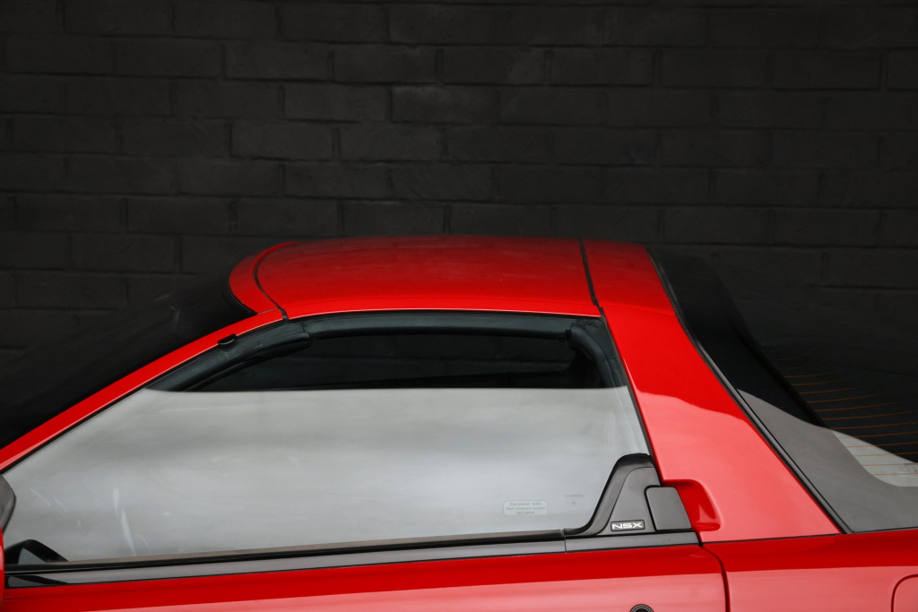 The NSX featured aluminum bodywork, and this example is finished in Formula Red with a body-color removable roof panel. Features include pop-up headlights, an integrated rear wing, side air intakes, power-adjustable side mirrors, and dual exhaust outlets. Scuffs are located on the underside of the front spoiler, and imperfections are highlighted in the gallery.