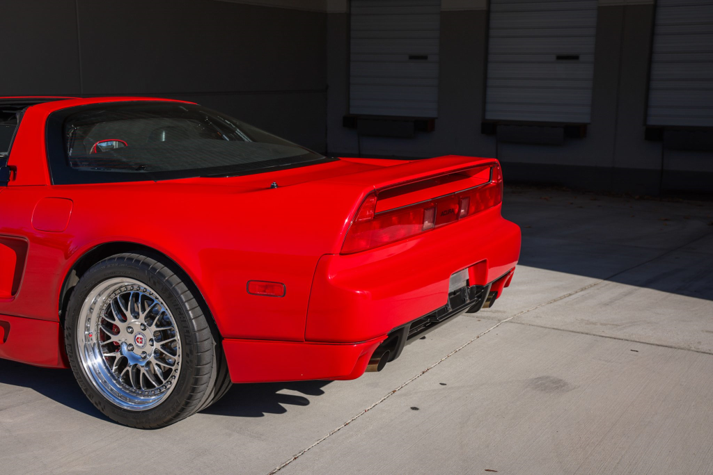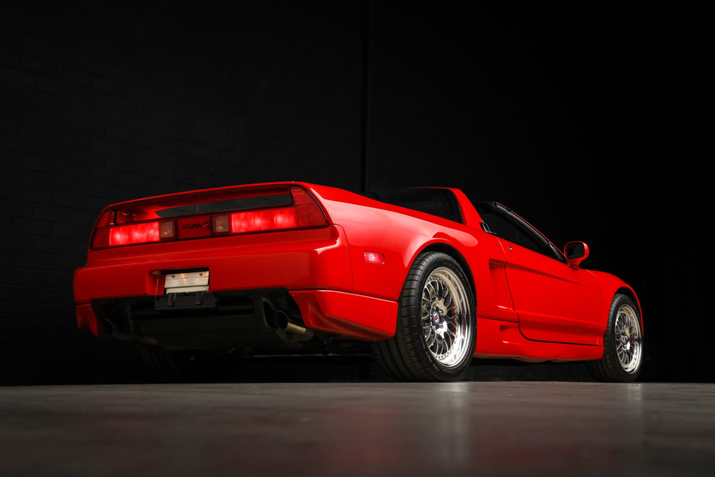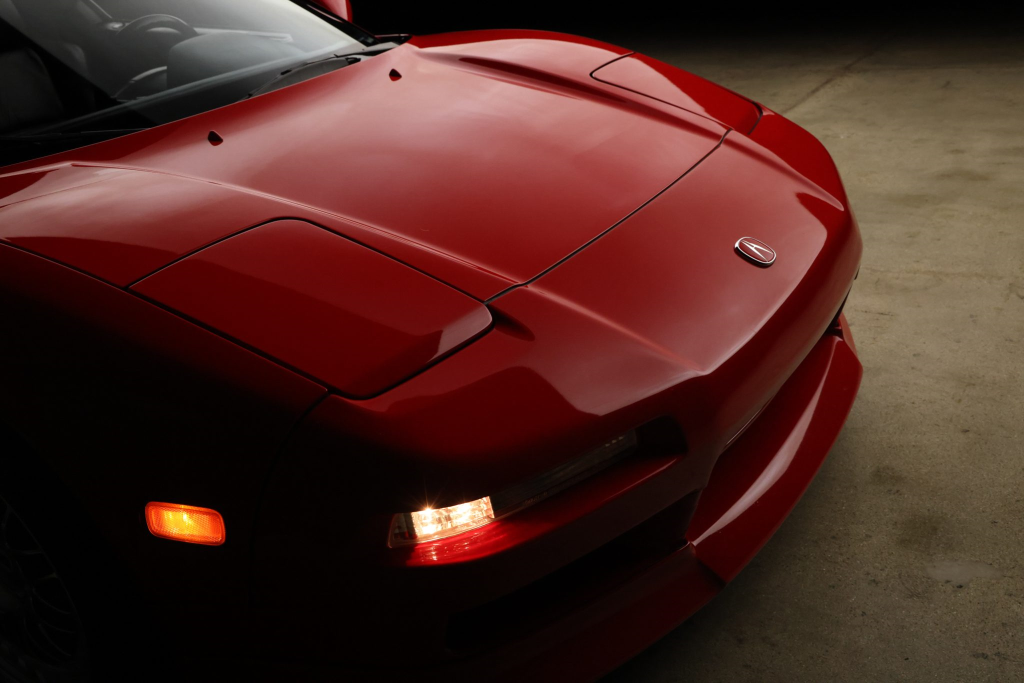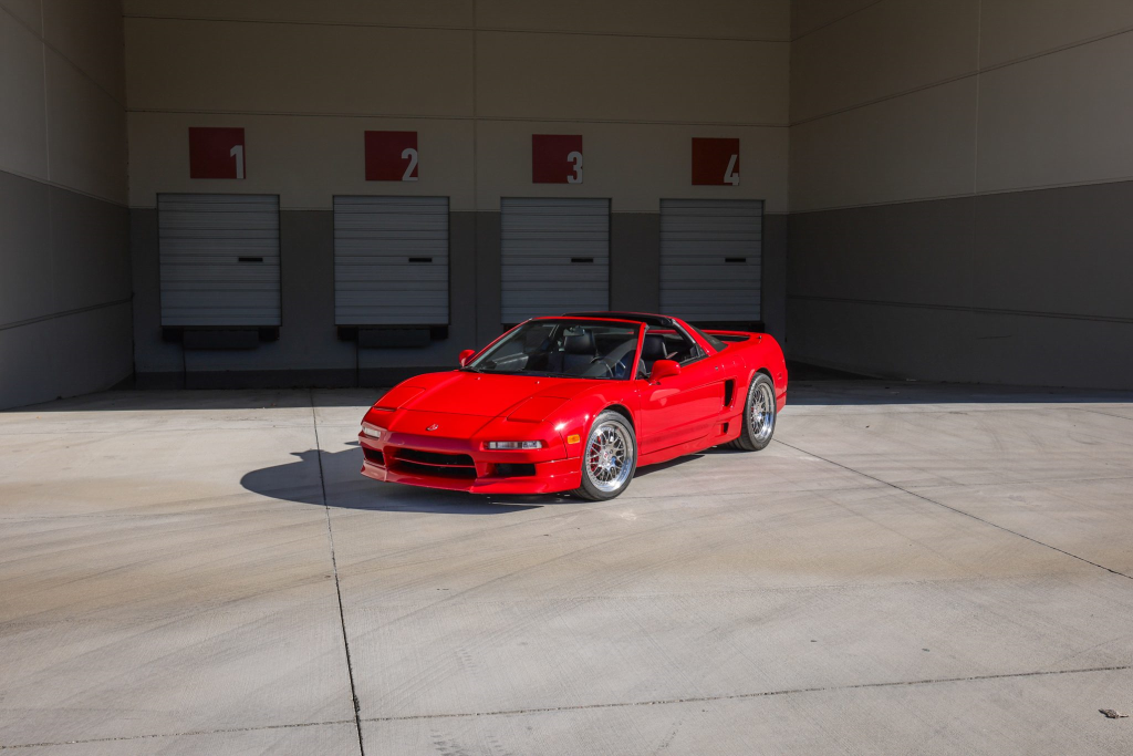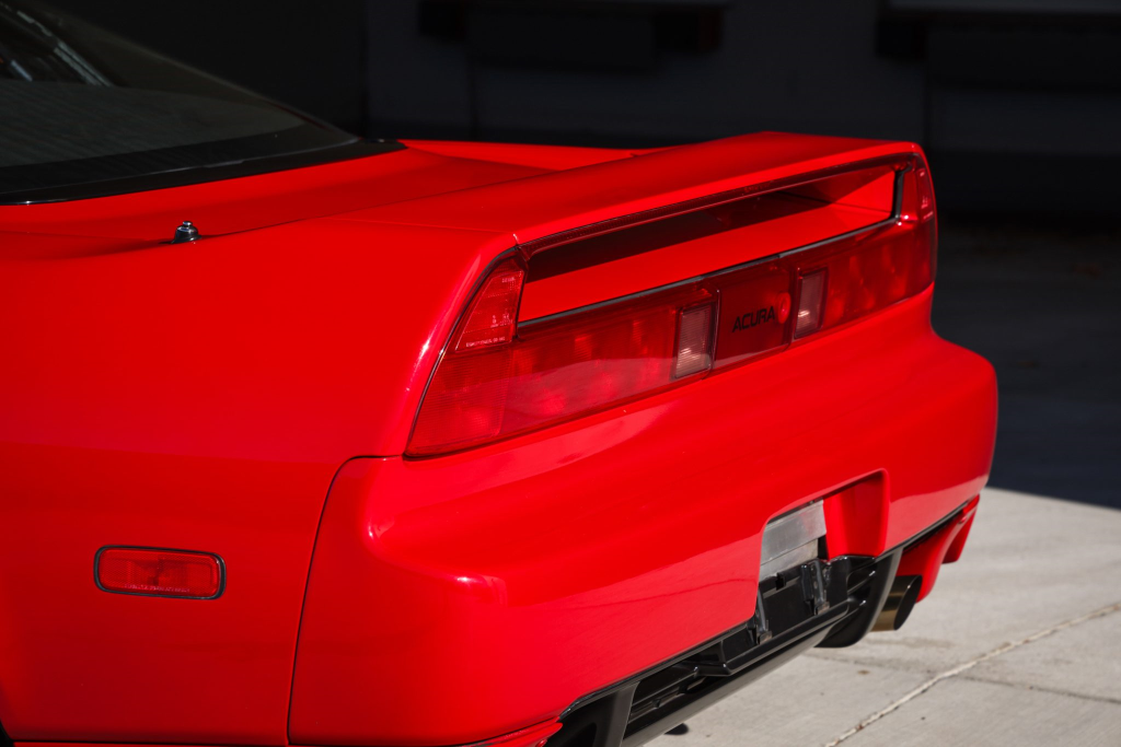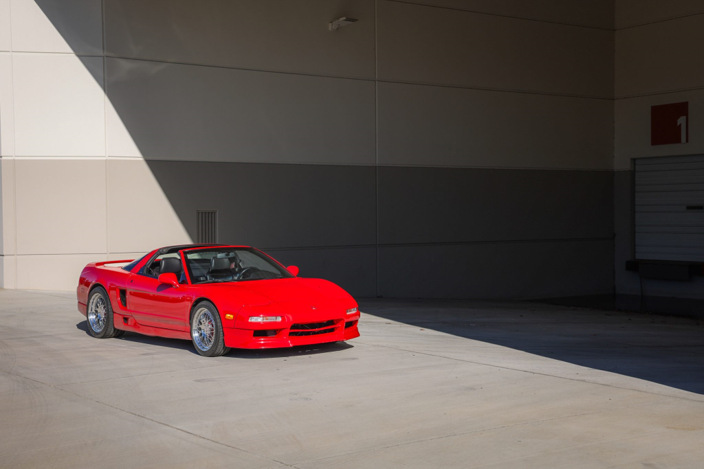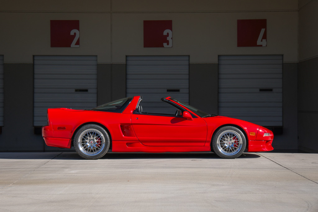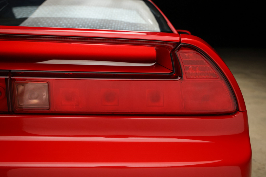 The NSX featured aluminum bodywork, and this example is finished in Formula Red with a body-color removable roof panel. Features include pop-up headlights, an integrated rear wing, side air intakes, power-adjustable side mirrors, and dual exhaust outlets. Scuffs are located on the underside of the front spoiler, and imperfections are highlighted in the gallery.