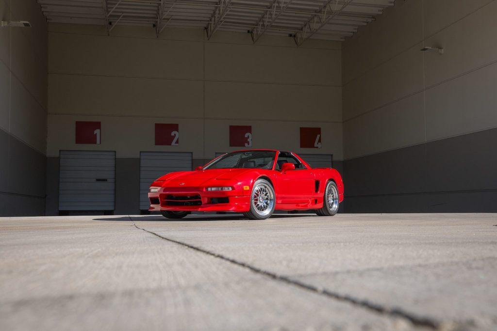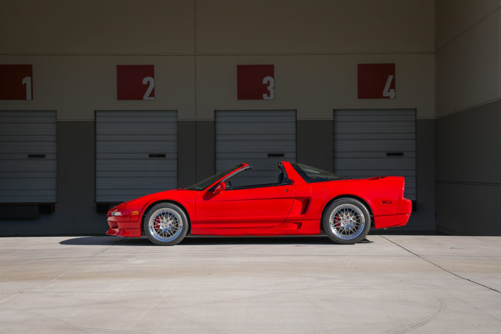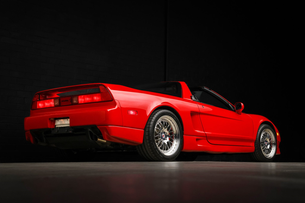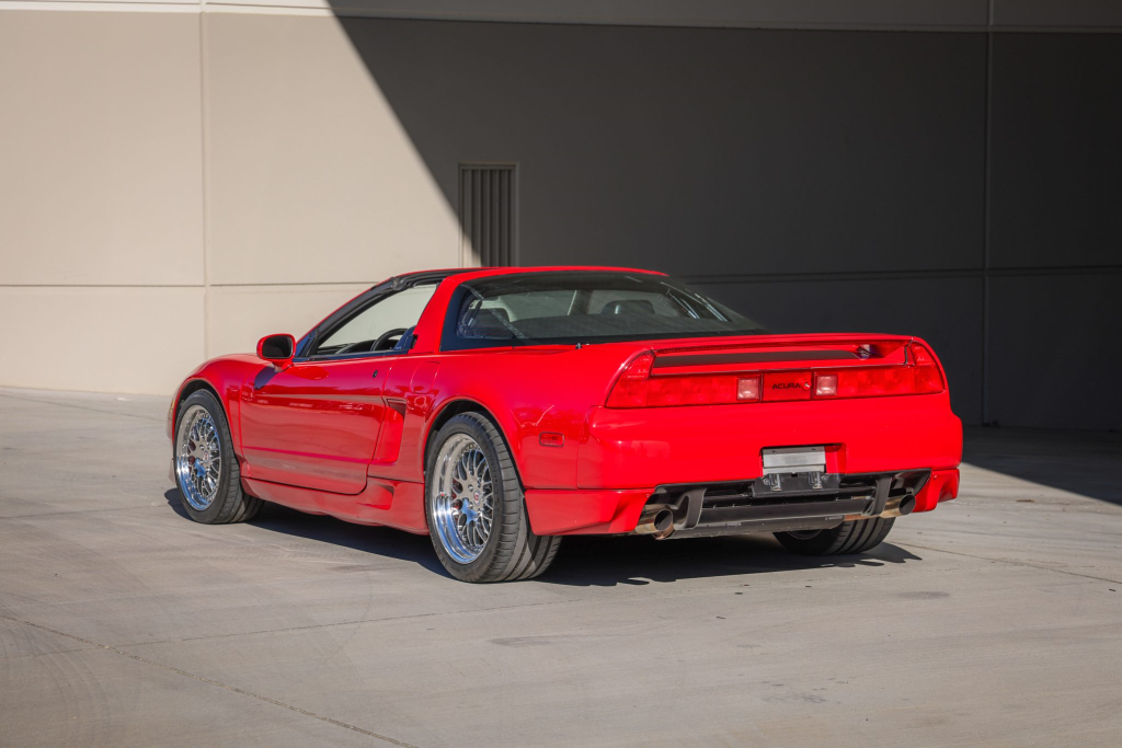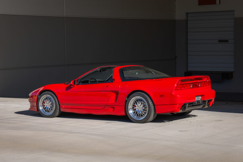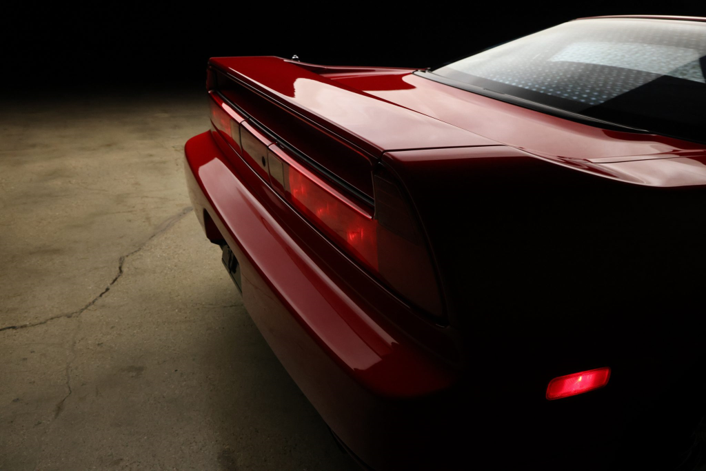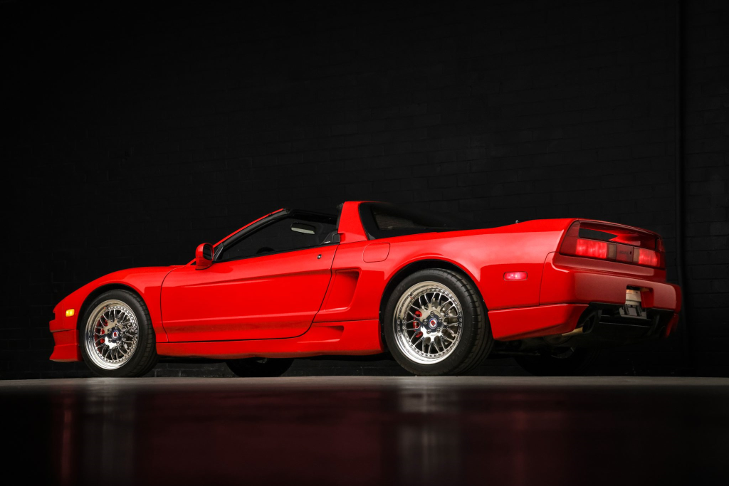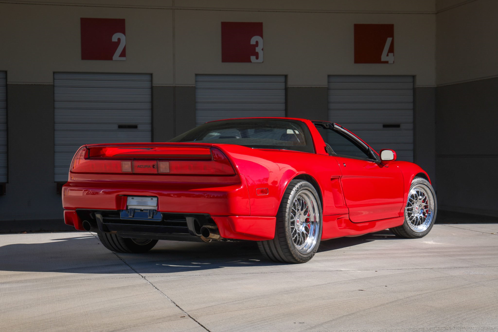 The NSX featured aluminum bodywork, and this example is finished in Formula Red with a body-color removable roof panel. Features include pop-up headlights, an integrated rear wing, side air intakes, power-adjustable side mirrors, and dual exhaust outlets. Scuffs are located on the underside of the front spoiler, and imperfections are highlighted in the gallery.