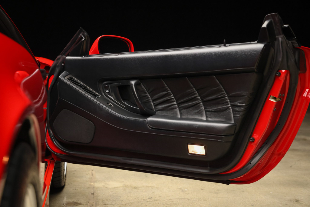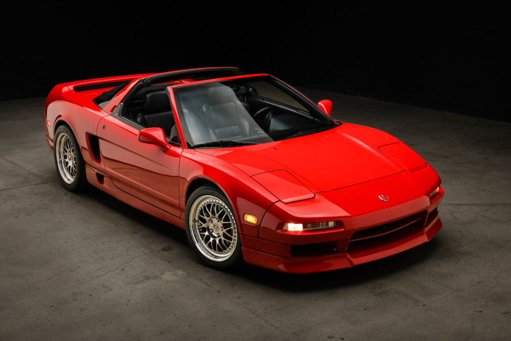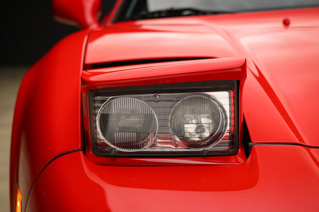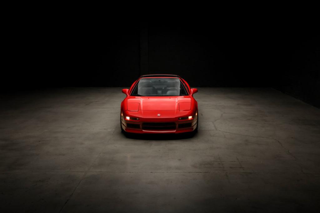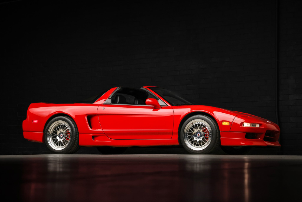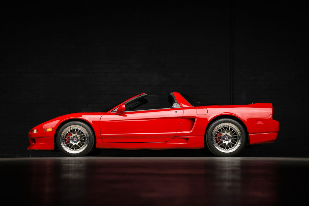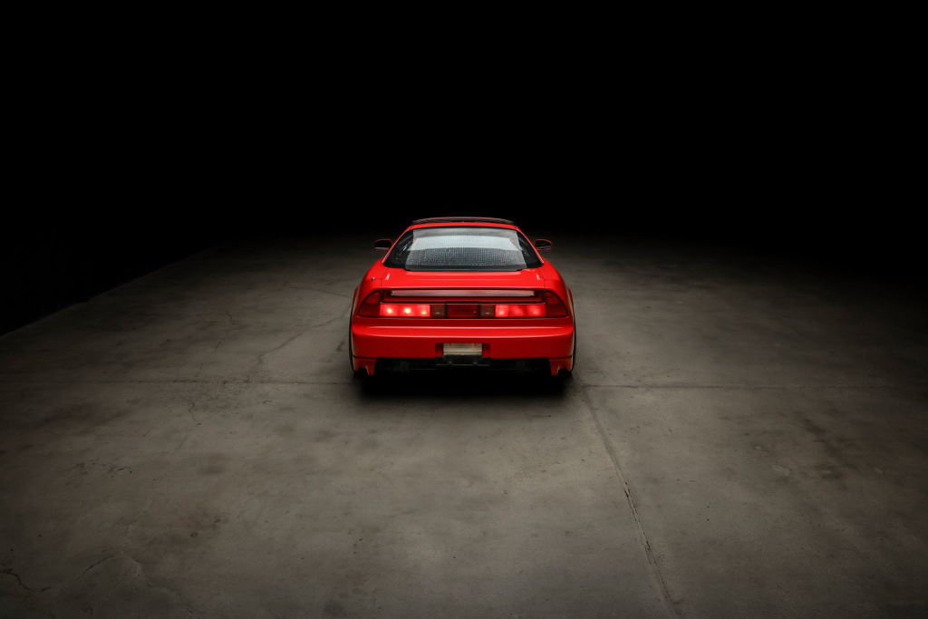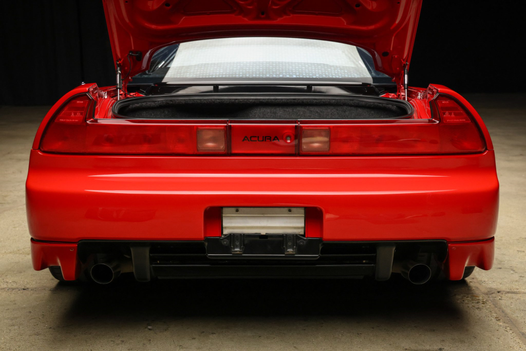 The NSX featured aluminum bodywork, and this example is finished in Formula Red with a body-color removable roof panel. Features include pop-up headlights, an integrated rear wing, side air intakes, power-adjustable side mirrors, and dual exhaust outlets. Scuffs are located on the underside of the front spoiler, and imperfections are highlighted in the gallery.