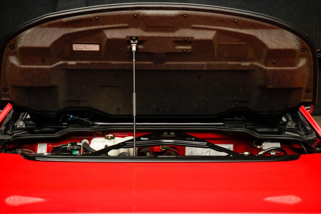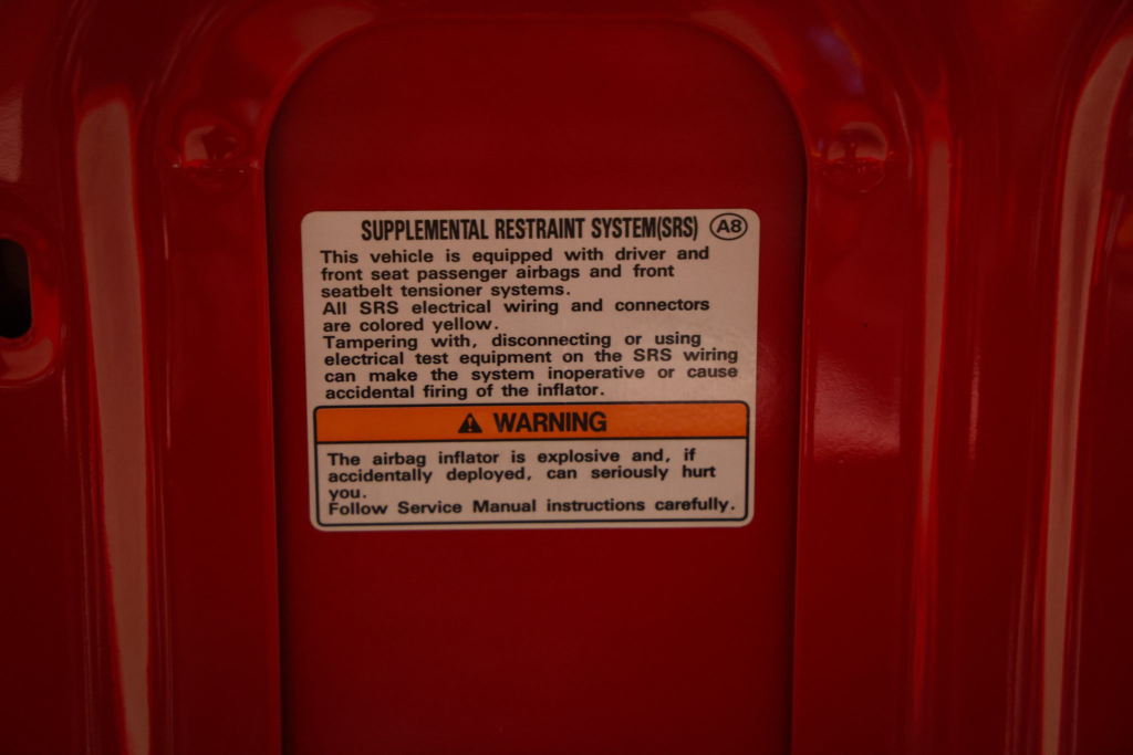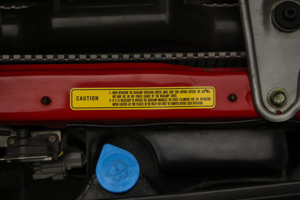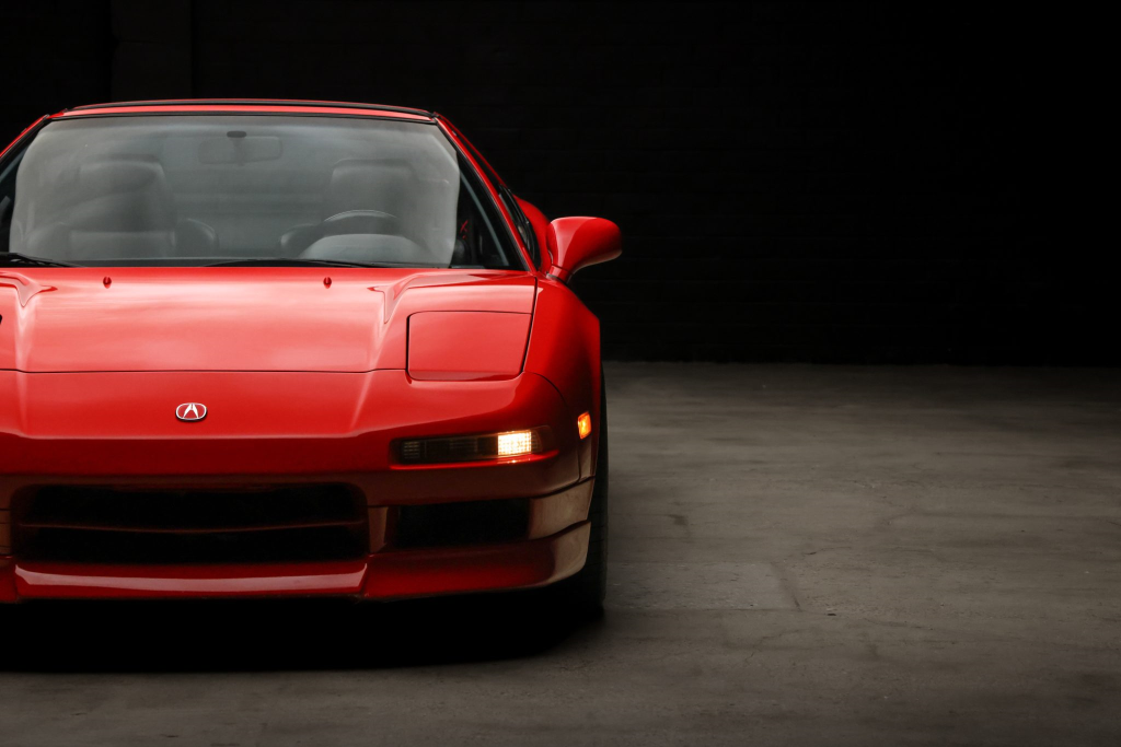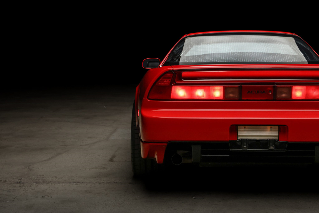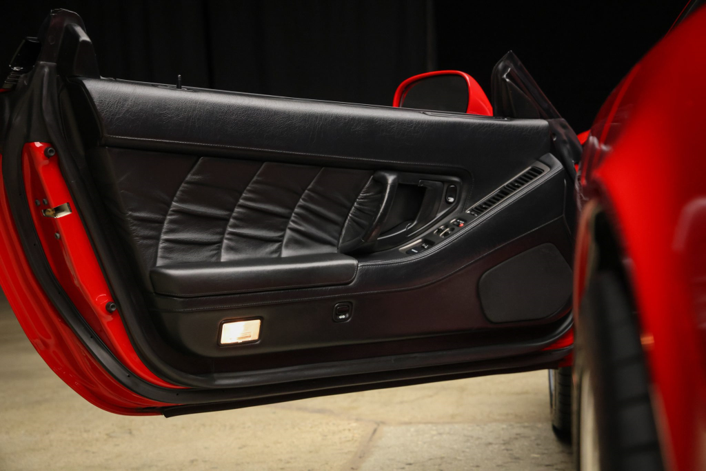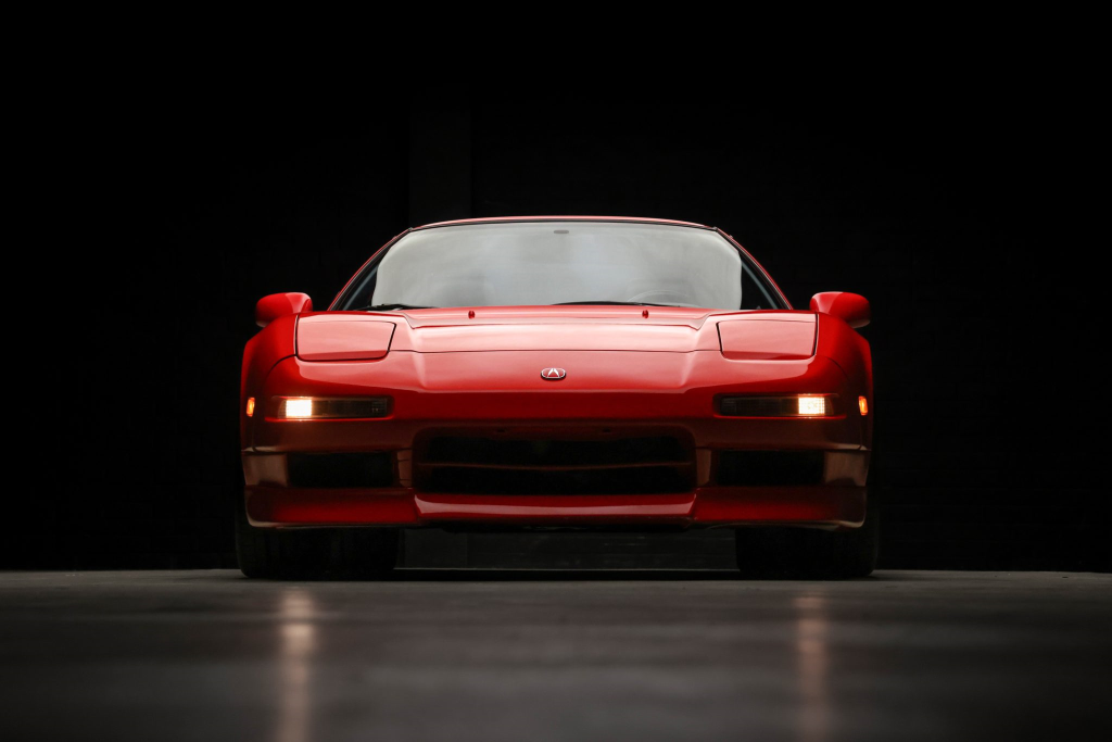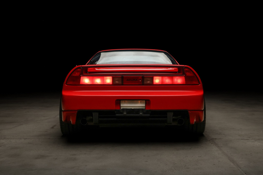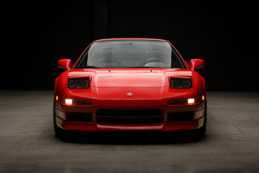 The NSX featured aluminum bodywork, and this example is finished in Formula Red with a body-color removable roof panel. Features include pop-up headlights, an integrated rear wing, side air intakes, power-adjustable side mirrors, and dual exhaust outlets. Scuffs are located on the underside of the front spoiler, and imperfections are highlighted in the gallery.
