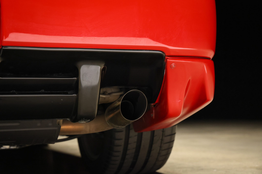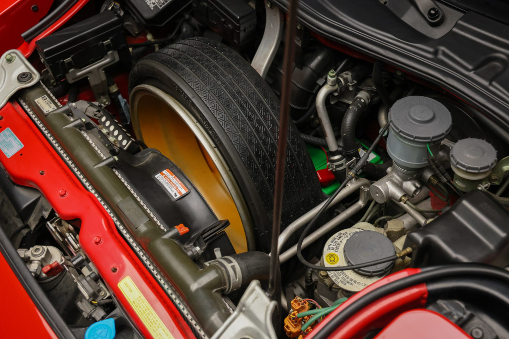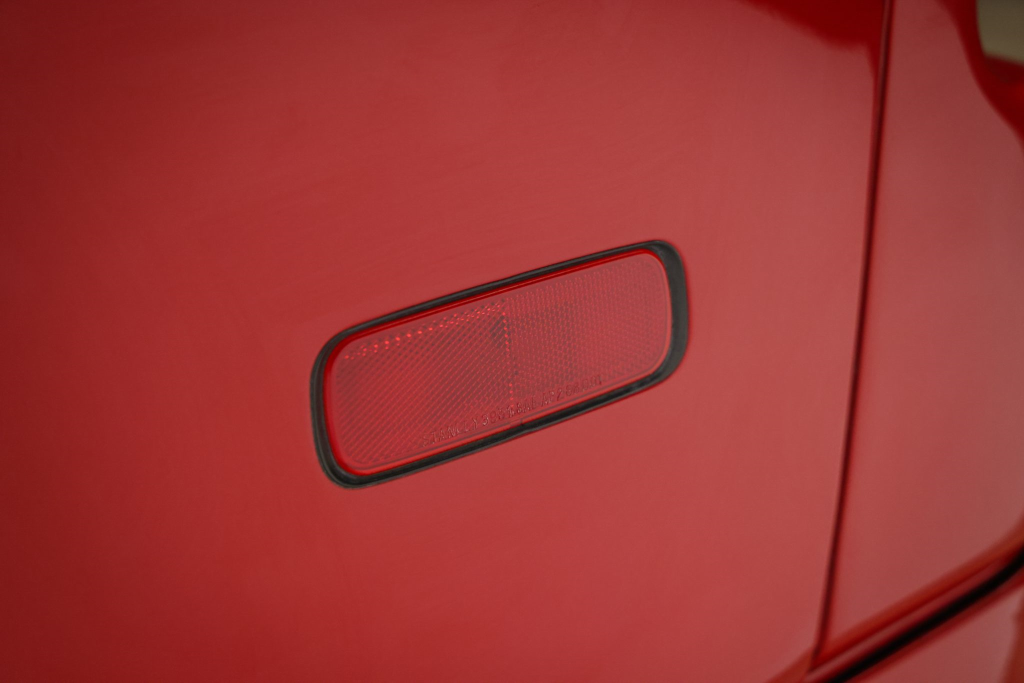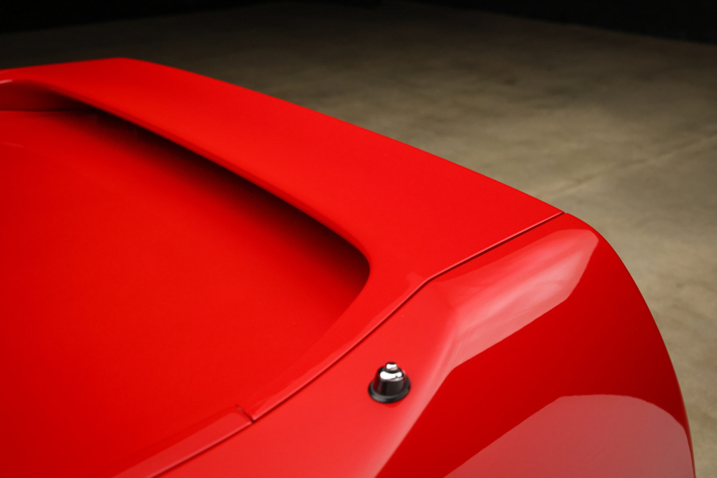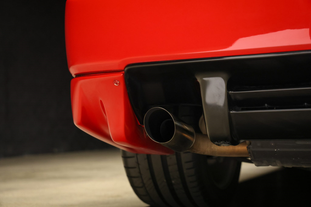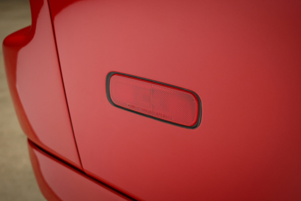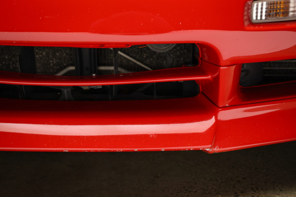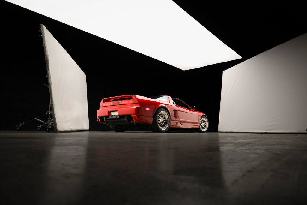 The NSX featured aluminum bodywork, and this example is finished in Formula Red with a body-color removable roof panel. Features include pop-up headlights, an integrated rear wing, side air intakes, power-adjustable side mirrors, and dual exhaust outlets. Scuffs are located on the underside of the front spoiler, and imperfections are highlighted in the gallery.