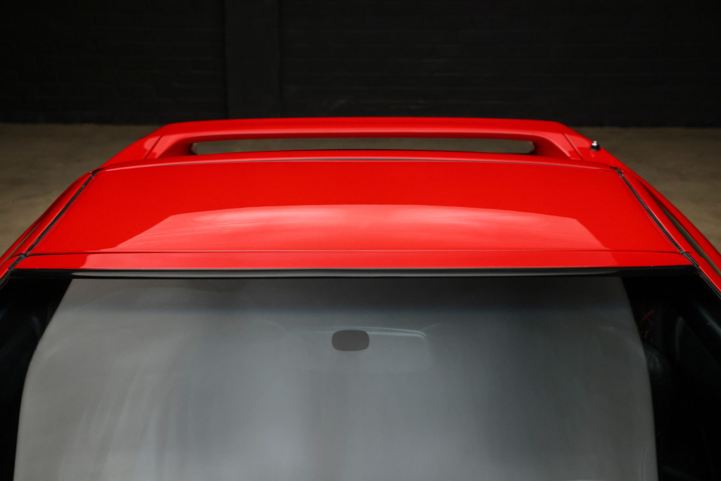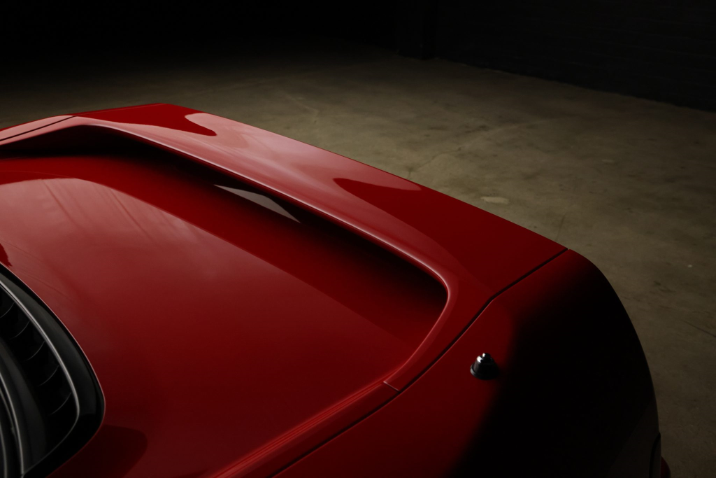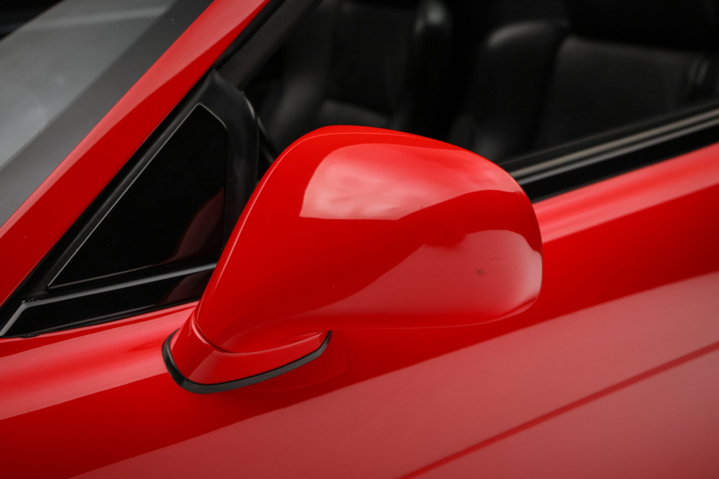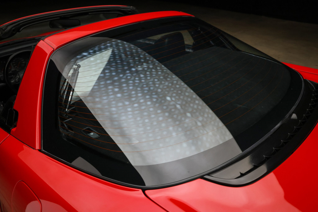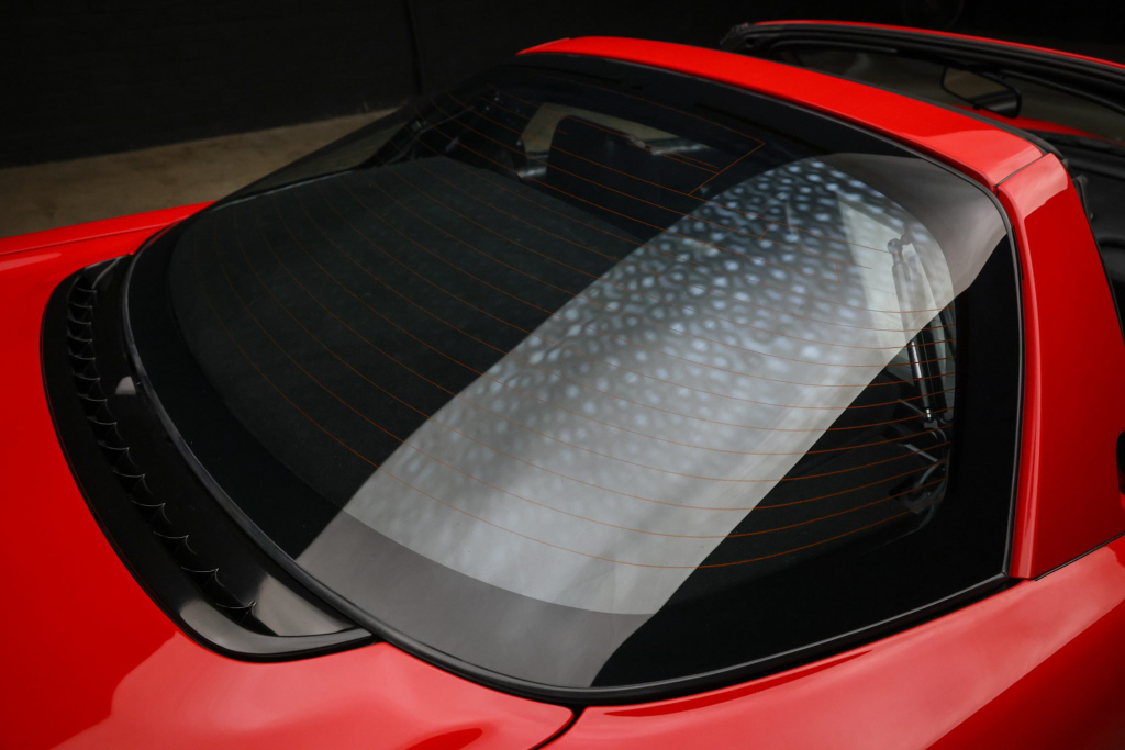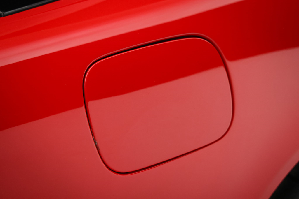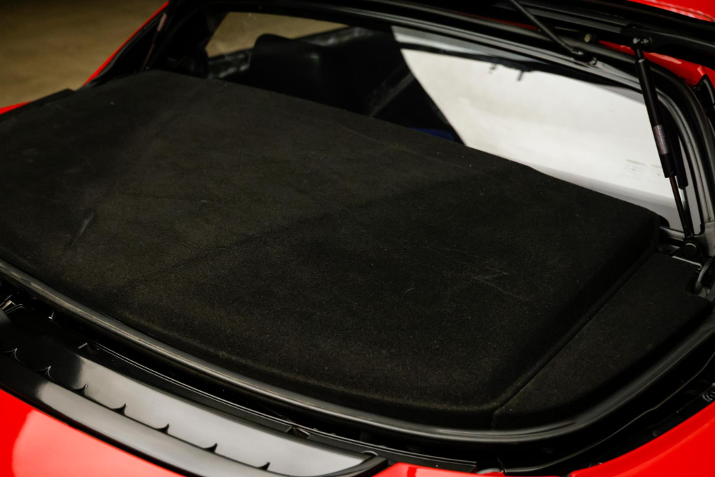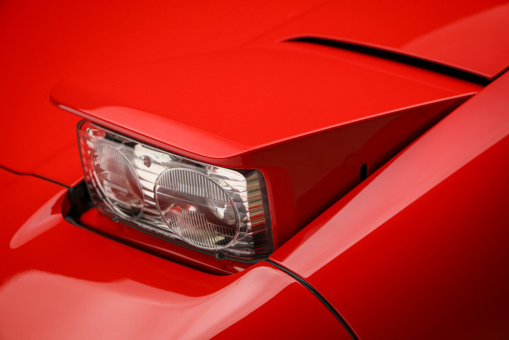 The NSX featured aluminum bodywork, and this example is finished in Formula Red with a body-color removable roof panel. Features include pop-up headlights, an integrated rear wing, side air intakes, power-adjustable side mirrors, and dual exhaust outlets. Scuffs are located on the underside of the front spoiler, and imperfections are highlighted in the gallery.