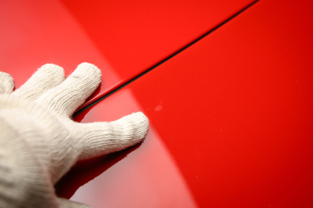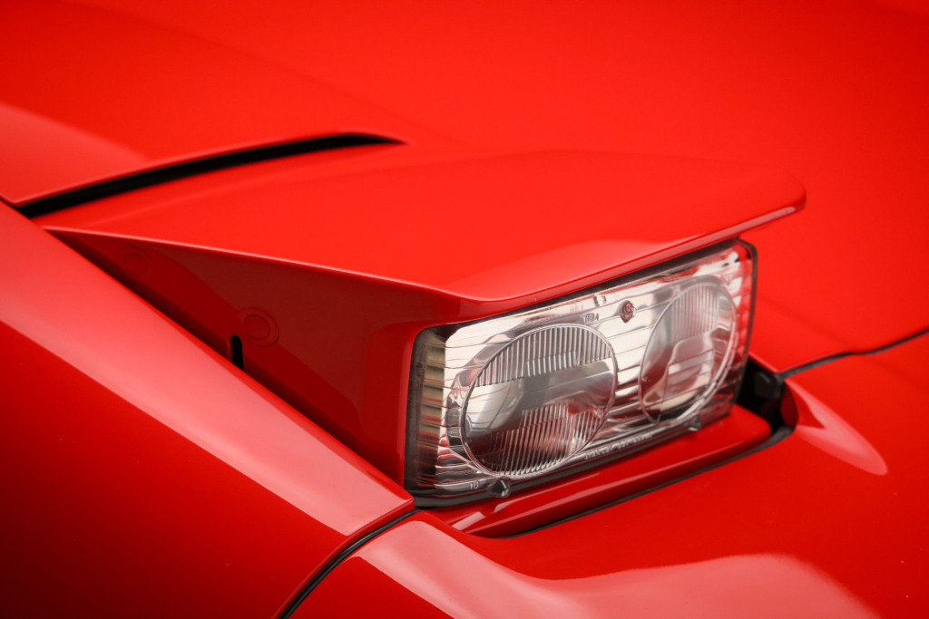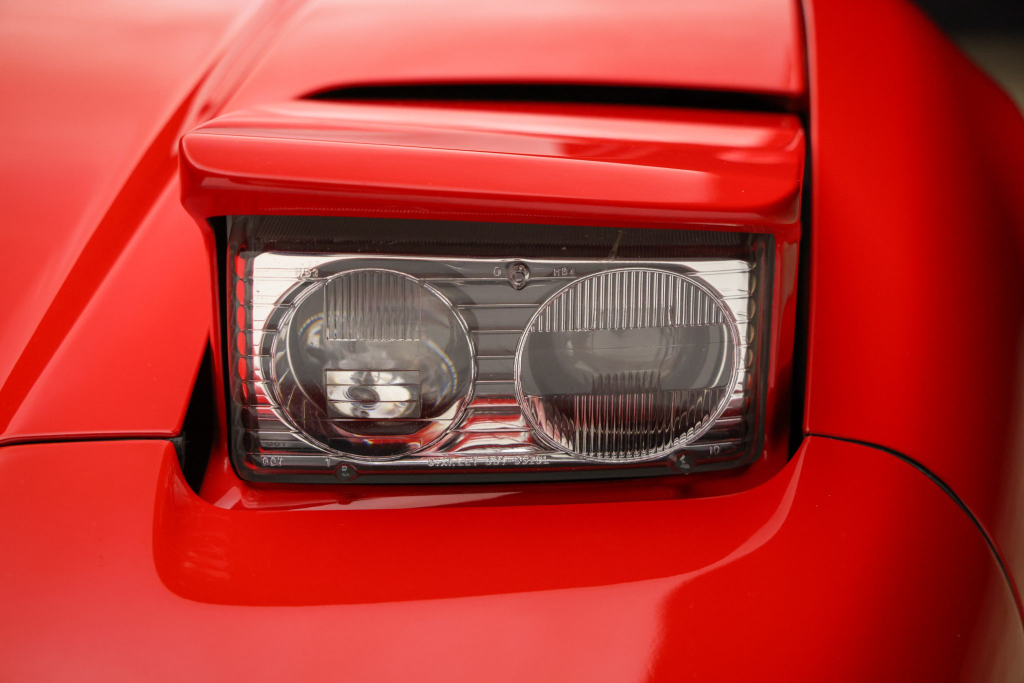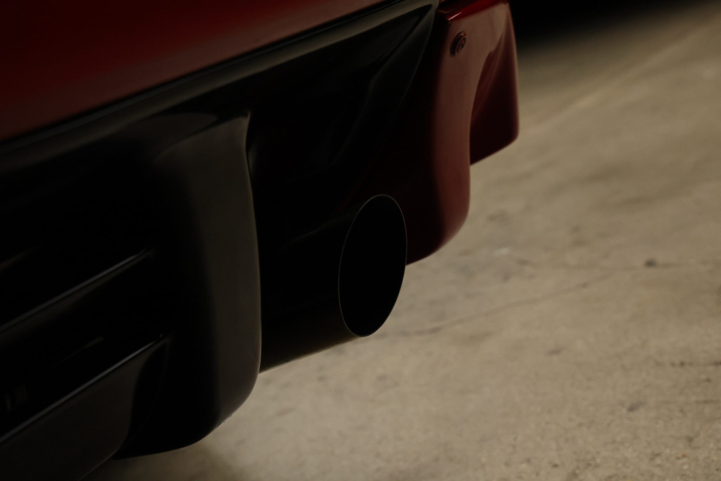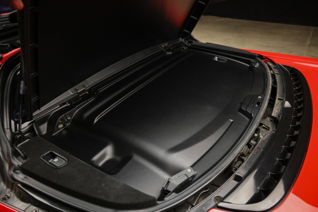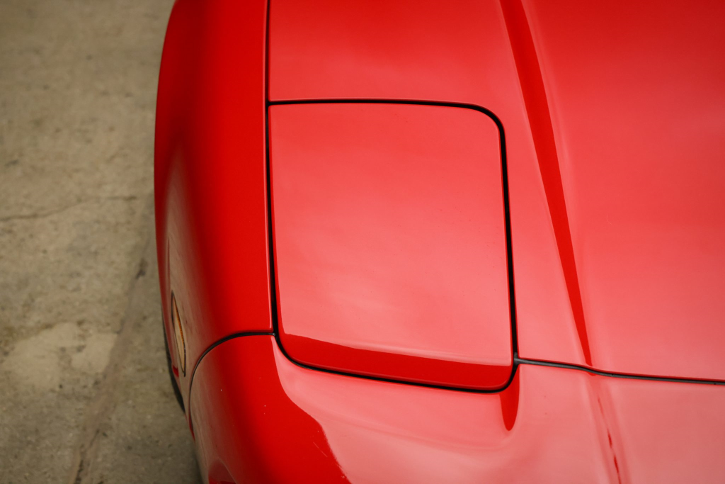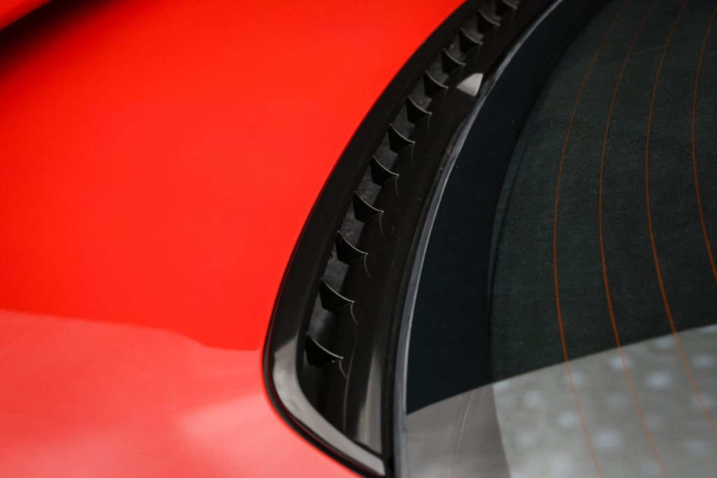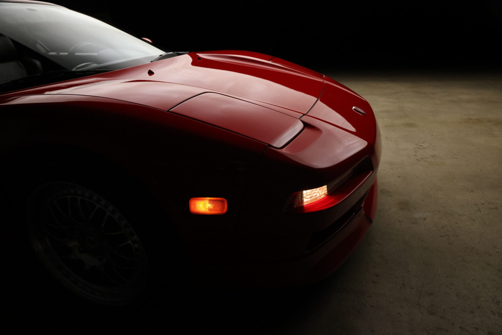 The NSX featured aluminum bodywork, and this example is finished in Formula Red with a body-color removable roof panel. Features include pop-up headlights, an integrated rear wing, side air intakes, power-adjustable side mirrors, and dual exhaust outlets. Scuffs are located on the underside of the front spoiler, and imperfections are highlighted in the gallery.