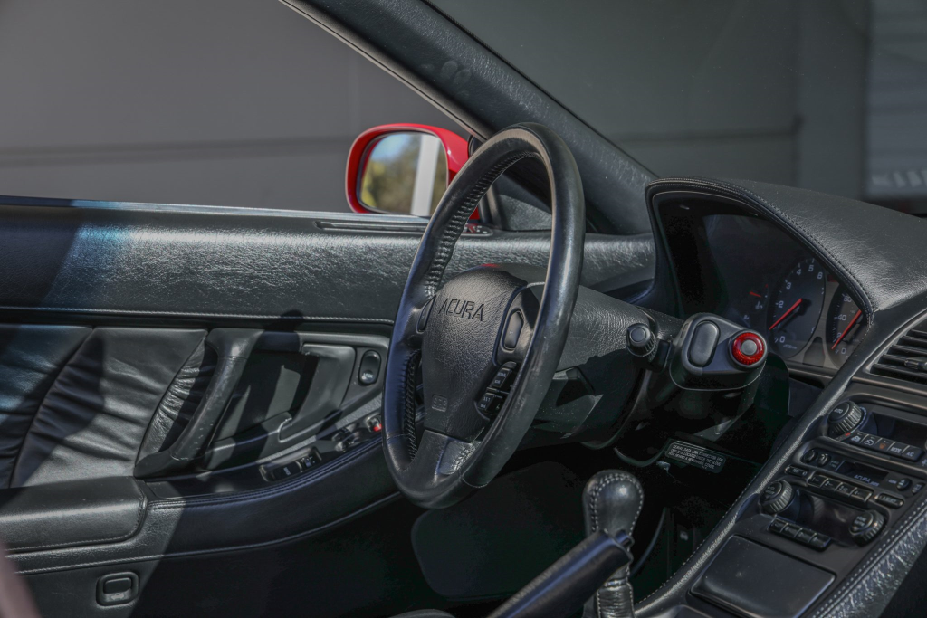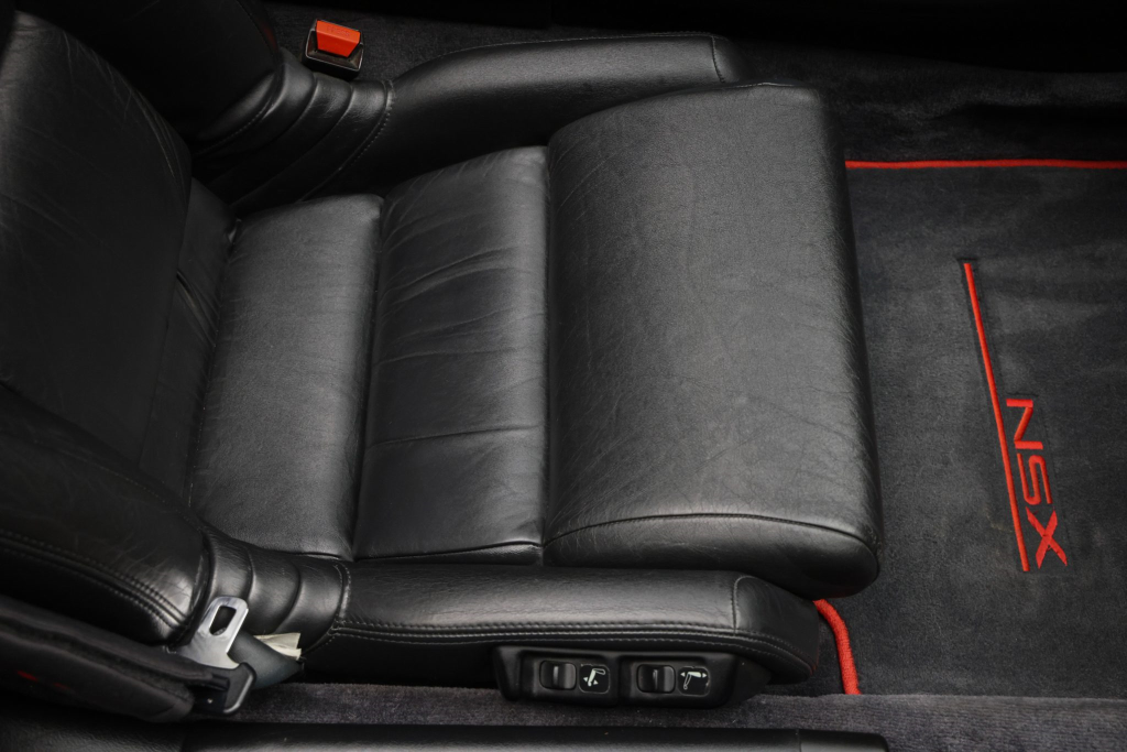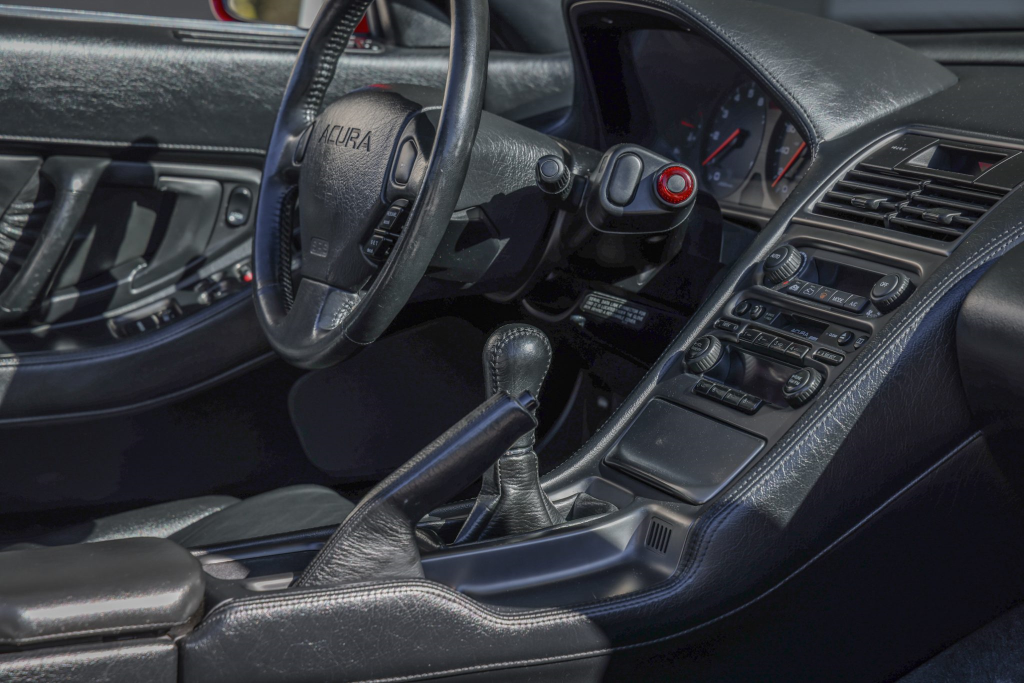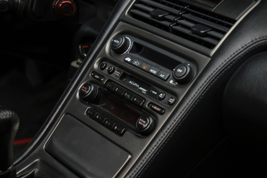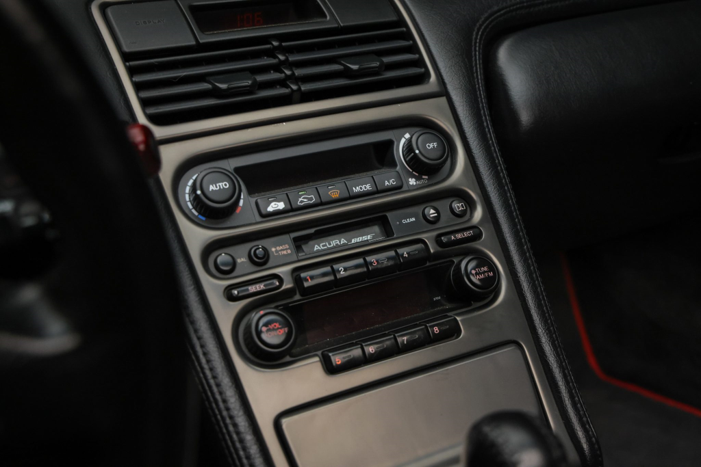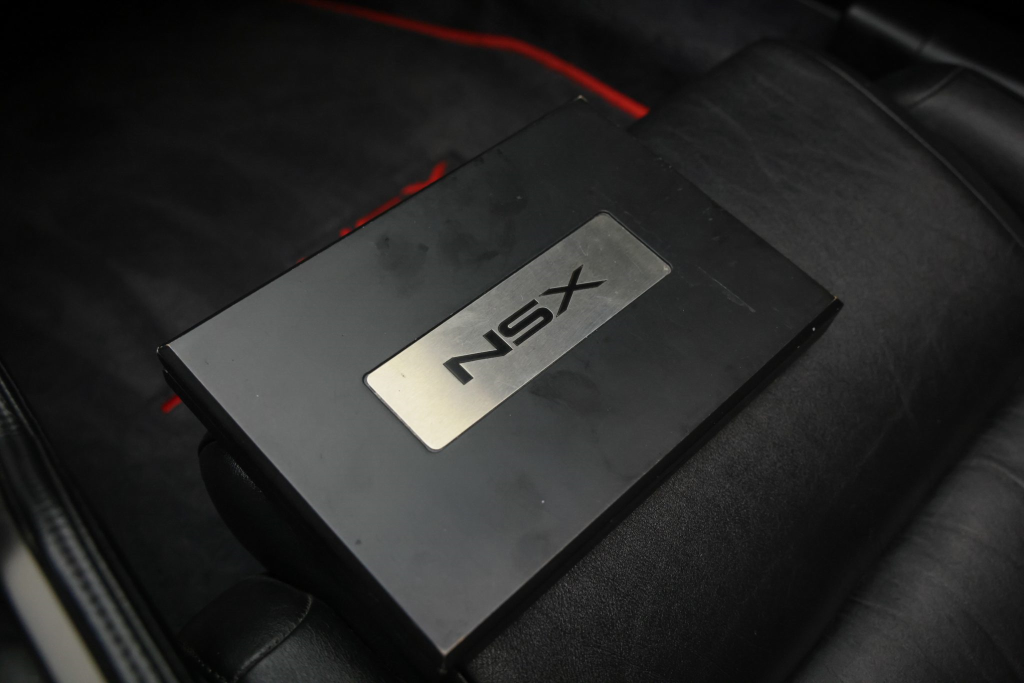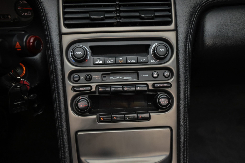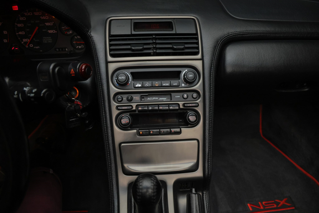 The power-adjustable sport seats are upholstered in black leather, while NSX-branded floor mats line the footwells. Interior appointments include automatic climate control, cruise control, a Bose sound system, and a cassette stereo linked to an Alpine CD changer. The stainless-steel door sill plates are stamped with the car’s serial number.