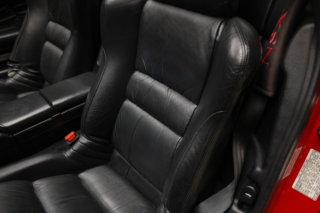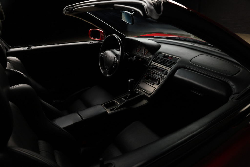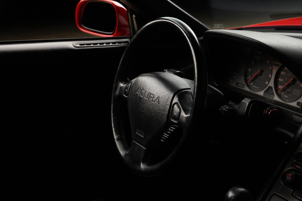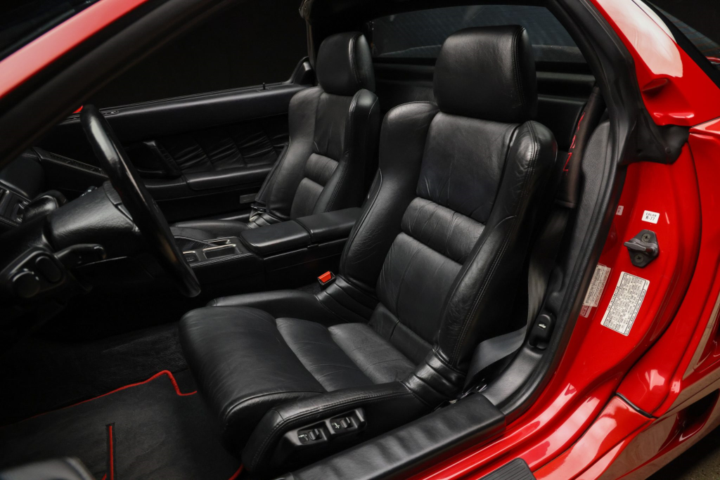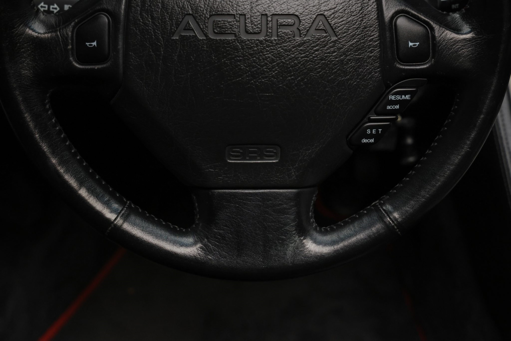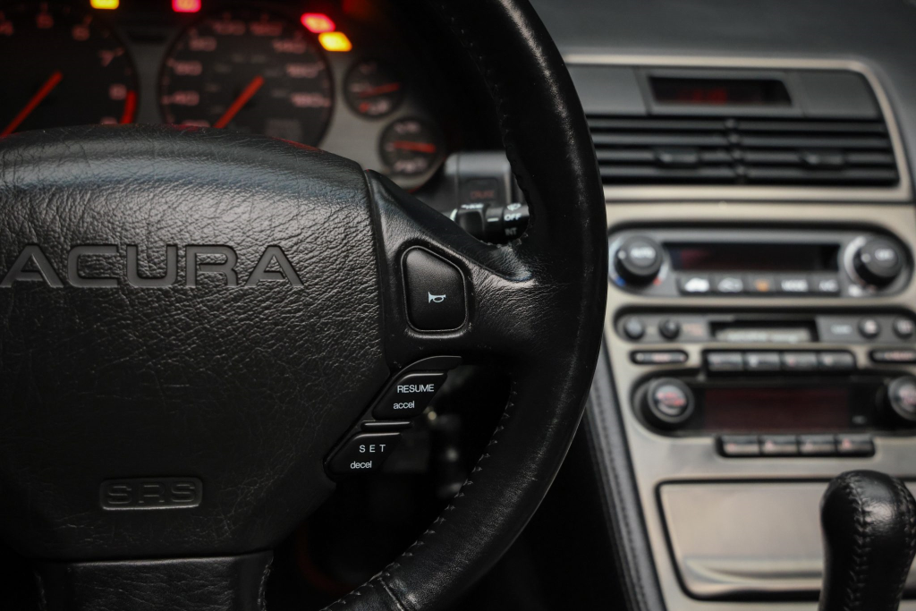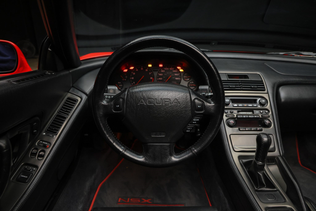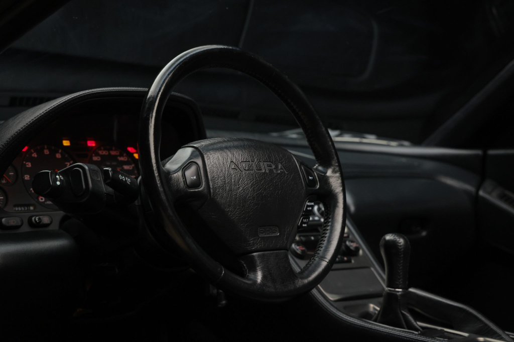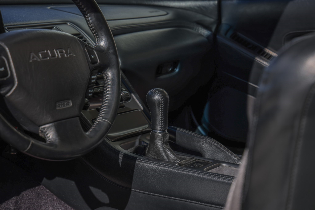The power-adjustable sport seats are upholstered in black leather, while NSX-branded floor mats line the footwells. Interior appointments include automatic climate control, cruise control, a Bose sound system, and a cassette stereo linked to an Alpine CD changer. The stainless-steel door sill plates are stamped with the car’s serial number.