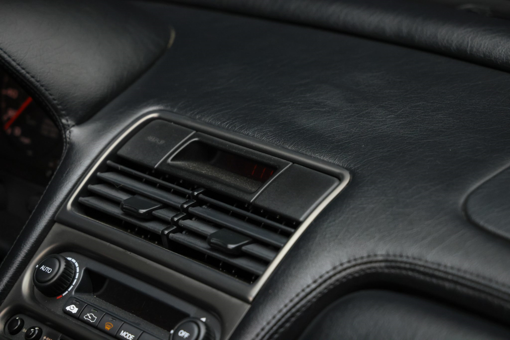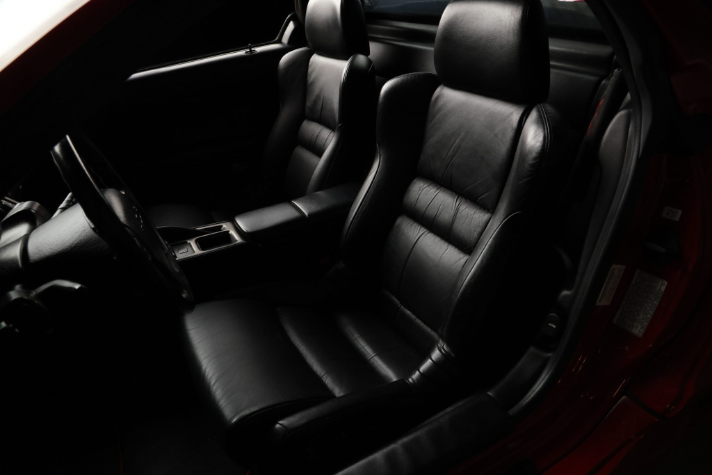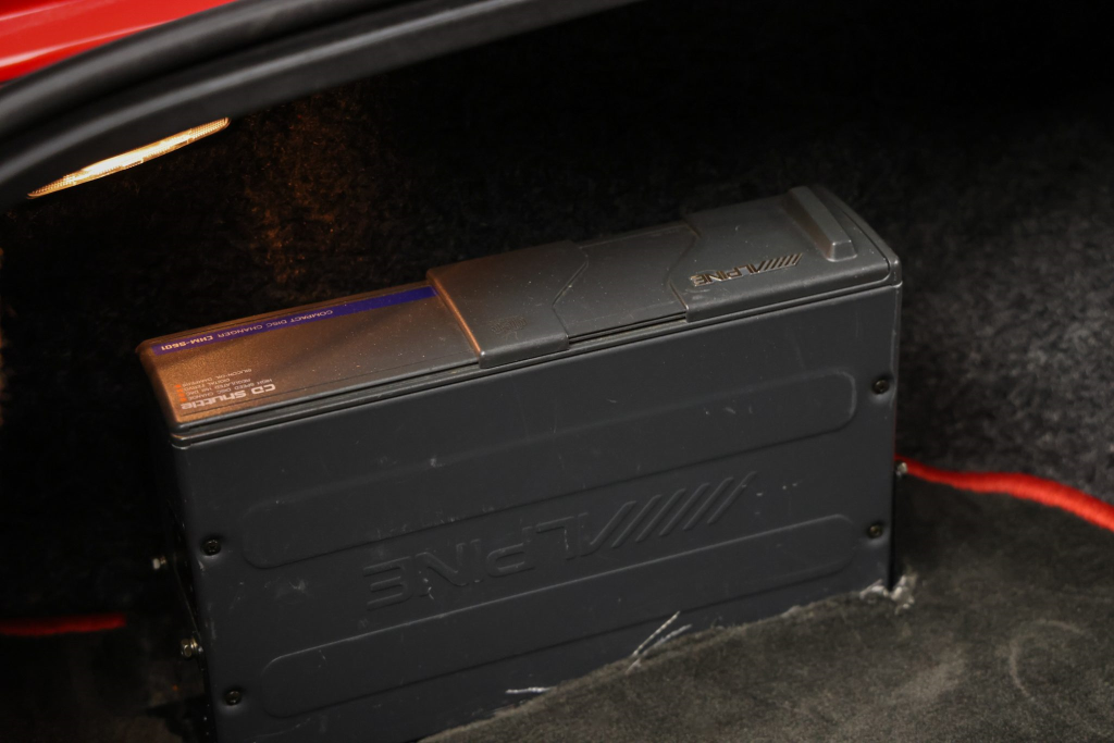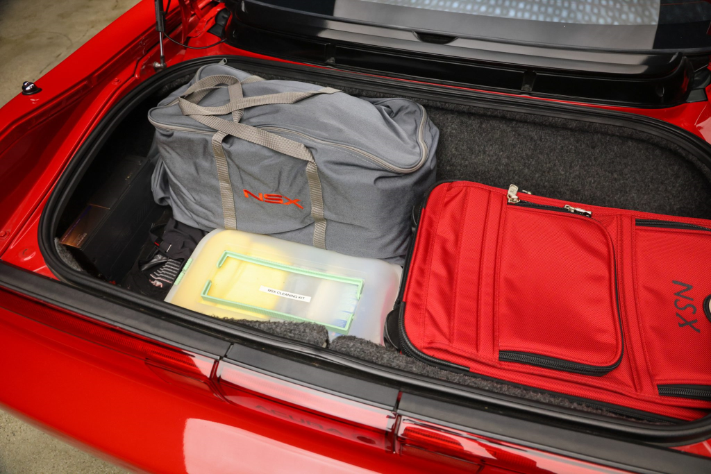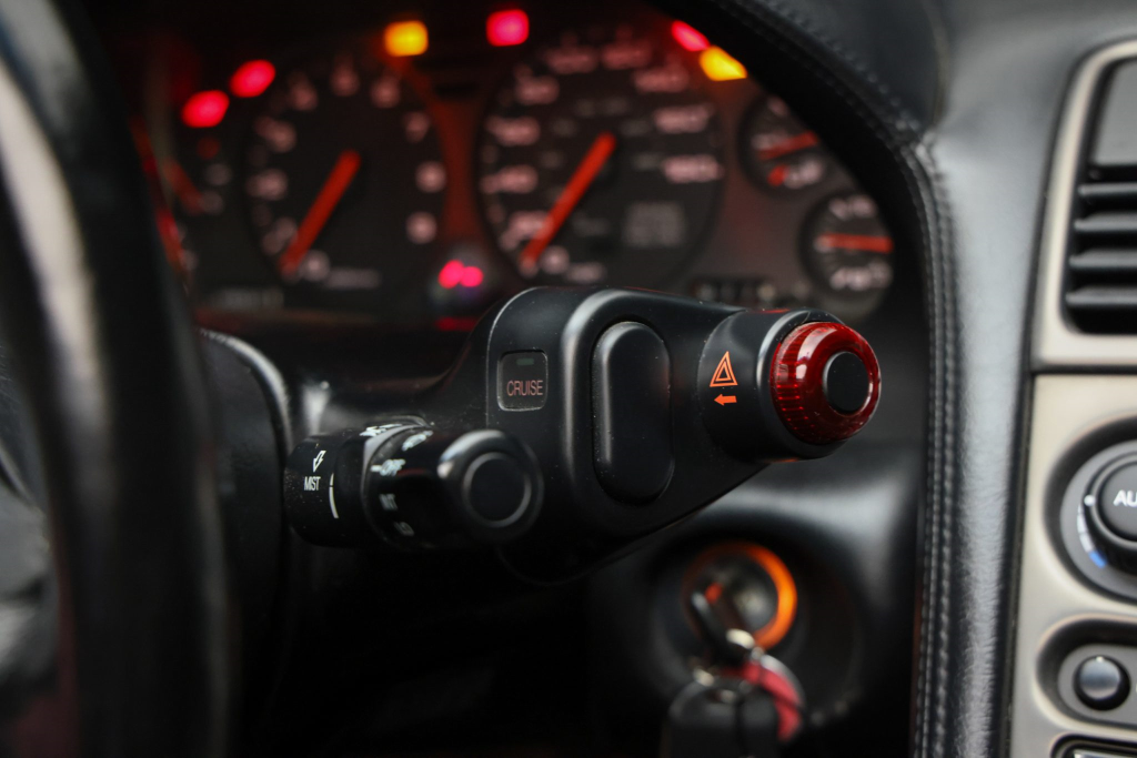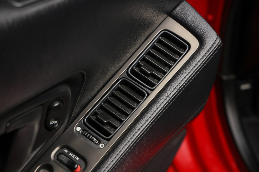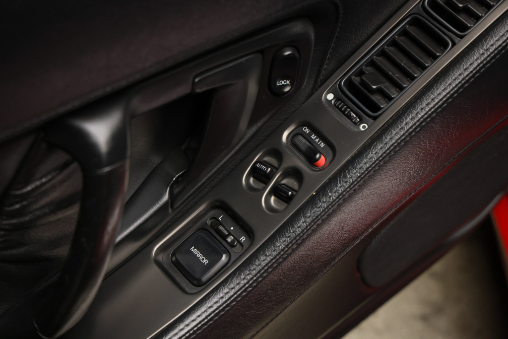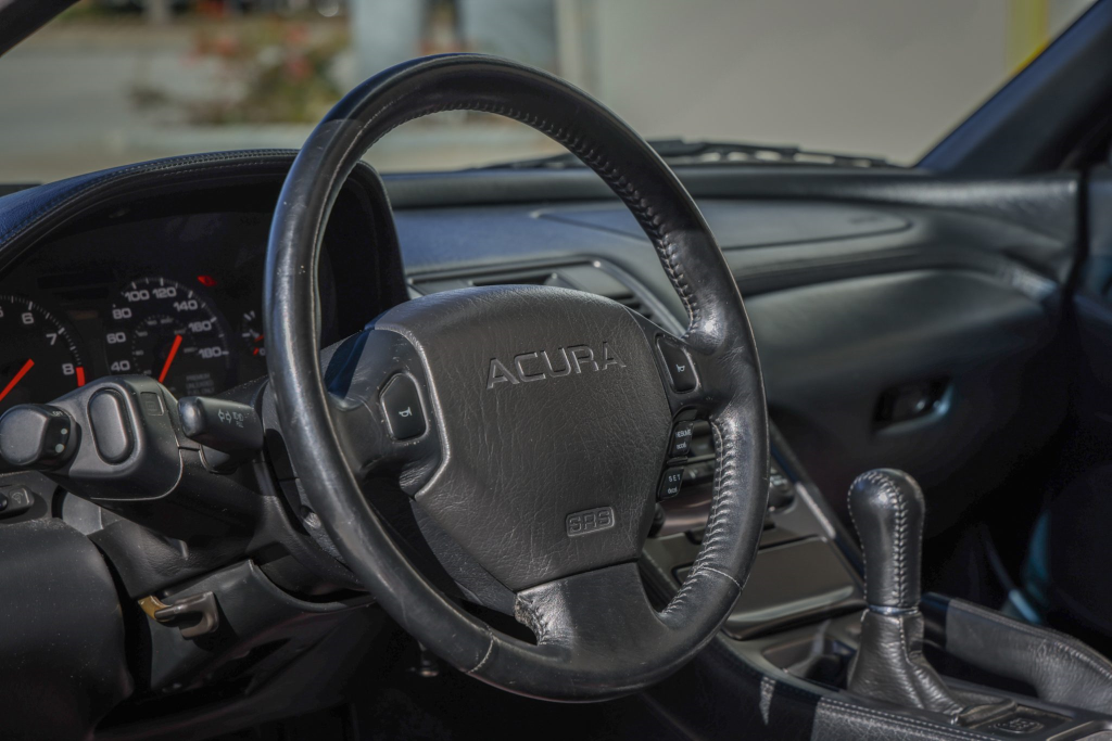 The power-adjustable sport seats are upholstered in black leather, while NSX-branded floor mats line the footwells. Interior appointments include automatic climate control, cruise control, a Bose sound system, and a cassette stereo linked to an Alpine CD changer. The stainless-steel door sill plates are stamped with the car’s serial number.
