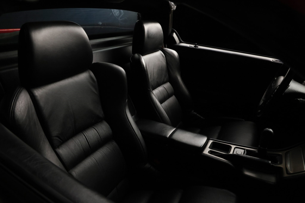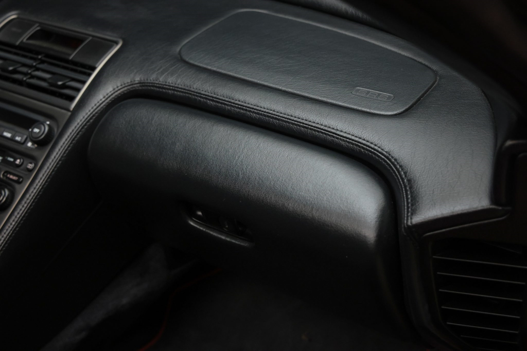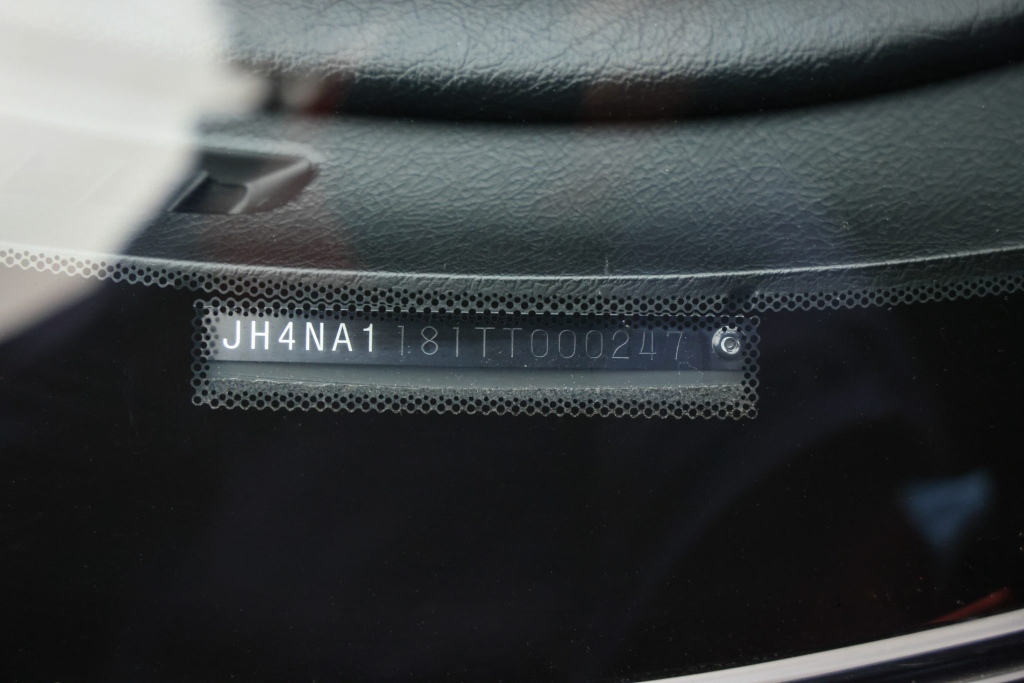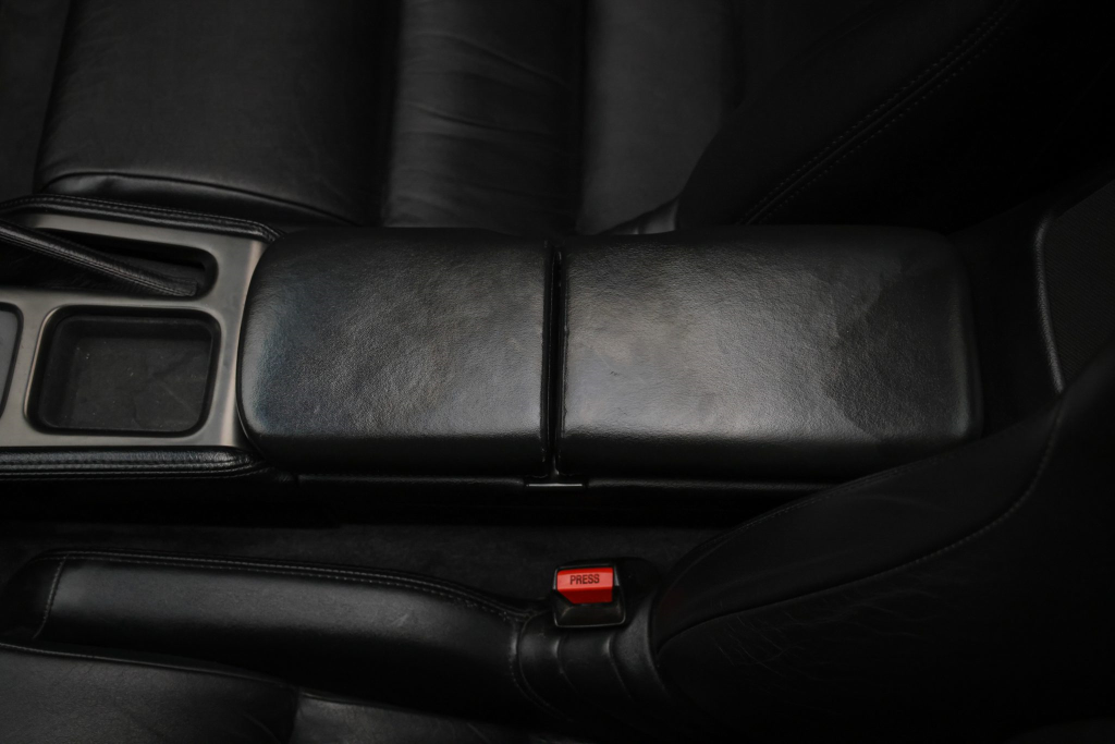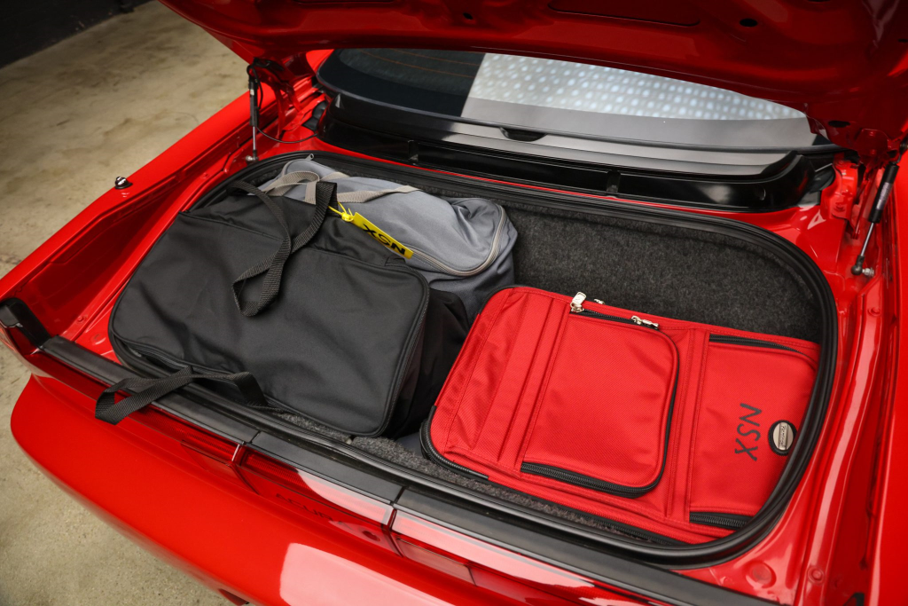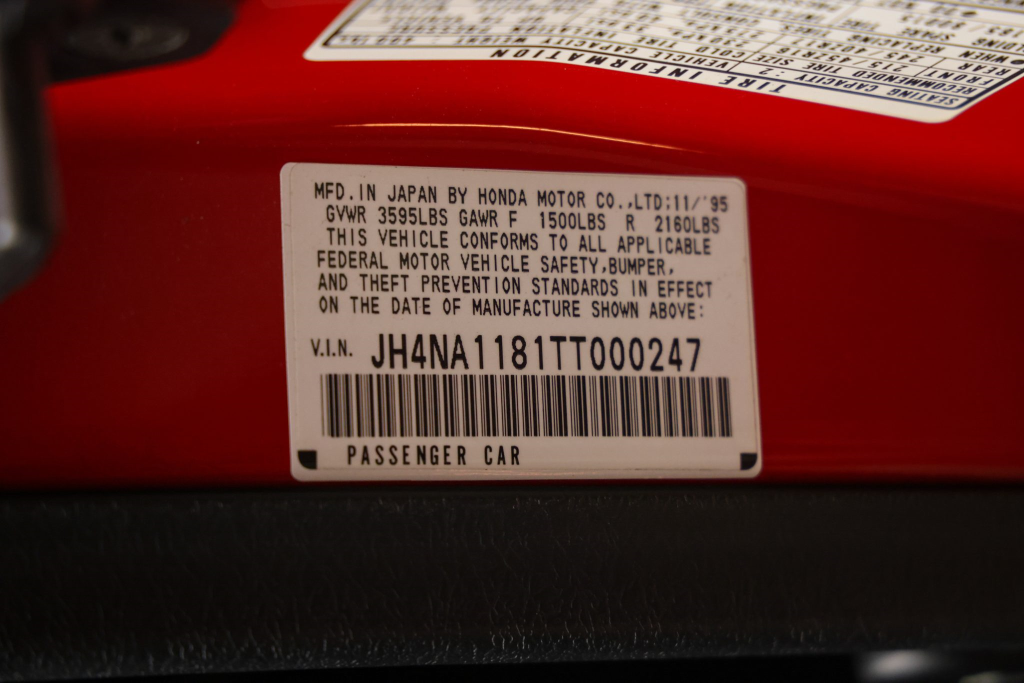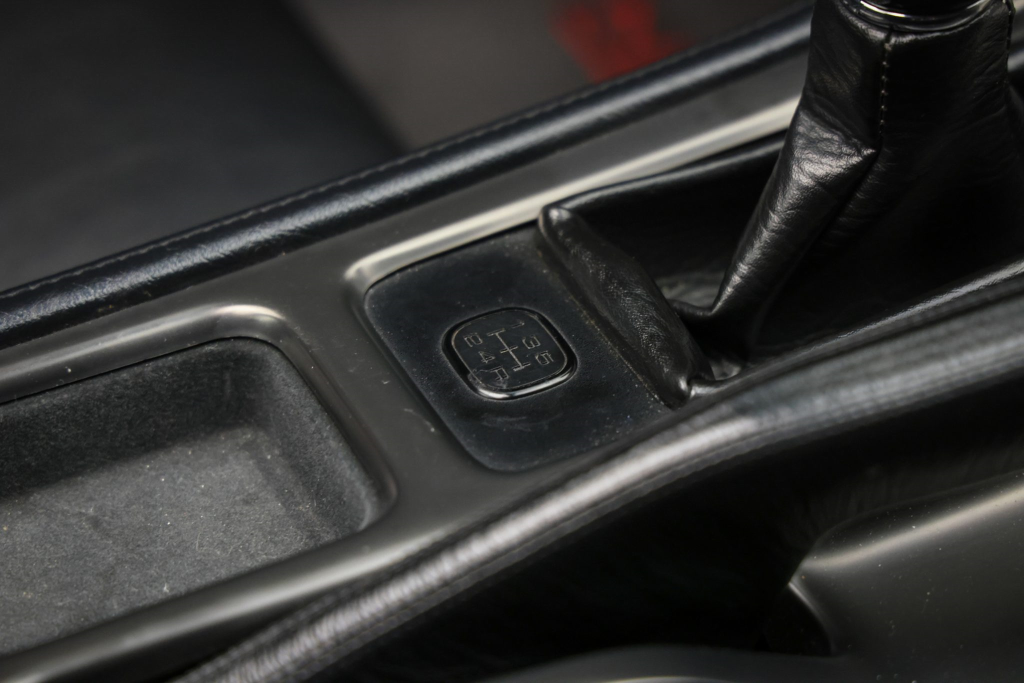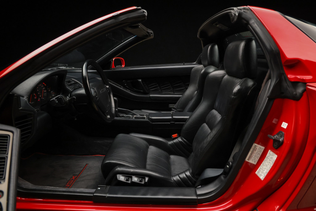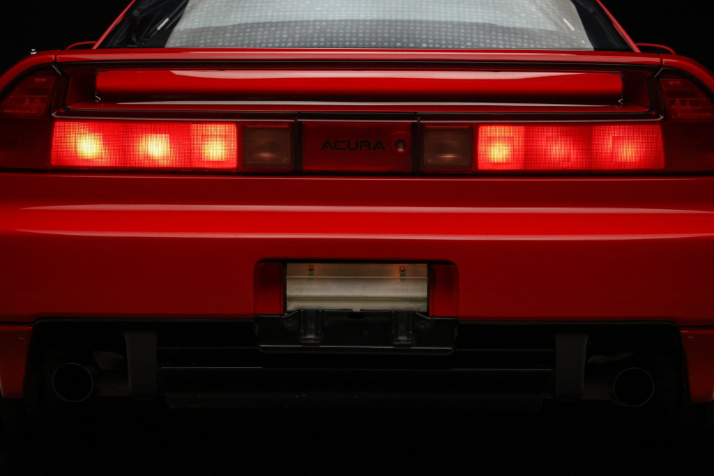 The power-adjustable sport seats are upholstered in black leather, while NSX-branded floor mats line the footwells. Interior appointments include automatic climate control, cruise control, a Bose sound system, and a cassette stereo linked to an Alpine CD changer. The stainless-steel door sill plates are stamped with the car’s serial number.