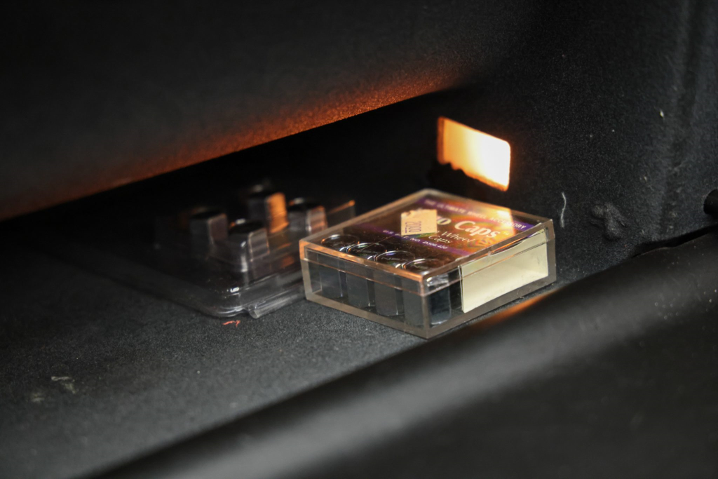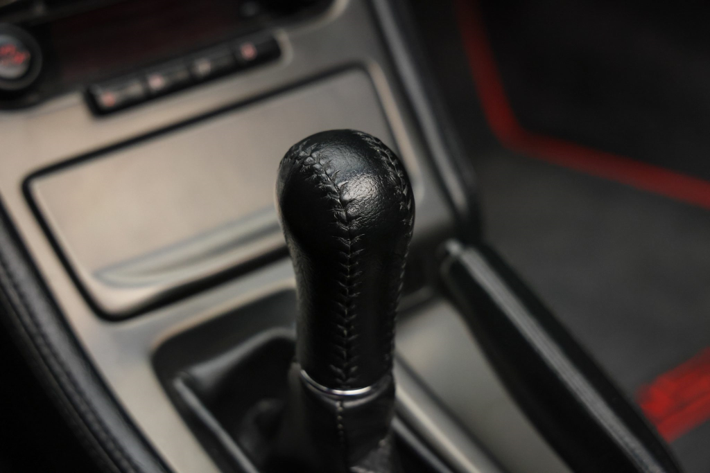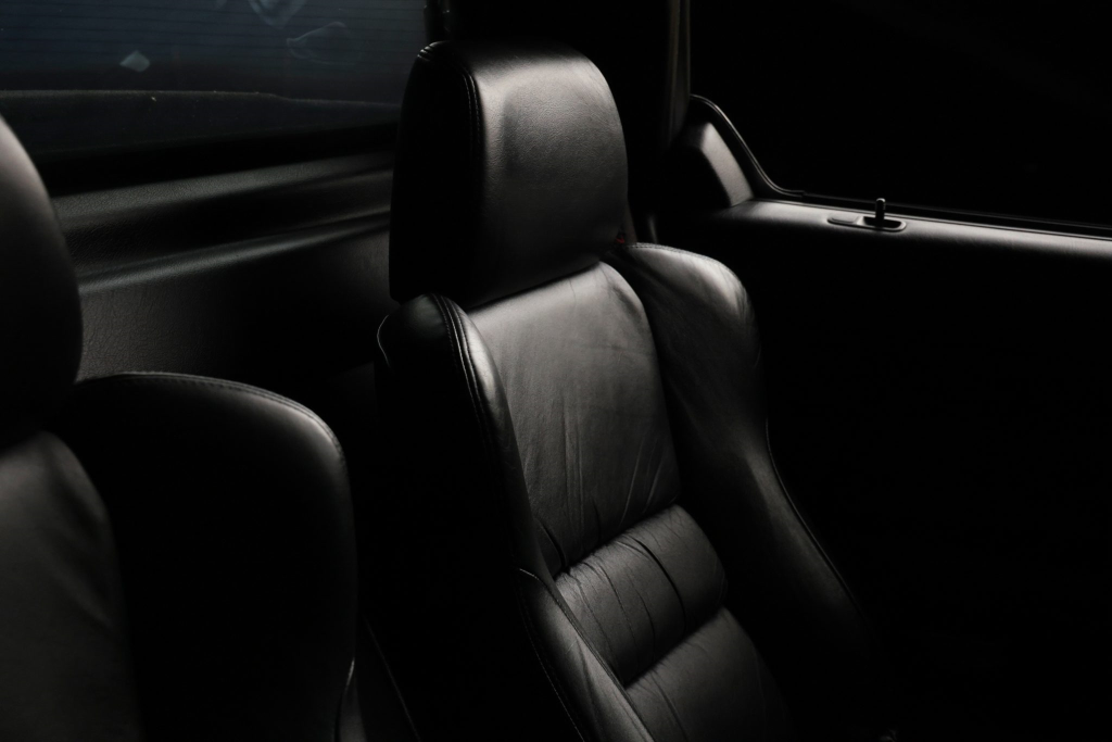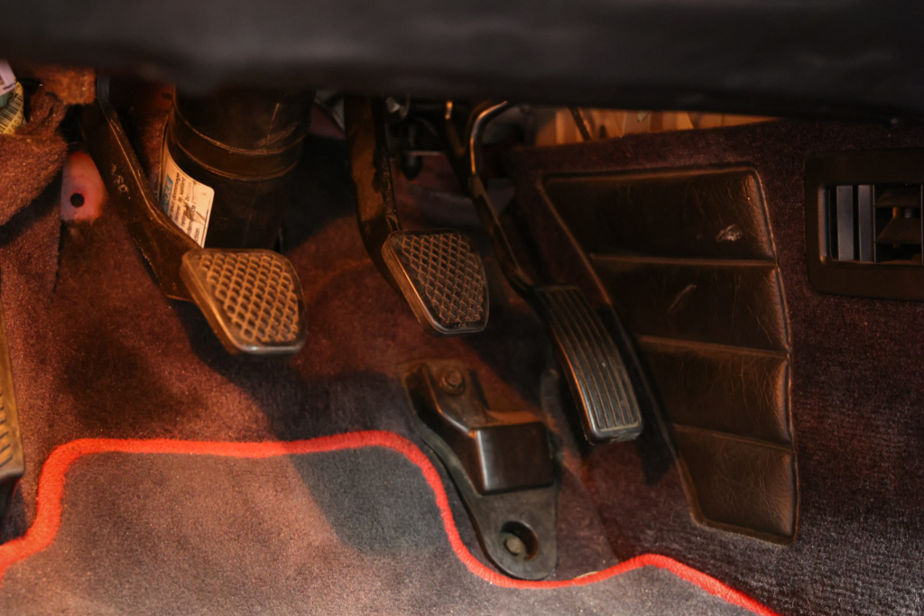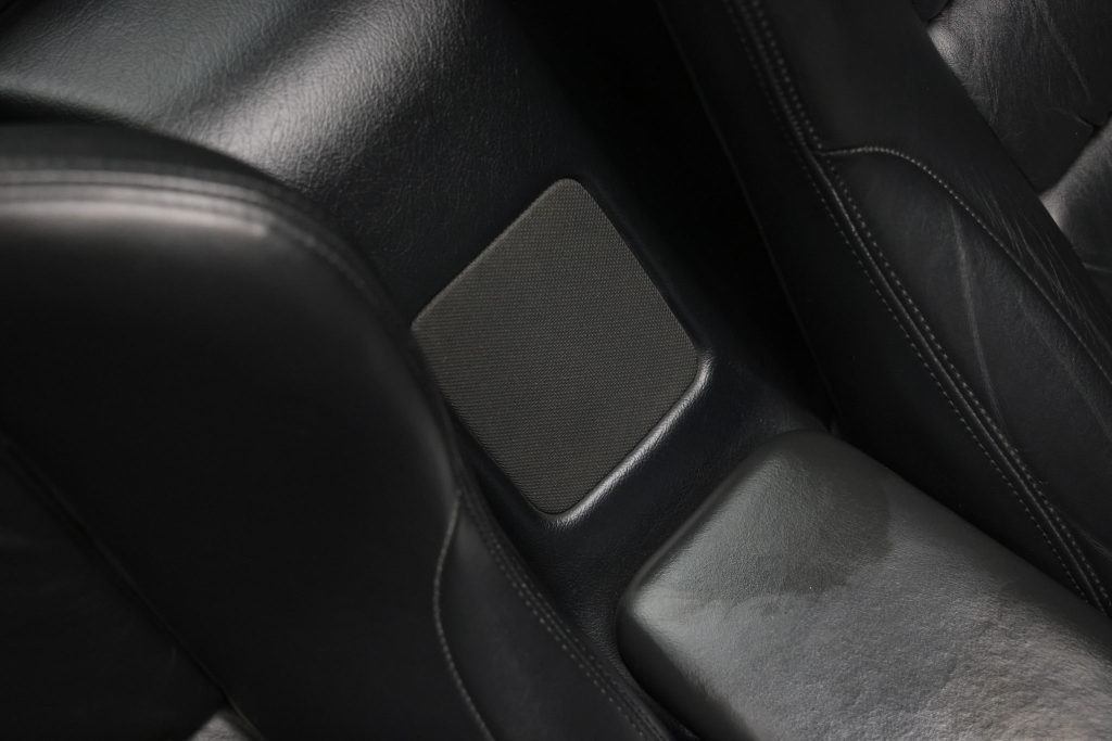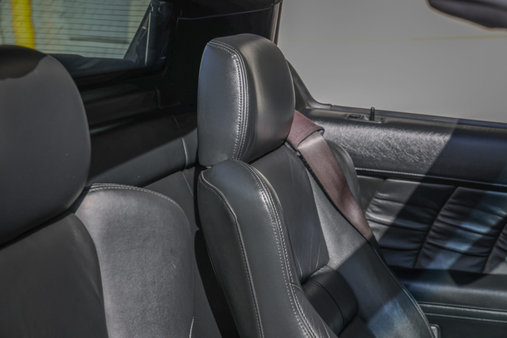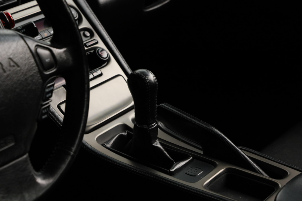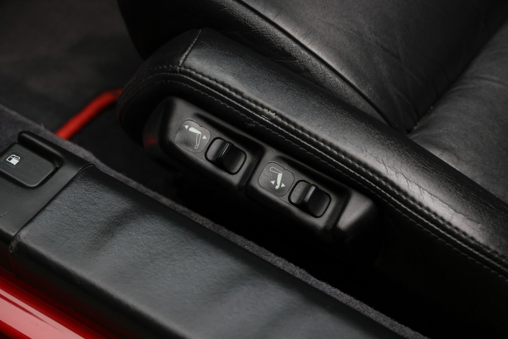 The power-adjustable sport seats are upholstered in black leather, while NSX-branded floor mats line the footwells. Interior appointments include automatic climate control, cruise control, a Bose sound system, and a cassette stereo linked to an Alpine CD changer. The stainless-steel door sill plates are stamped with the car’s serial number.