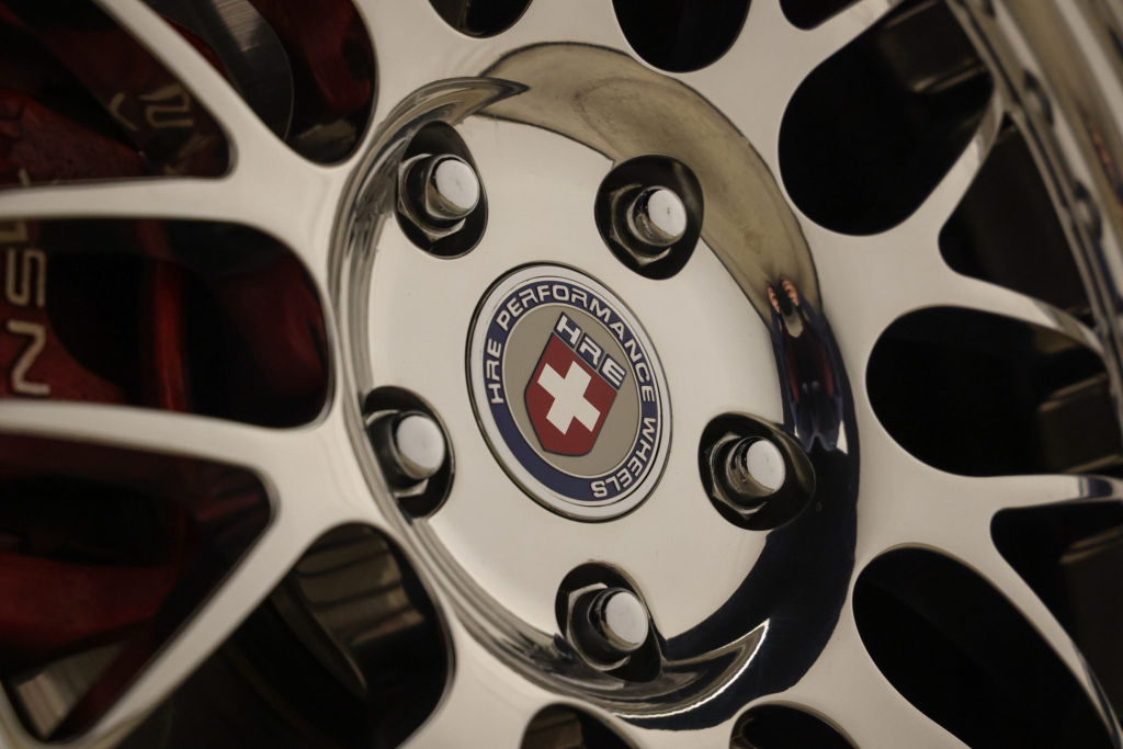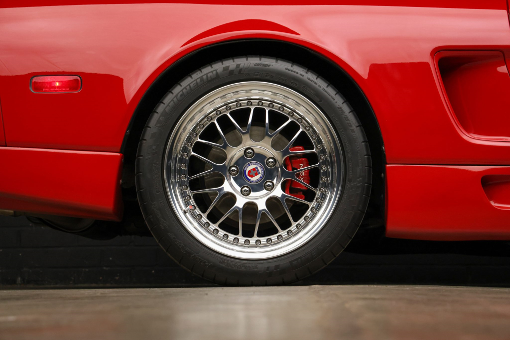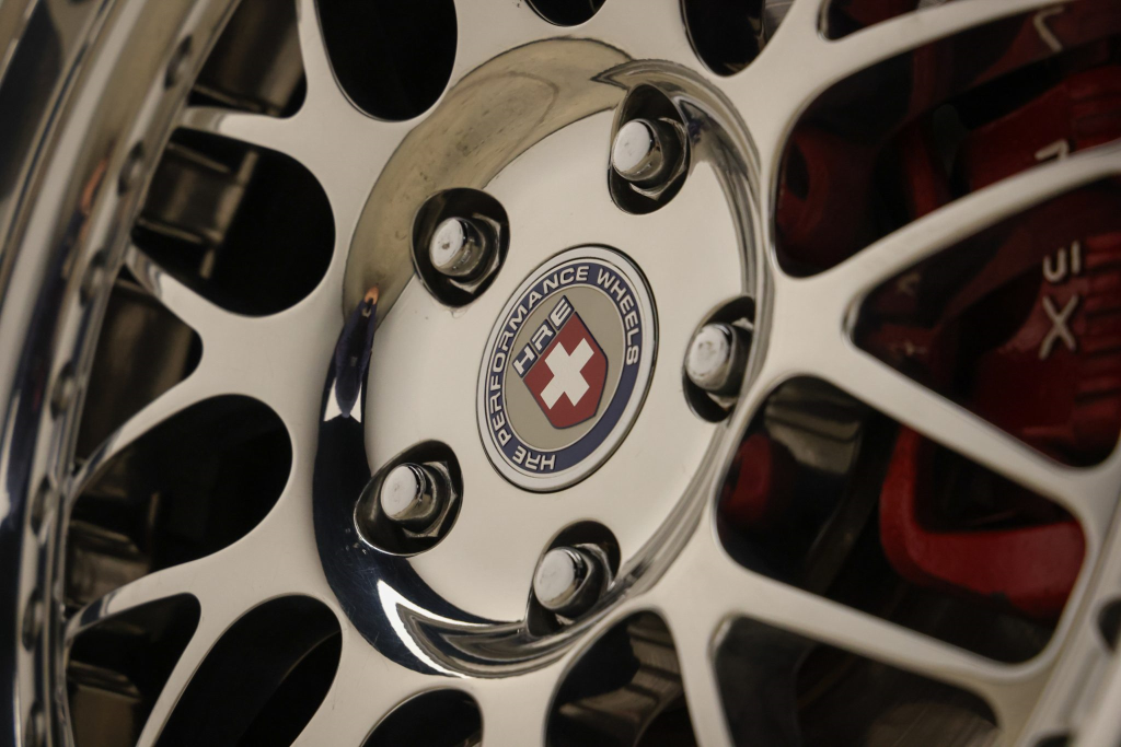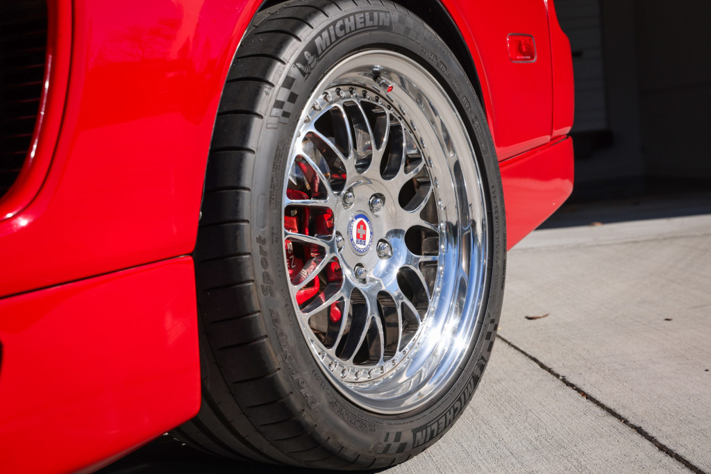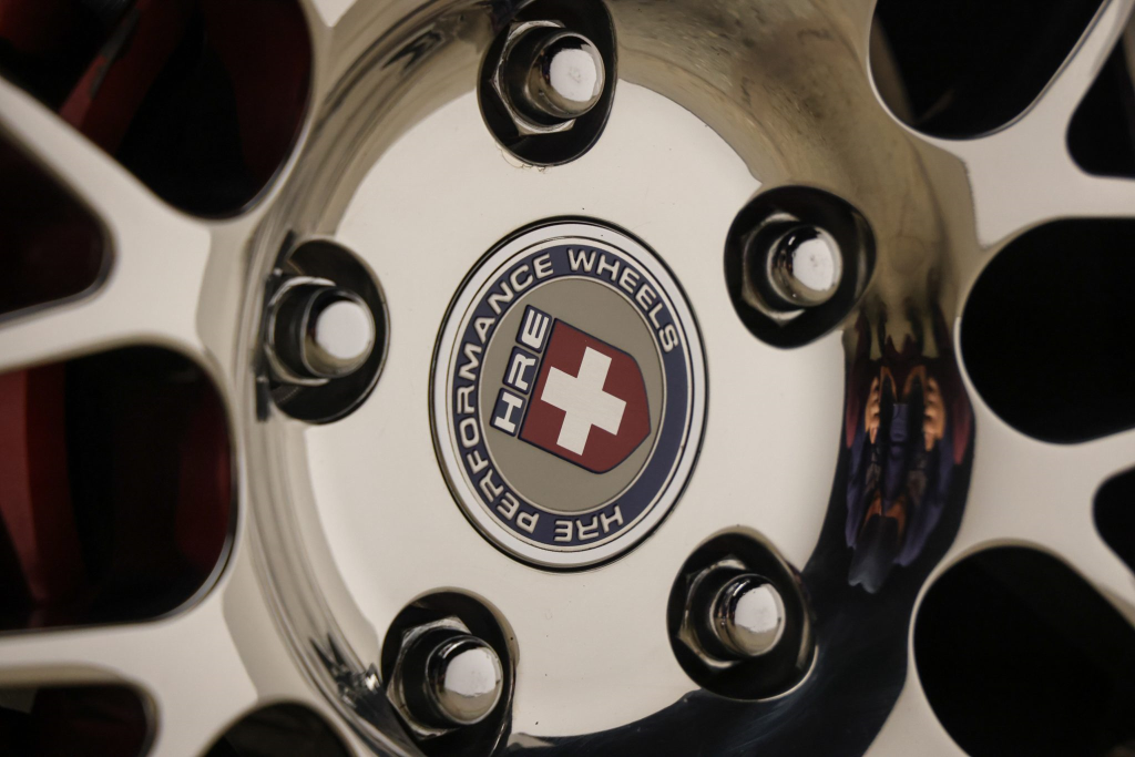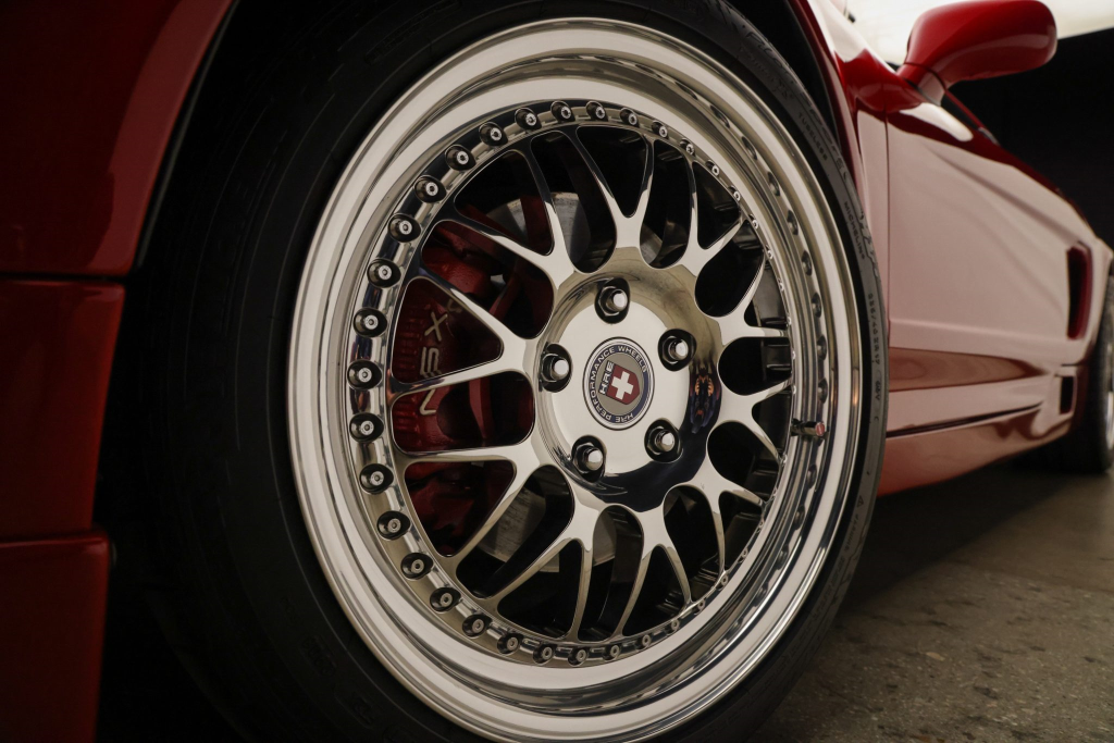 The 17″ and 18″ HRE multi-piece wheels are mounted with Michelin tires. The car features a four-wheel double-wishbone suspension with front and rear stabilizer bars, and braking is handled by red NSX-branded calipers over vented rotors at each corner.