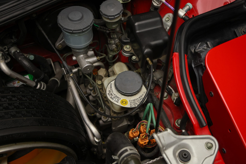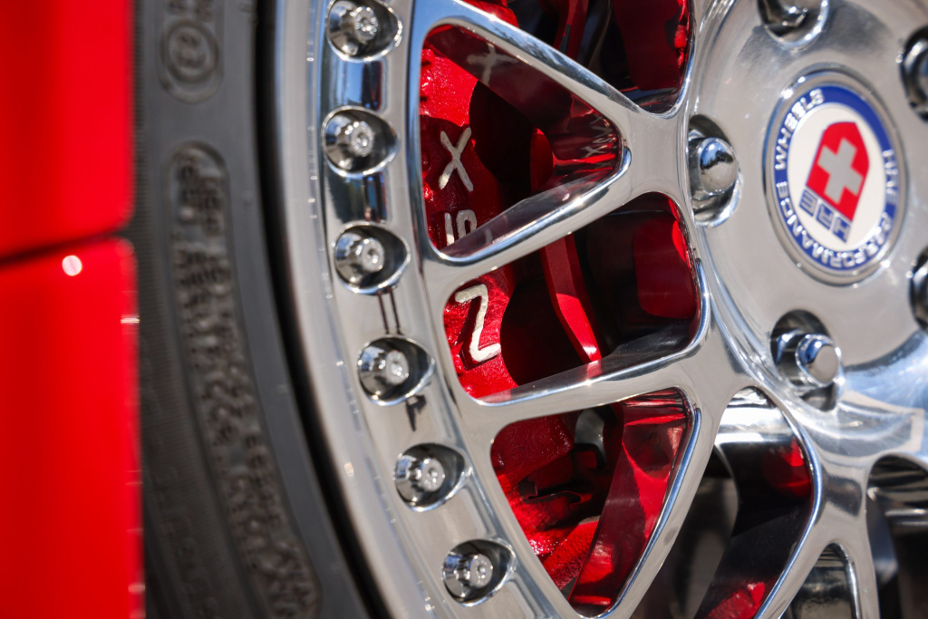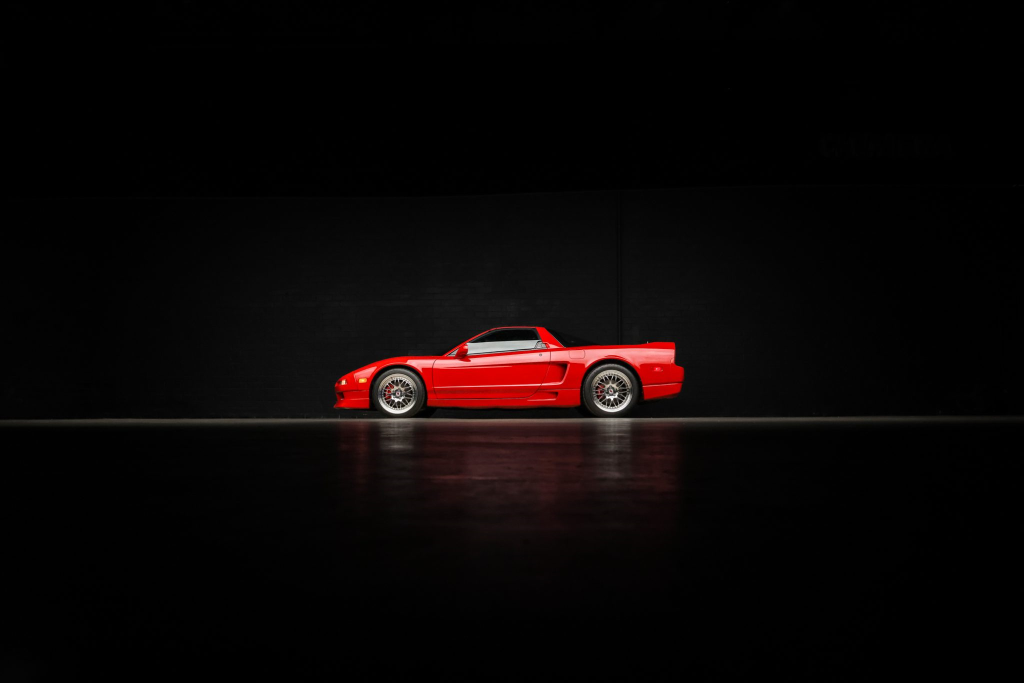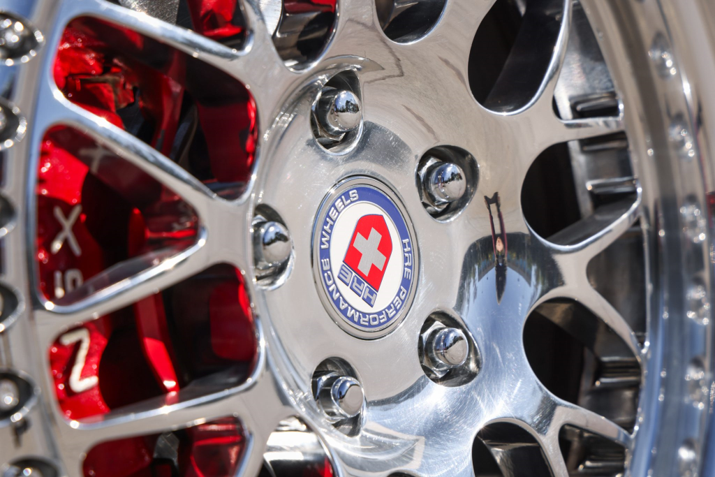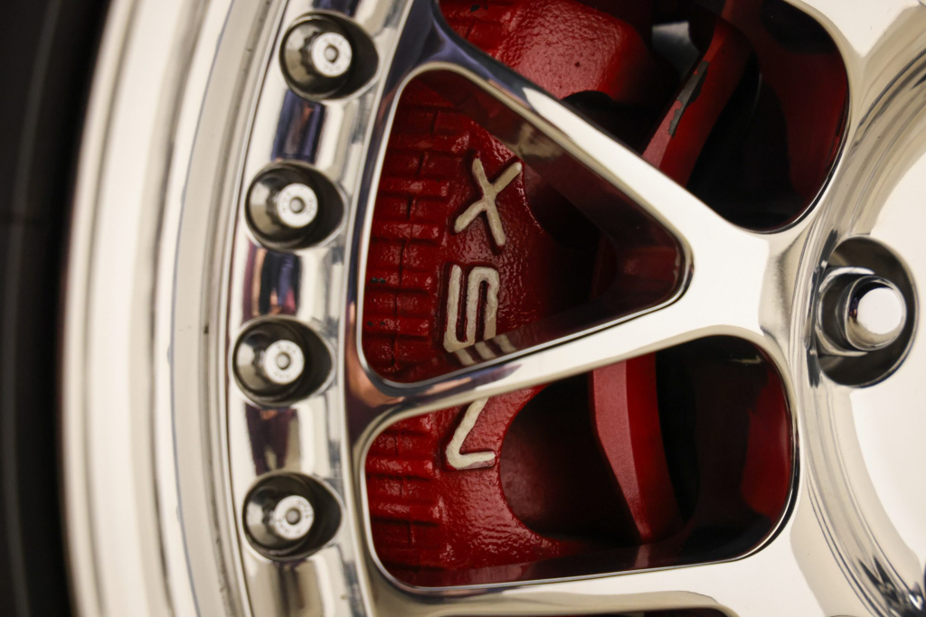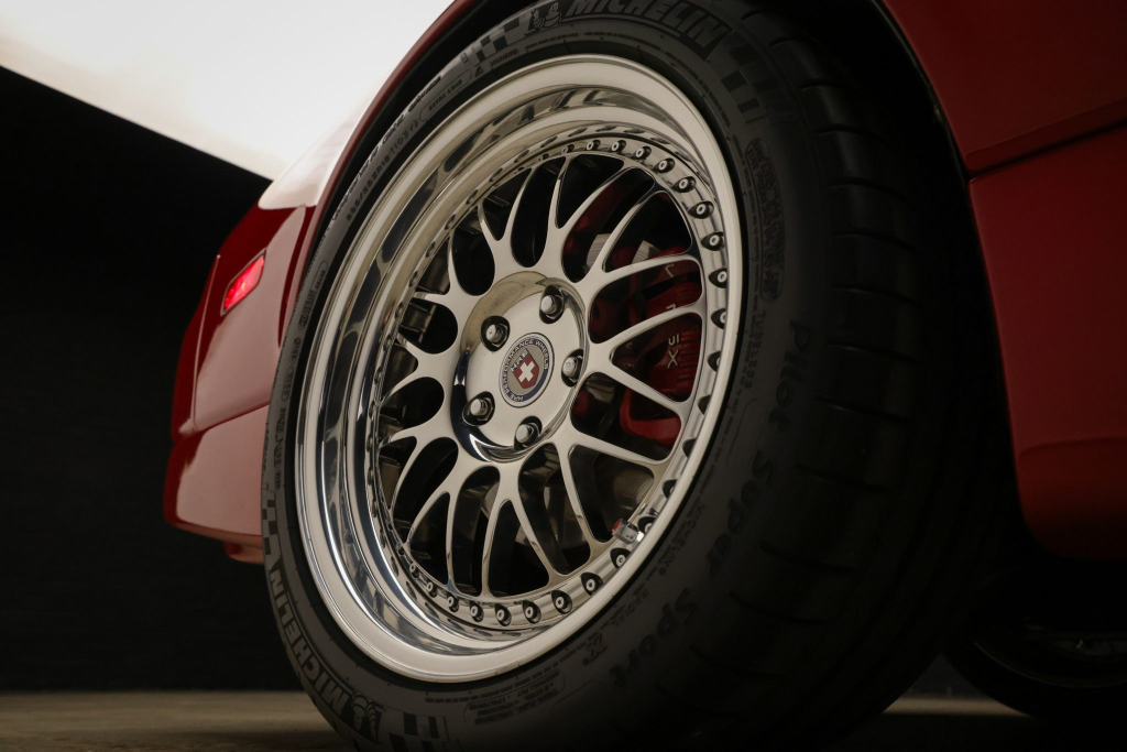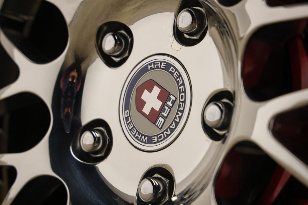 The 17″ and 18″ HRE multi-piece wheels are mounted with Michelin tires. The car features a four-wheel double-wishbone suspension with front and rear stabilizer bars, and braking is handled by red NSX-branded calipers over vented rotors at each corner.