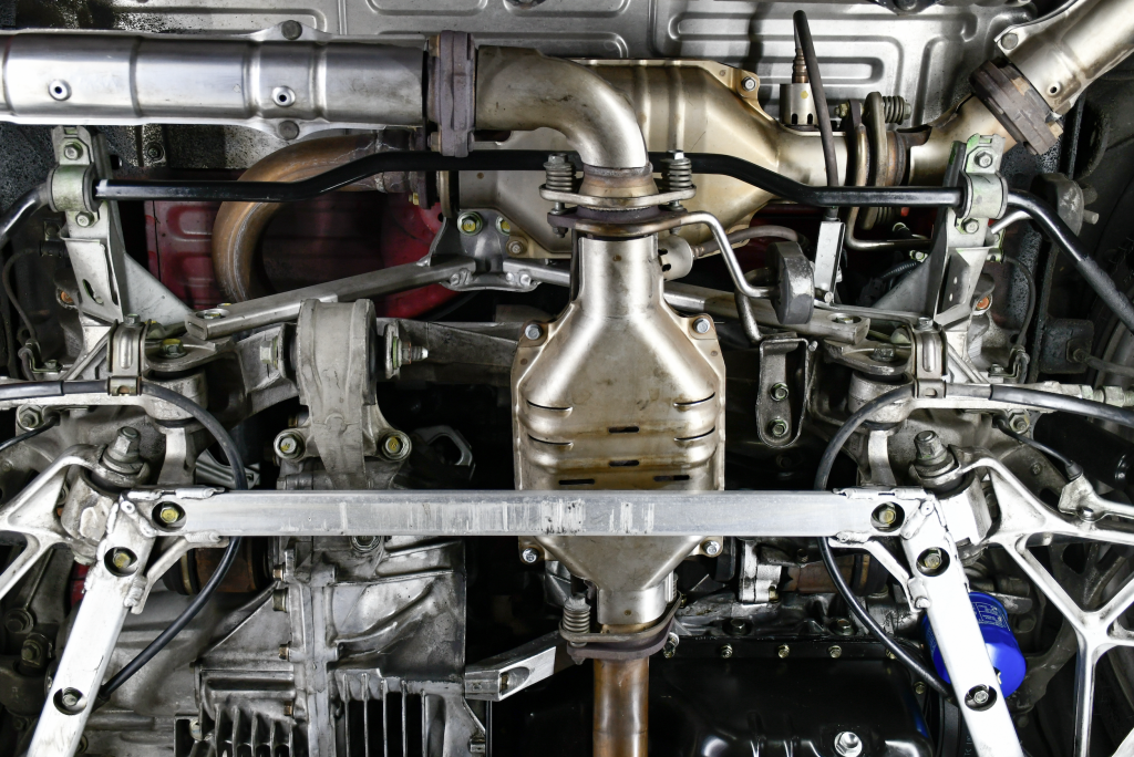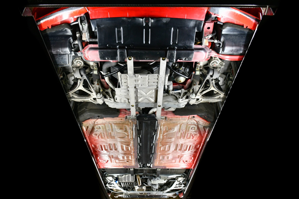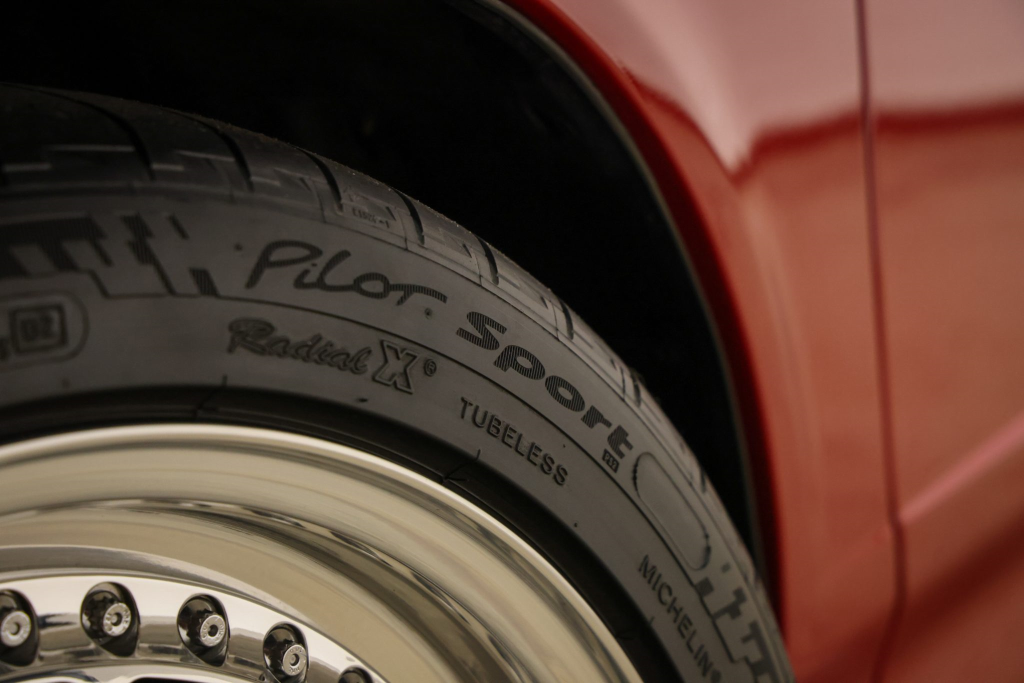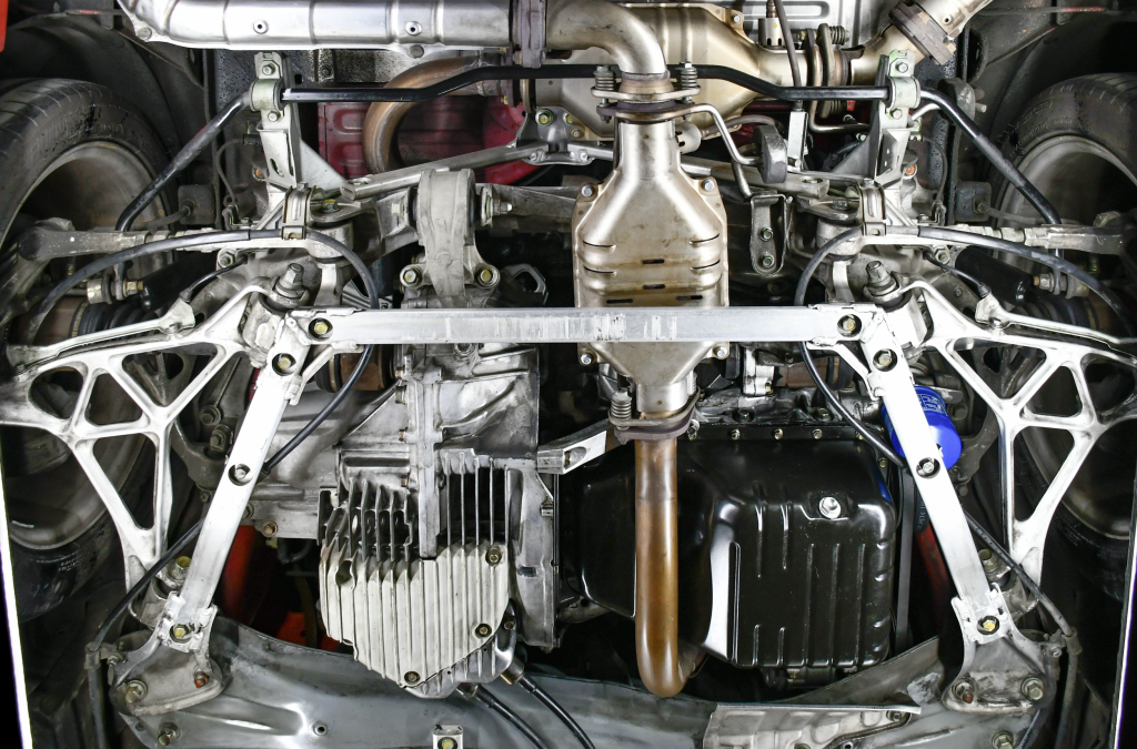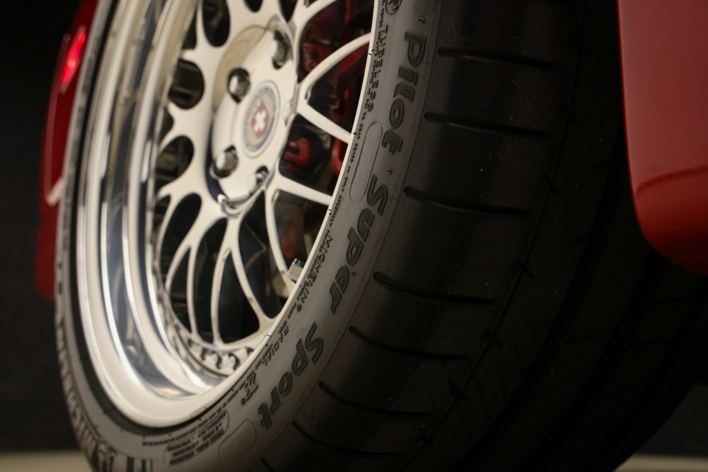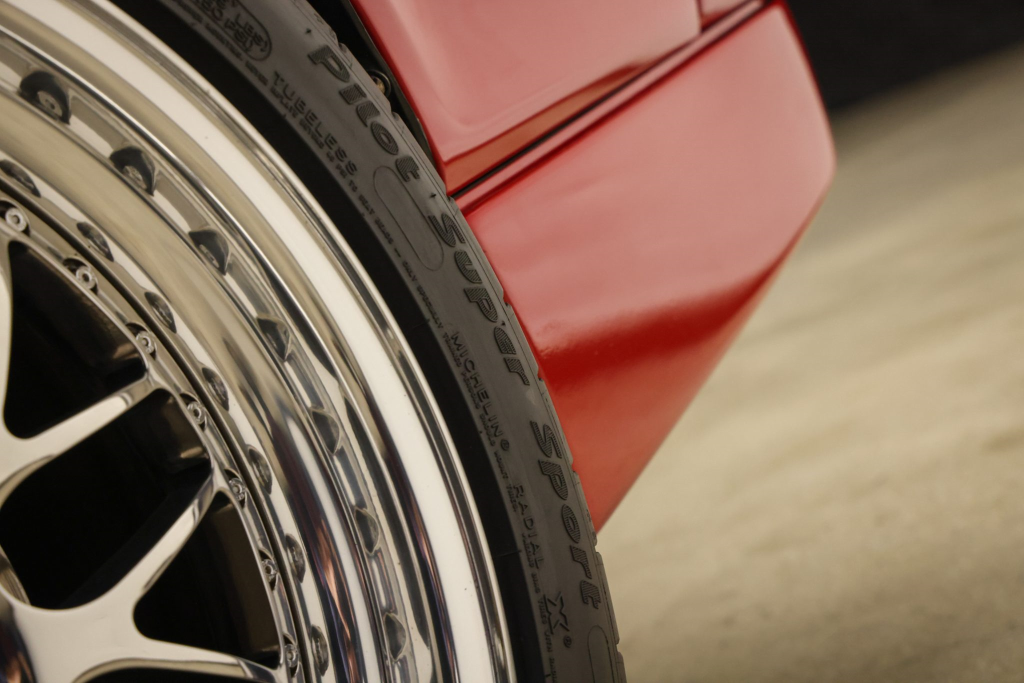 The 17″ and 18″ HRE multi-piece wheels are mounted with Michelin tires. The car features a four-wheel double-wishbone suspension with front and rear stabilizer bars, and braking is handled by red NSX-branded calipers over vented rotors at each corner.