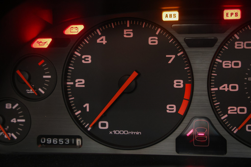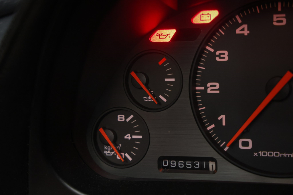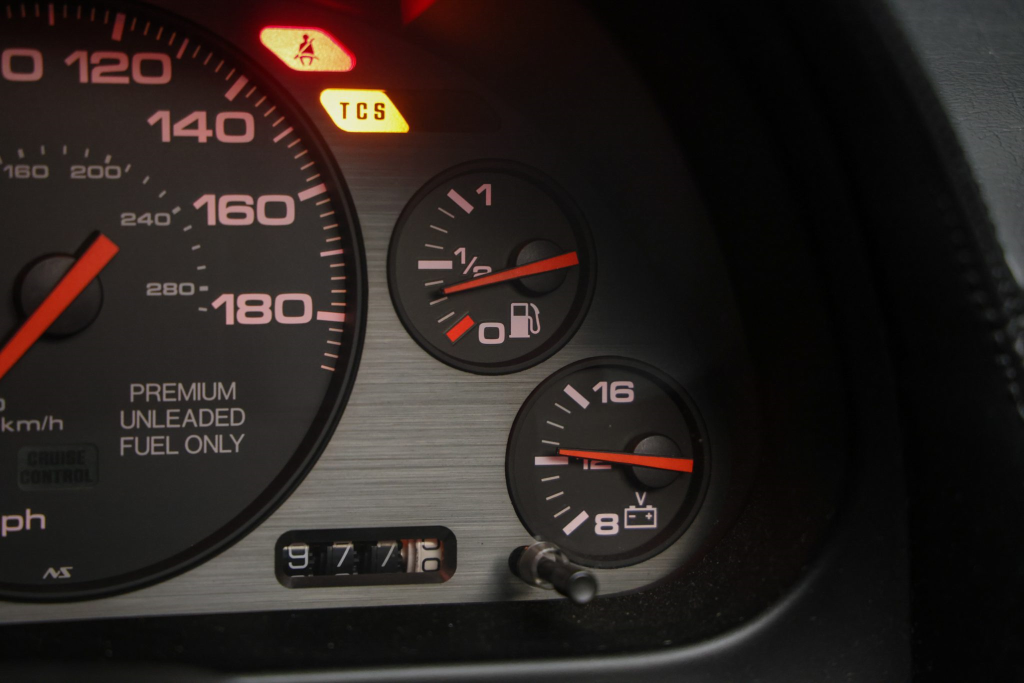 The leather-wrapped steering wheel frames a tachometer with an 8k-rpm redline, a 188-mph speedometer, and gauges for coolant temperature, oil pressure, voltage, and fuel level. The six-digit odometer shows 97k miles, approximately 45k of which were added under current ownership.