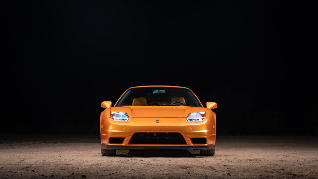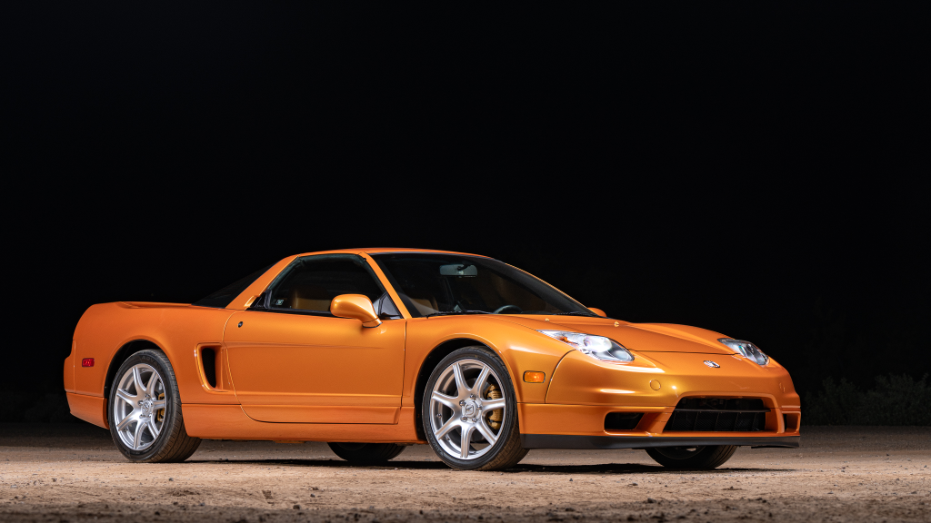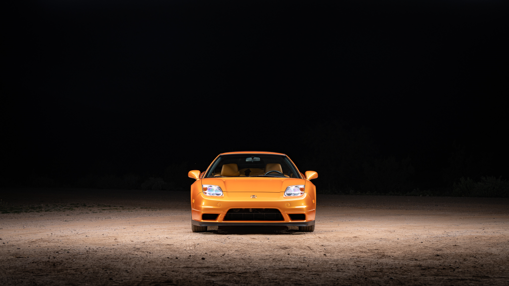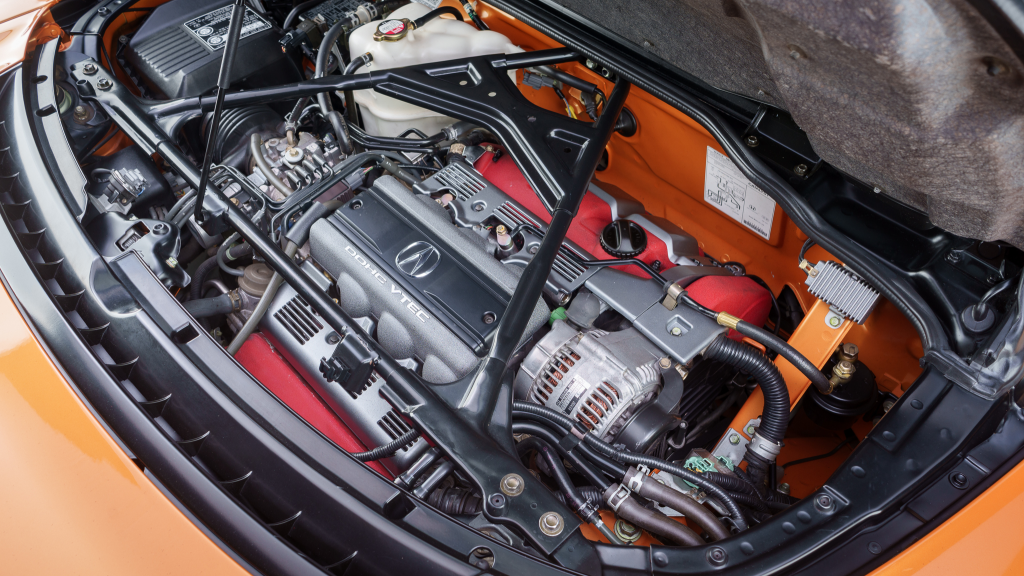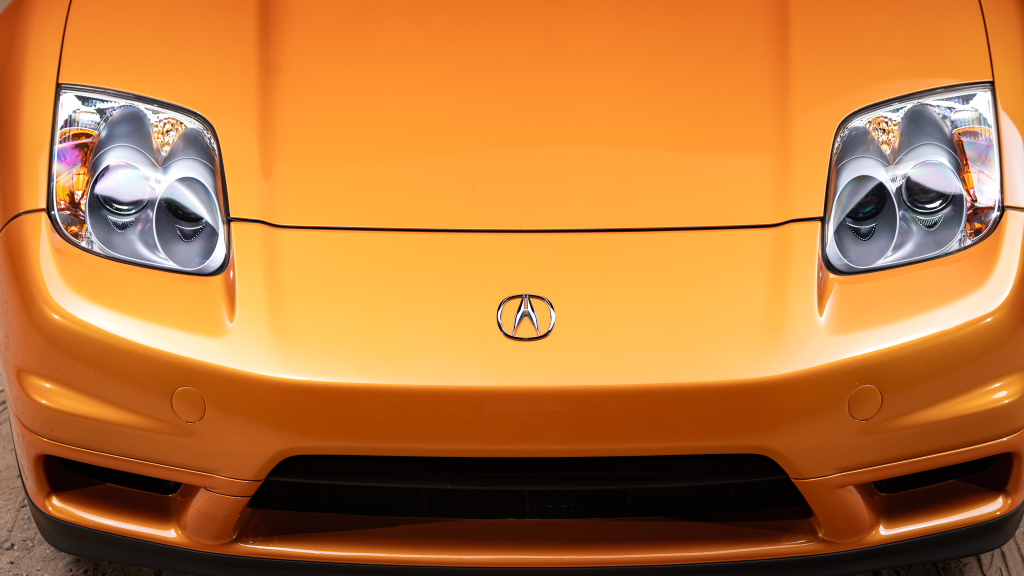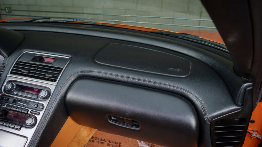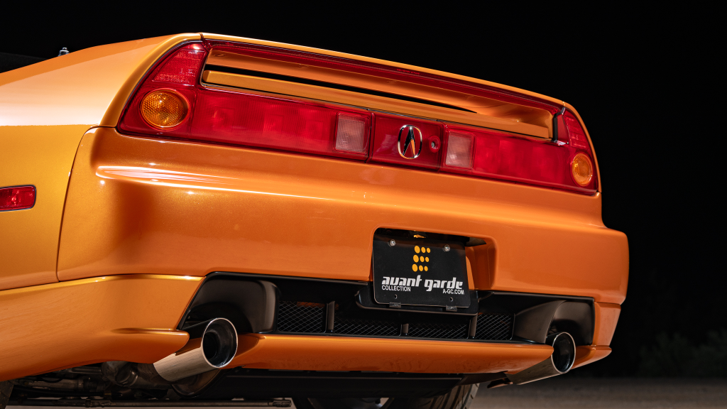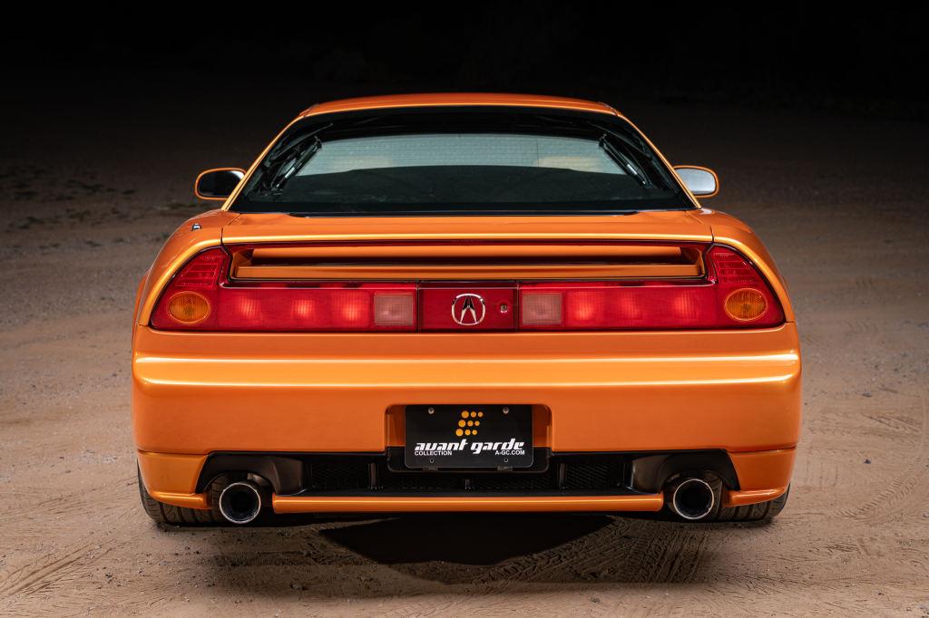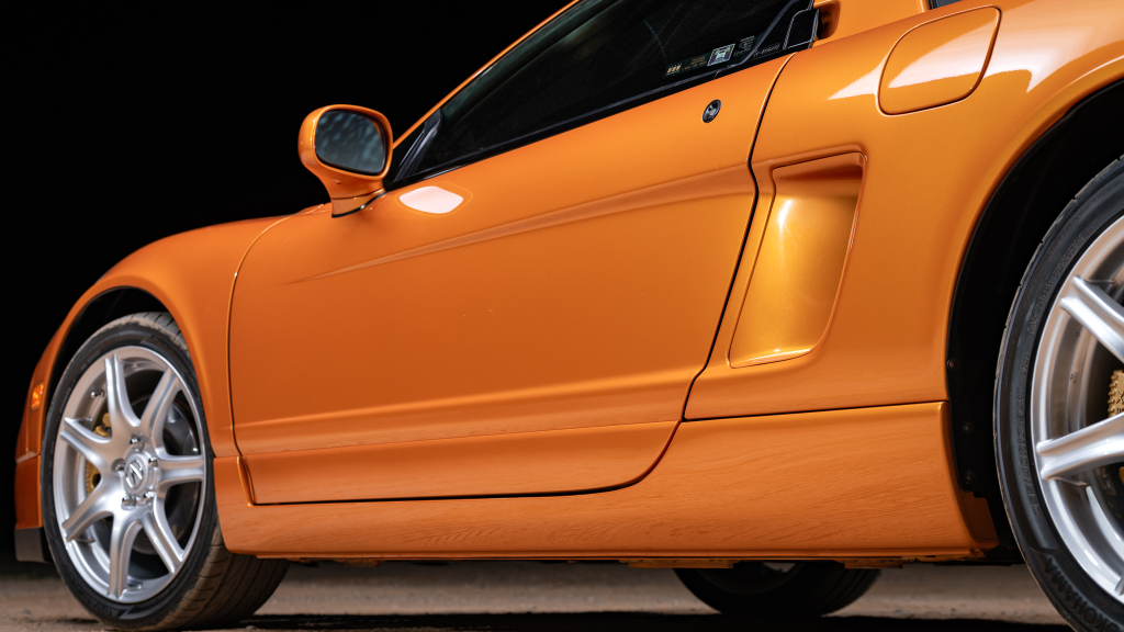 The NSX featured aluminum bodywork, and this example is finished in Imola Orange Pearl with a body-color removable roof panel. Features include xenon headlights, an integrated rear wing with an LED brake light, side air intakes, power-adjustable side mirrors, and dual exhaust outlets. Paint-less dent repair was performed on the body in preparation for the sale, at which time a paint correction was also carried out.