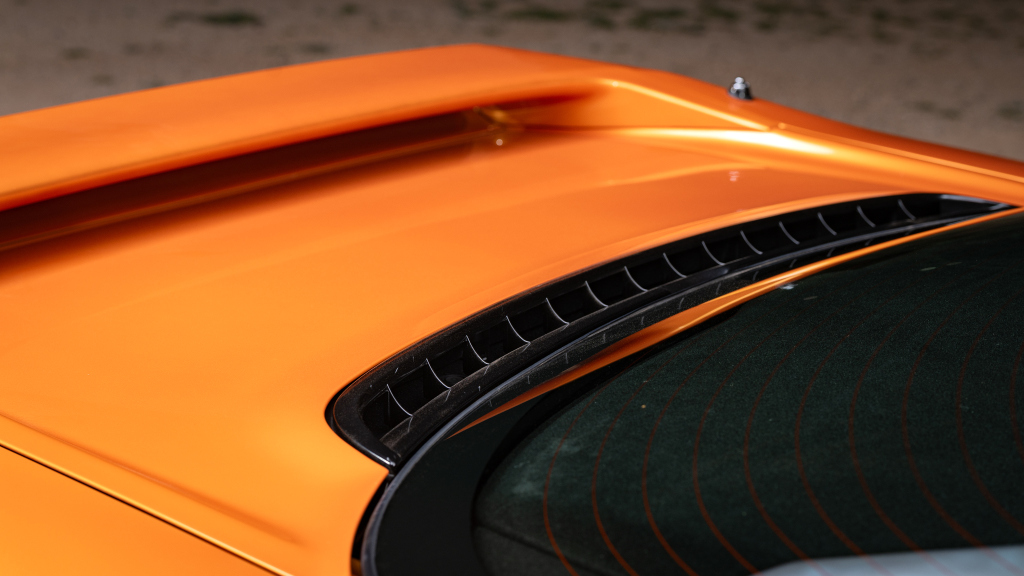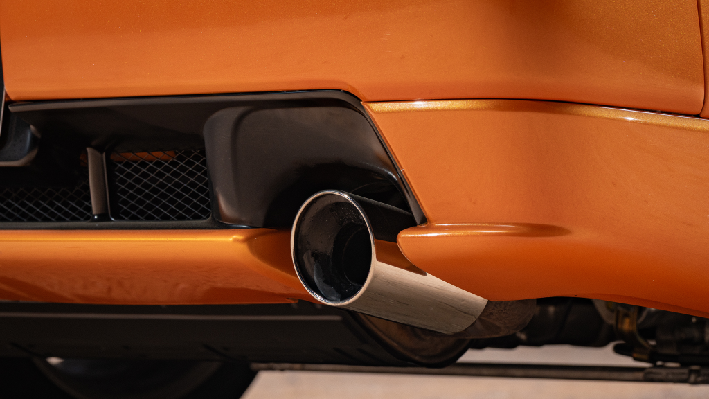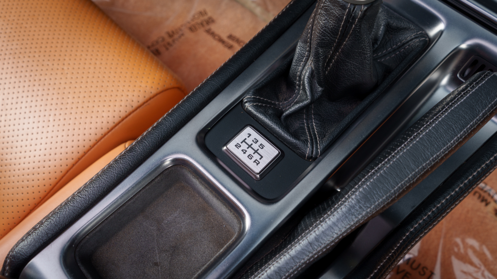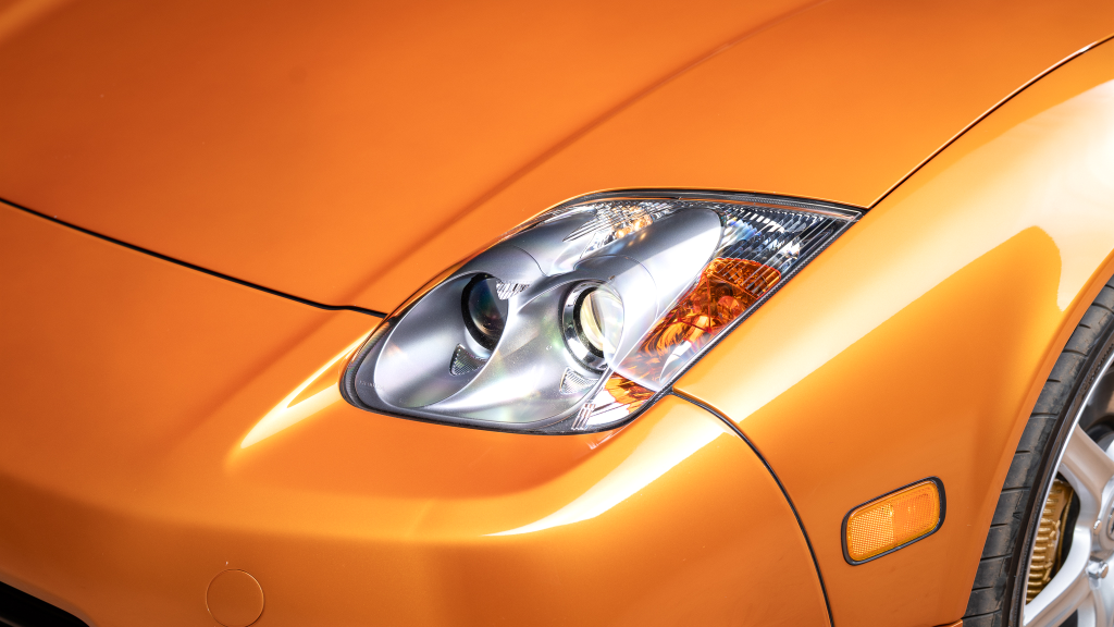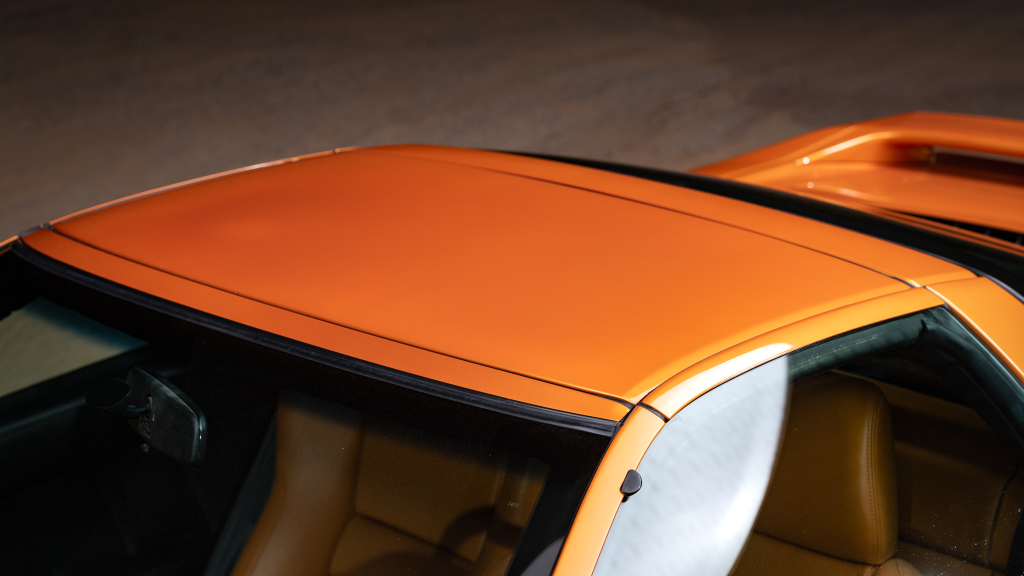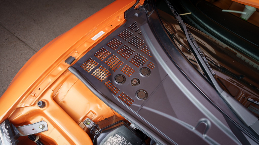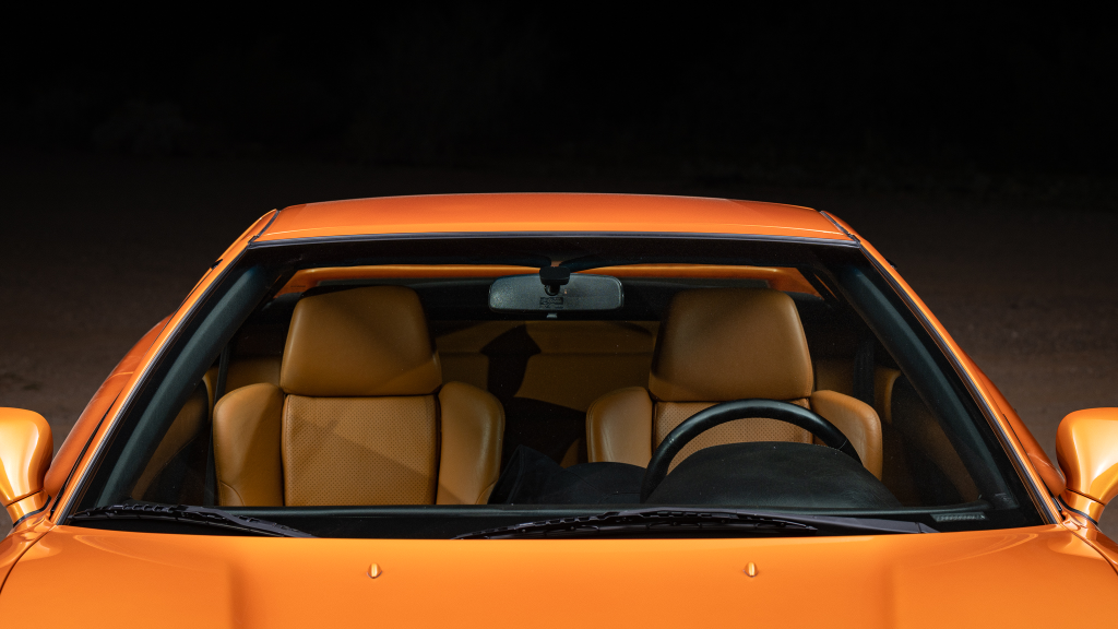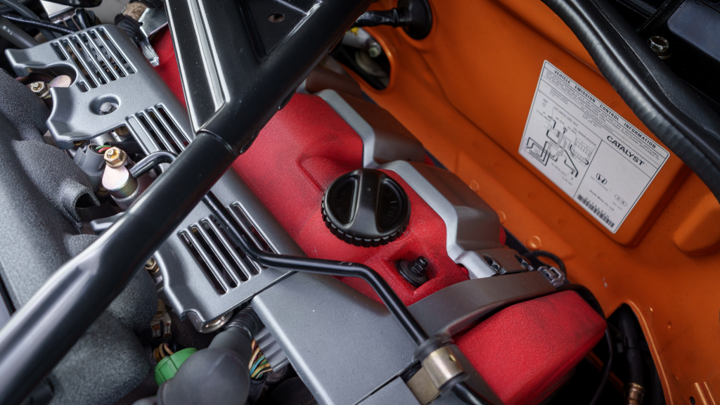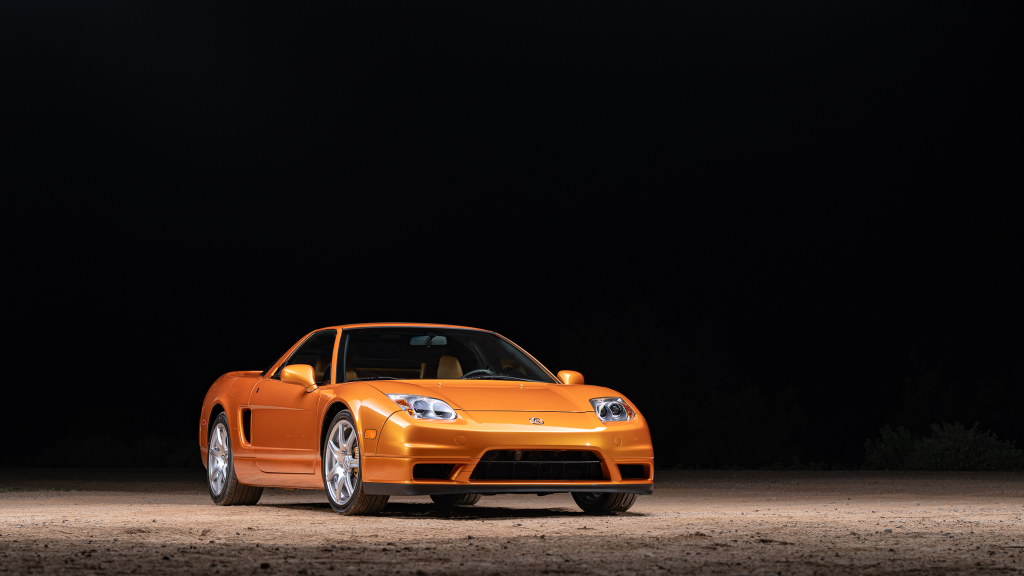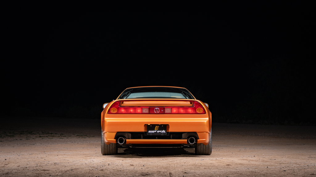 The NSX featured aluminum bodywork, and this example is finished in Imola Orange Pearl with a body-color removable roof panel. Features include xenon headlights, an integrated rear wing with an LED brake light, side air intakes, power-adjustable side mirrors, and dual exhaust outlets. Paint-less dent repair was performed on the body in preparation for the sale, at which time a paint correction was also carried out.
