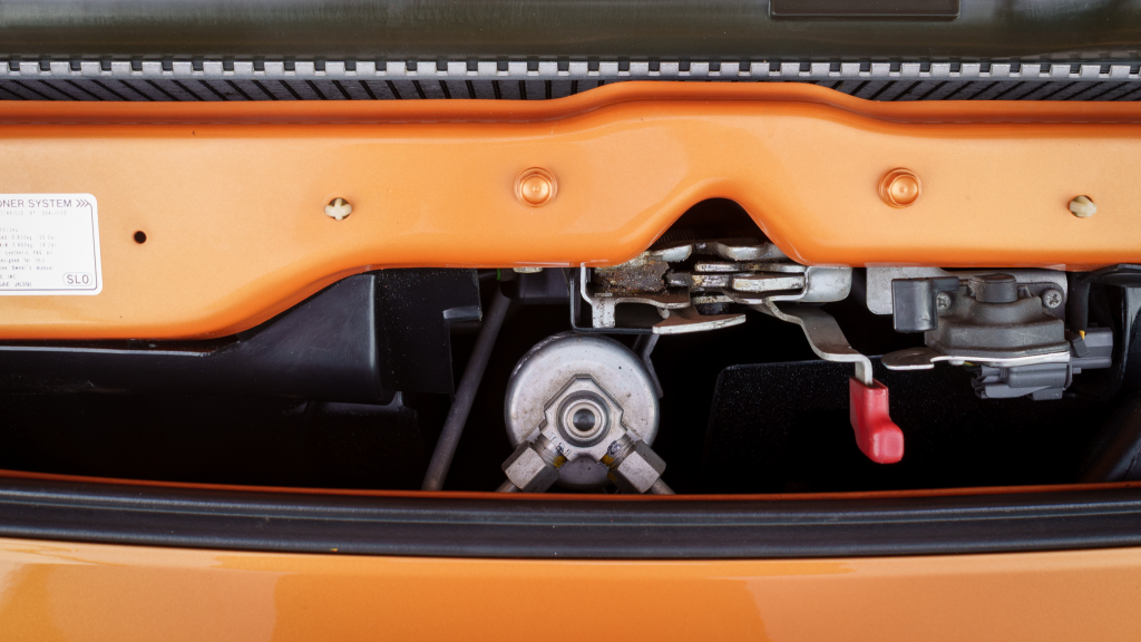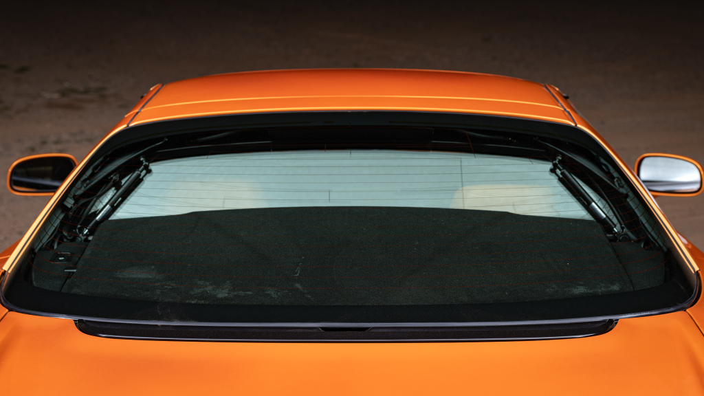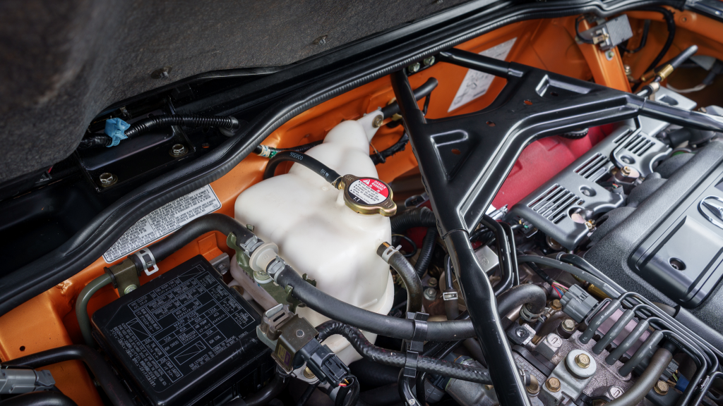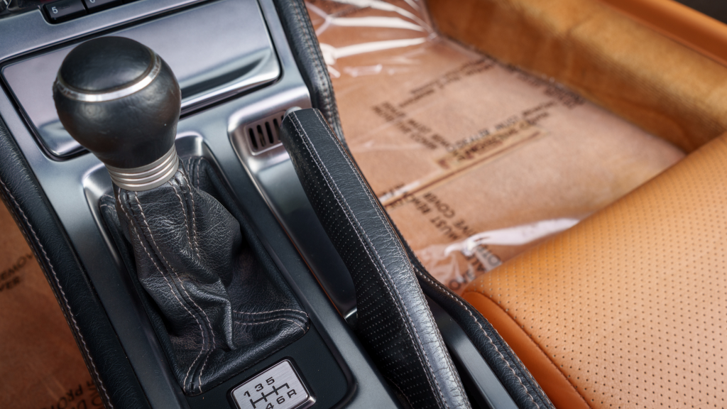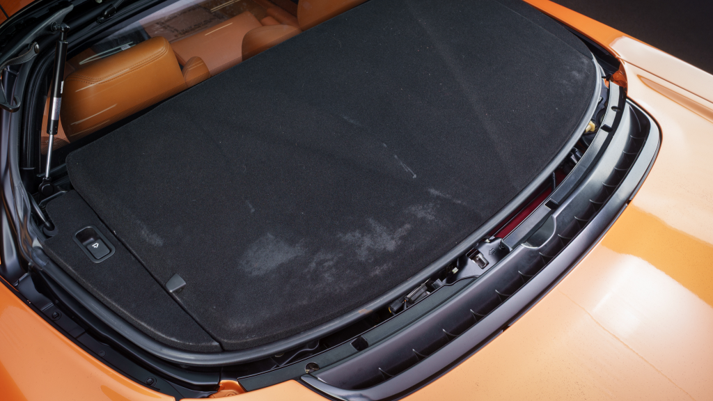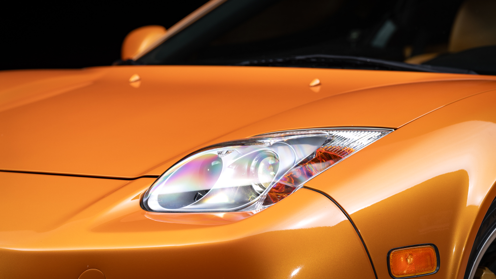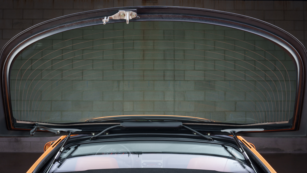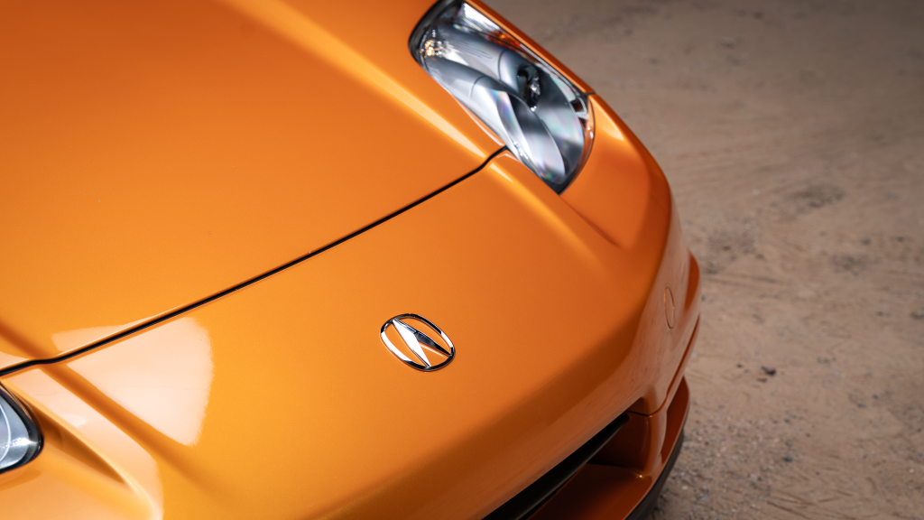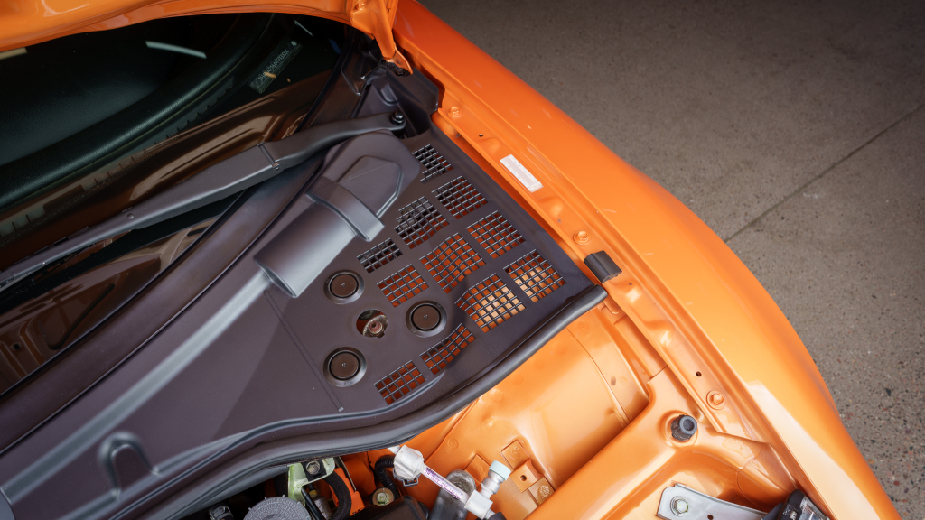 The NSX featured aluminum bodywork, and this example is finished in Imola Orange Pearl with a body-color removable roof panel. Features include xenon headlights, an integrated rear wing with an LED brake light, side air intakes, power-adjustable side mirrors, and dual exhaust outlets. Paint-less dent repair was performed on the body in preparation for the sale, at which time a paint correction was also carried out.