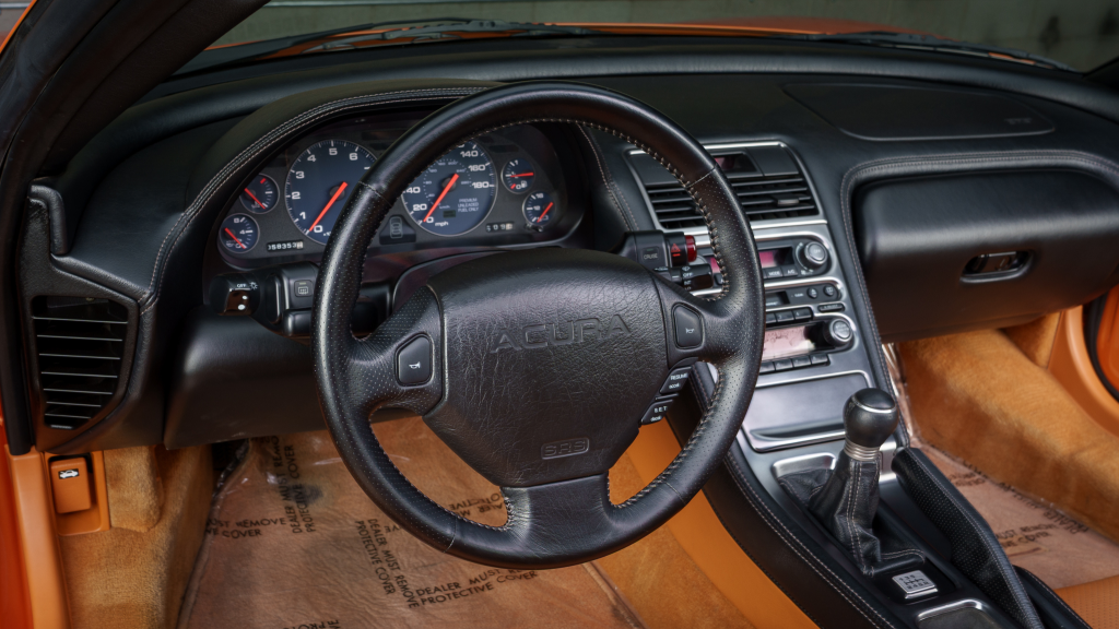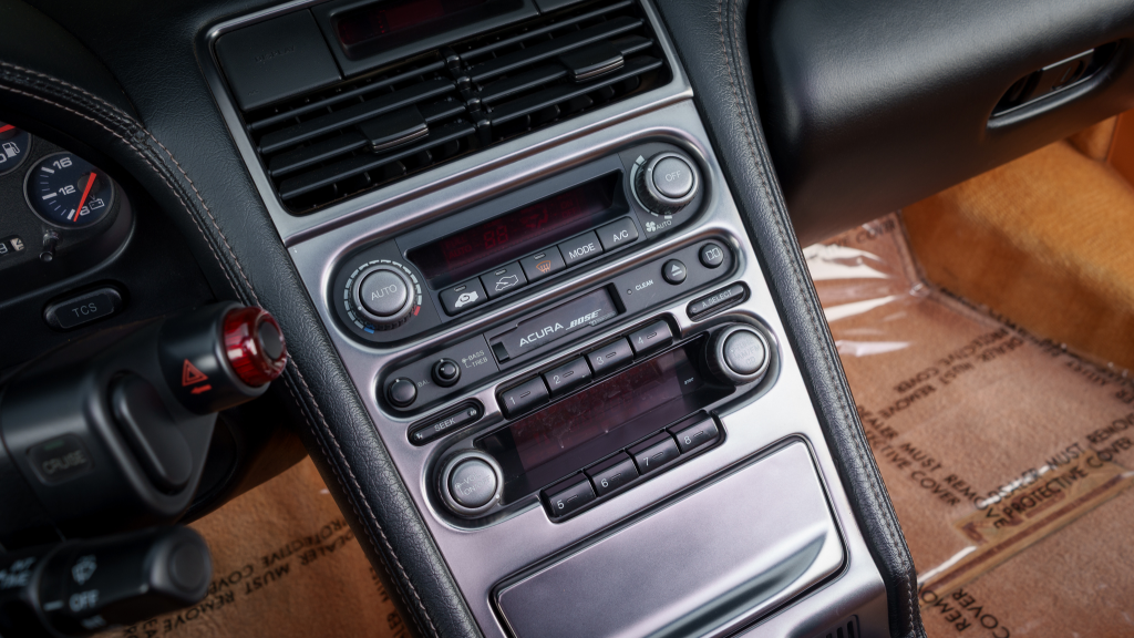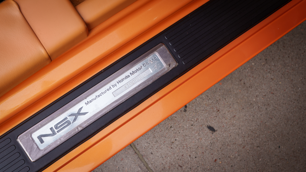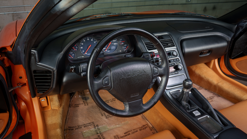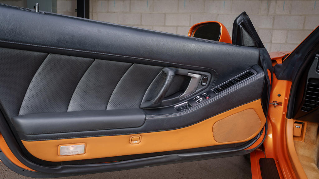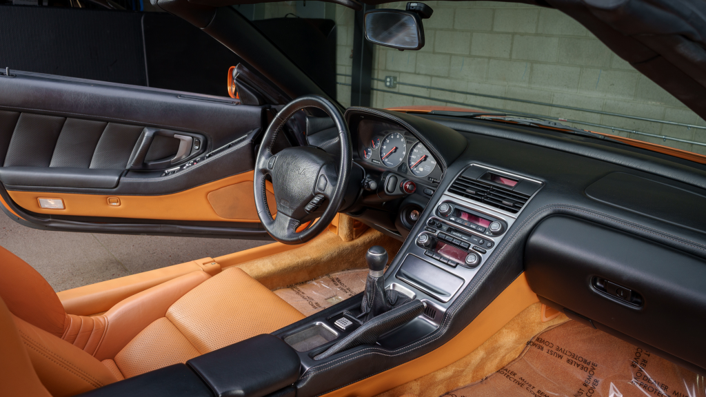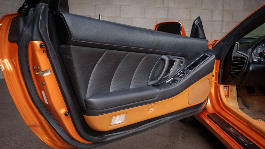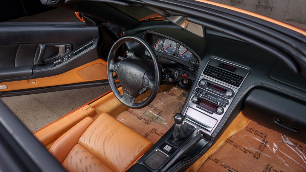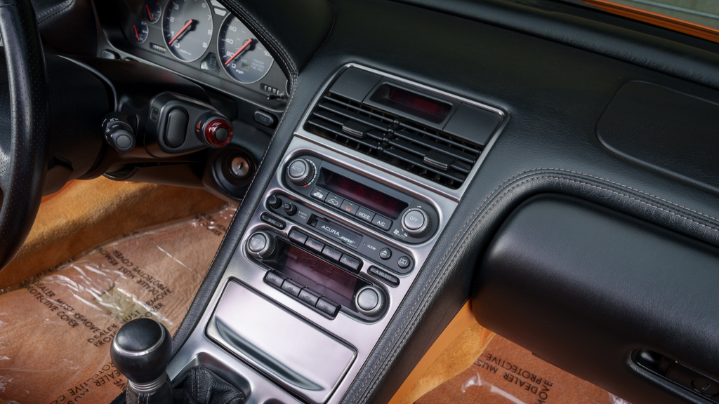 The cabin features power-adjustable sport seats upholstered in orange leather, while NSX-branded floor mats line the footwells. Interior appointments include automatic climate control, cruise control, a Bose sound system, and a cassette stereo. The stainless-steel door sill plates are stamped with the car’s serial number.