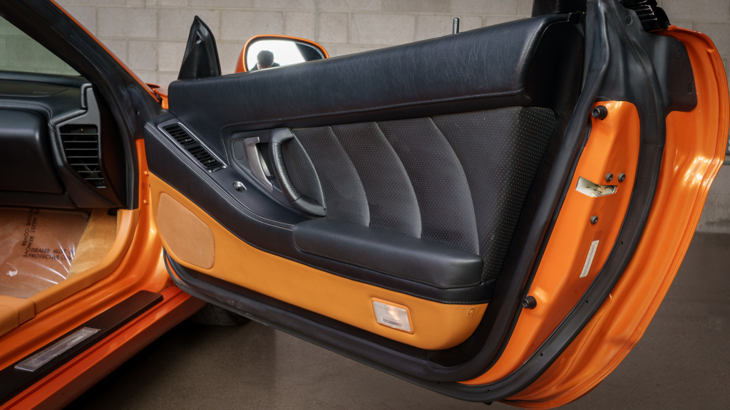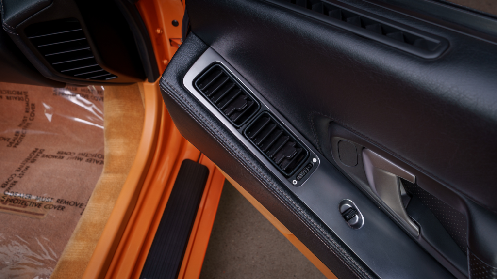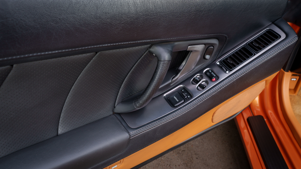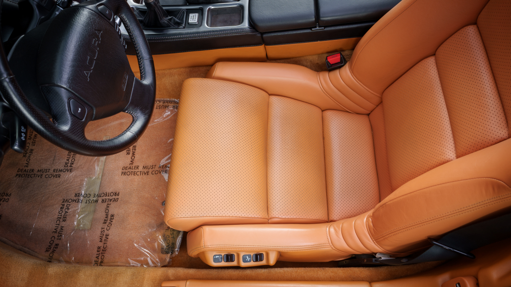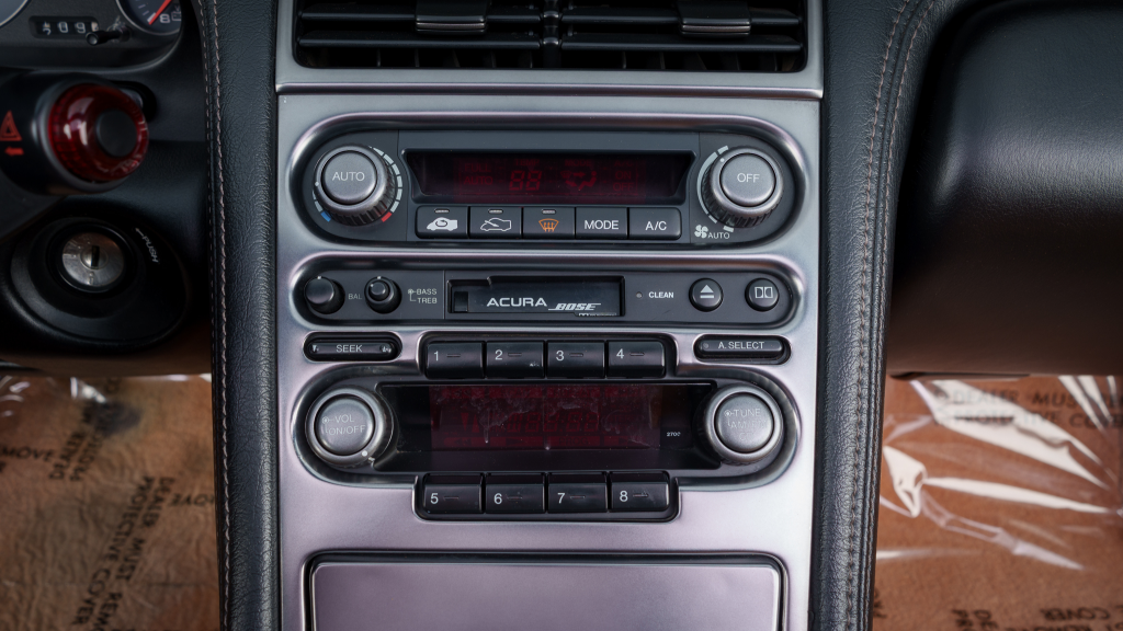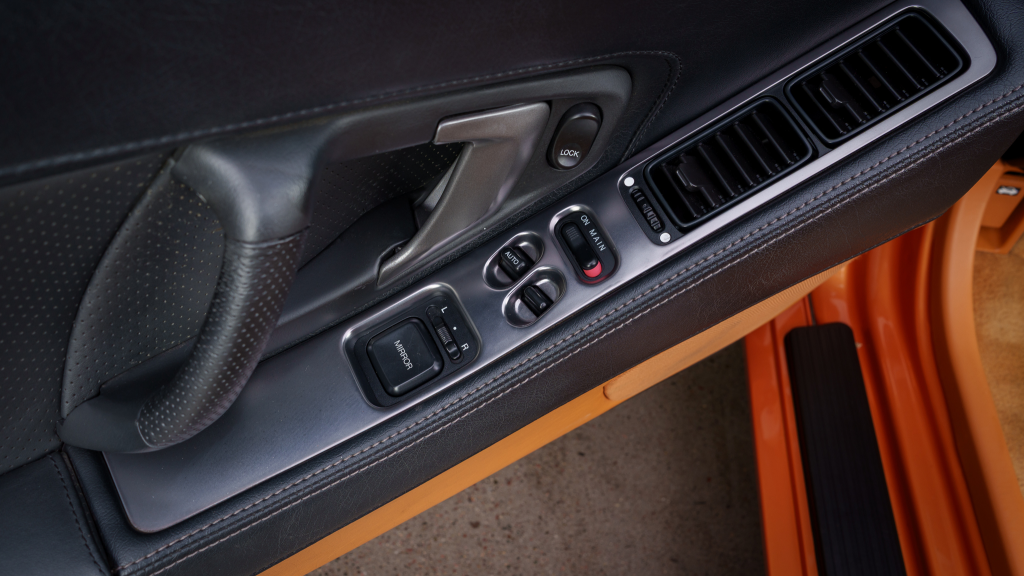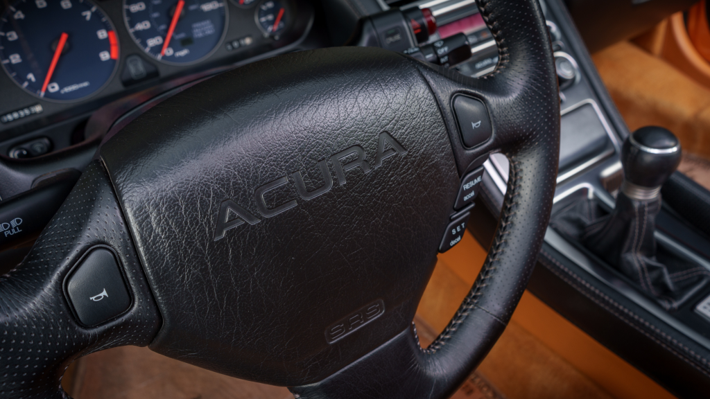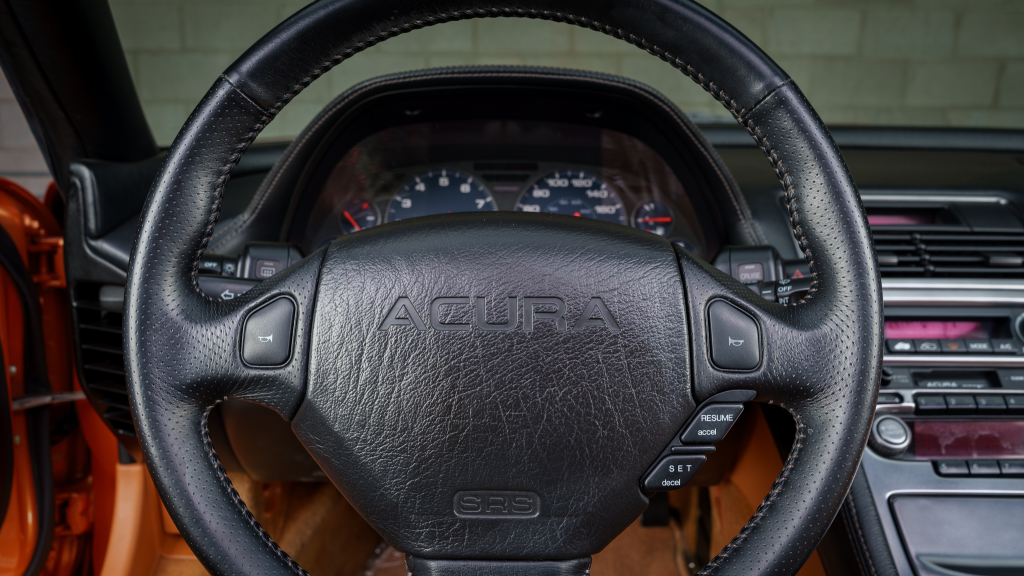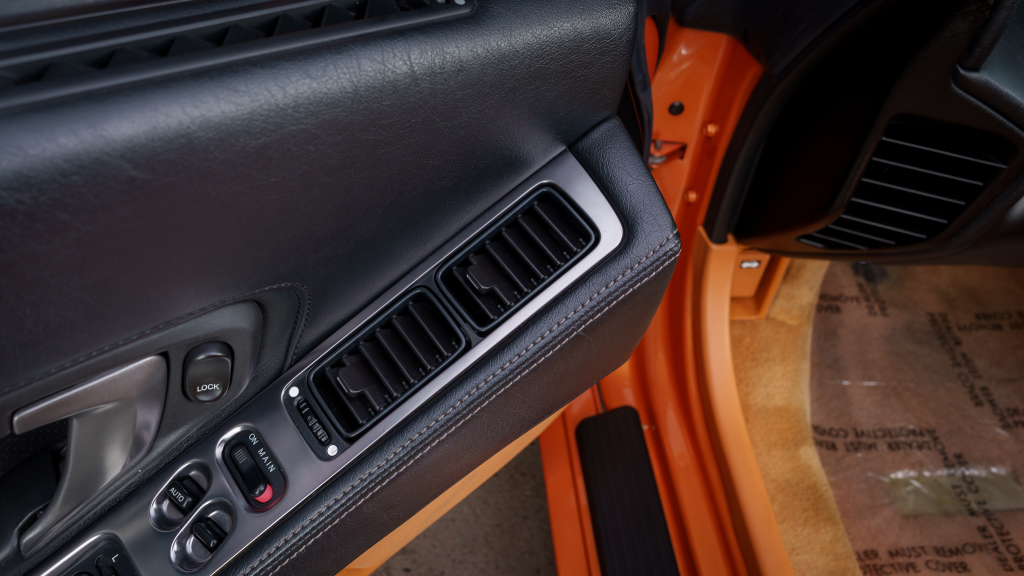 The cabin features power-adjustable sport seats upholstered in orange leather, while NSX-branded floor mats line the footwells. Interior appointments include automatic climate control, cruise control, a Bose sound system, and a cassette stereo. The stainless-steel door sill plates are stamped with the car’s serial number.