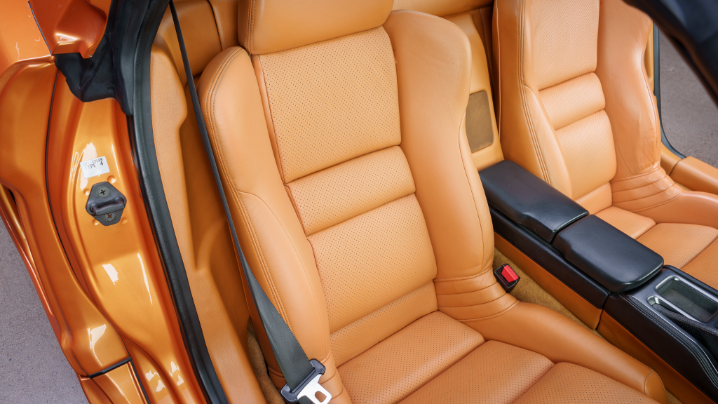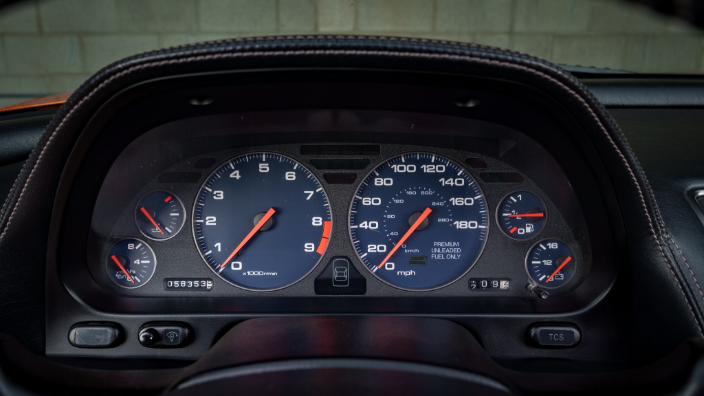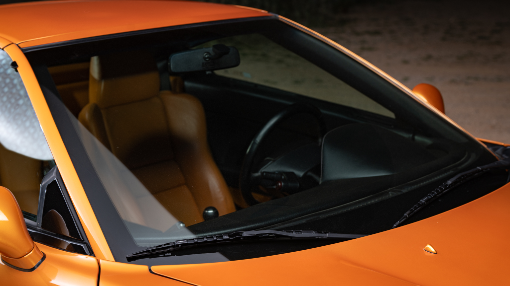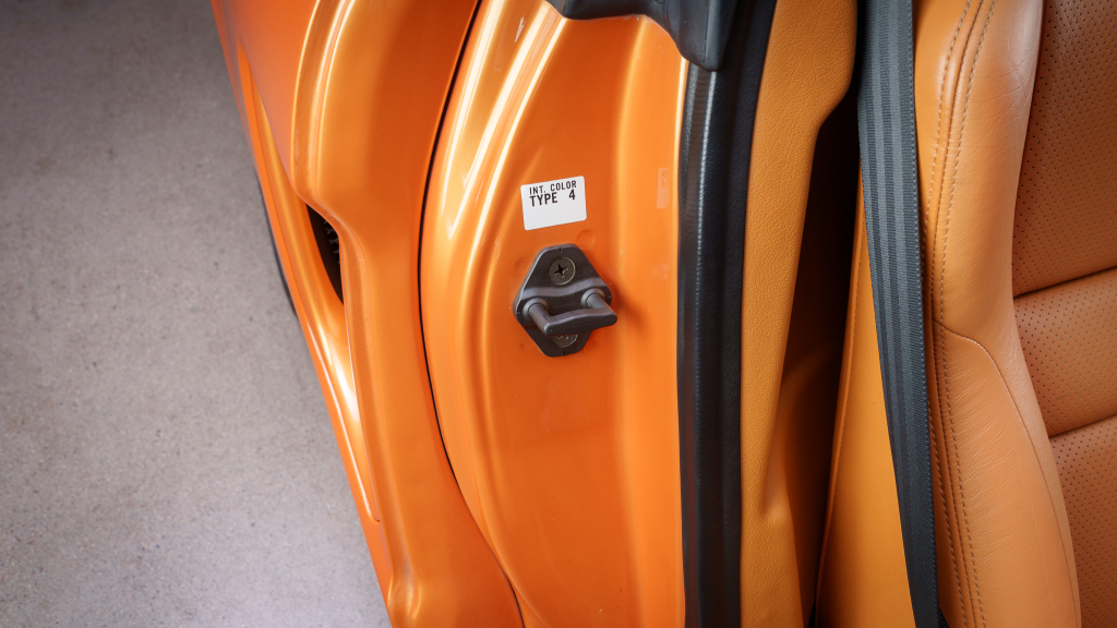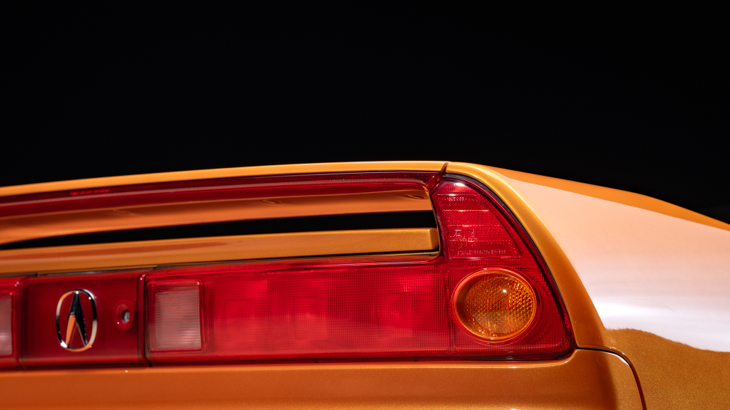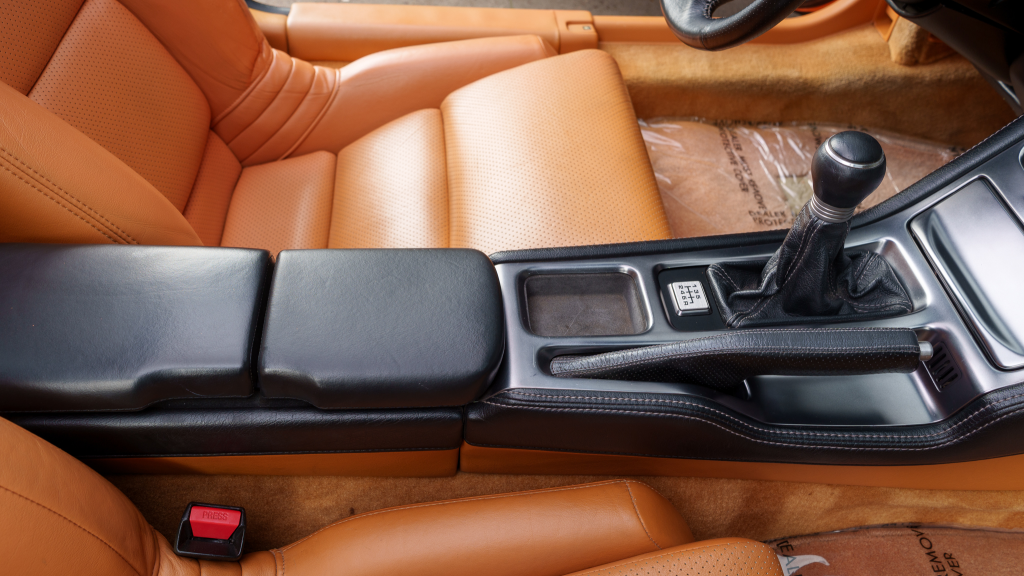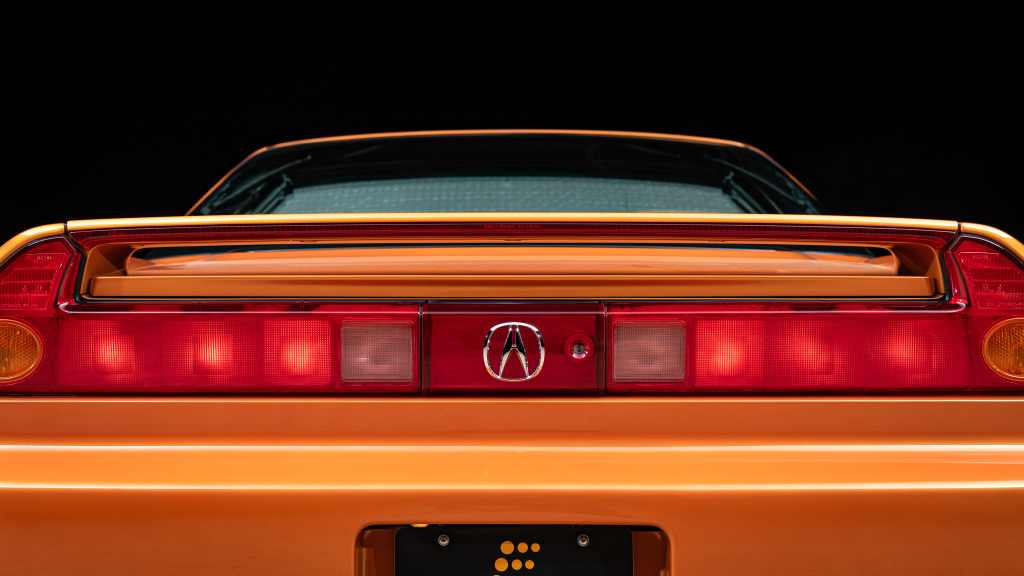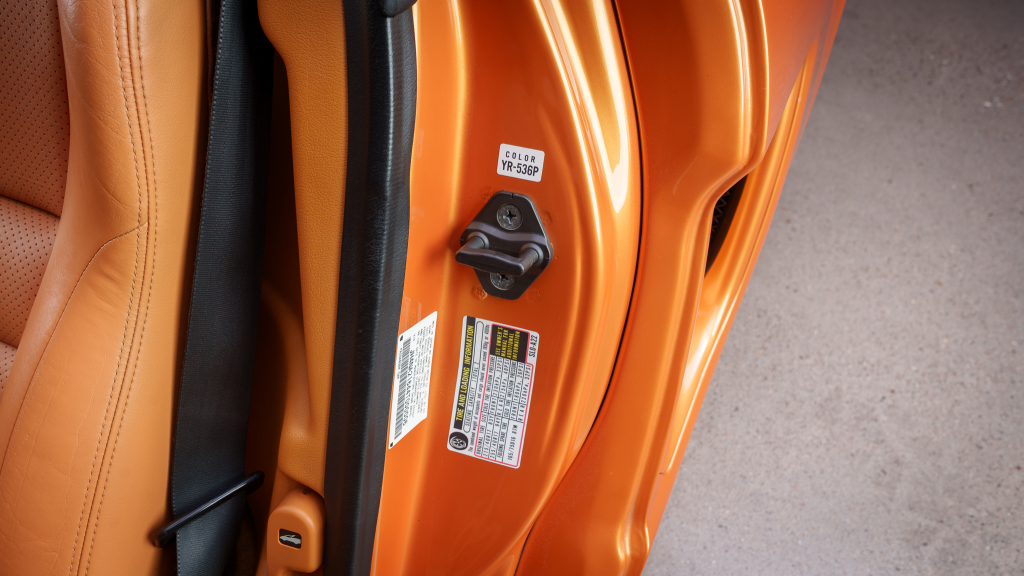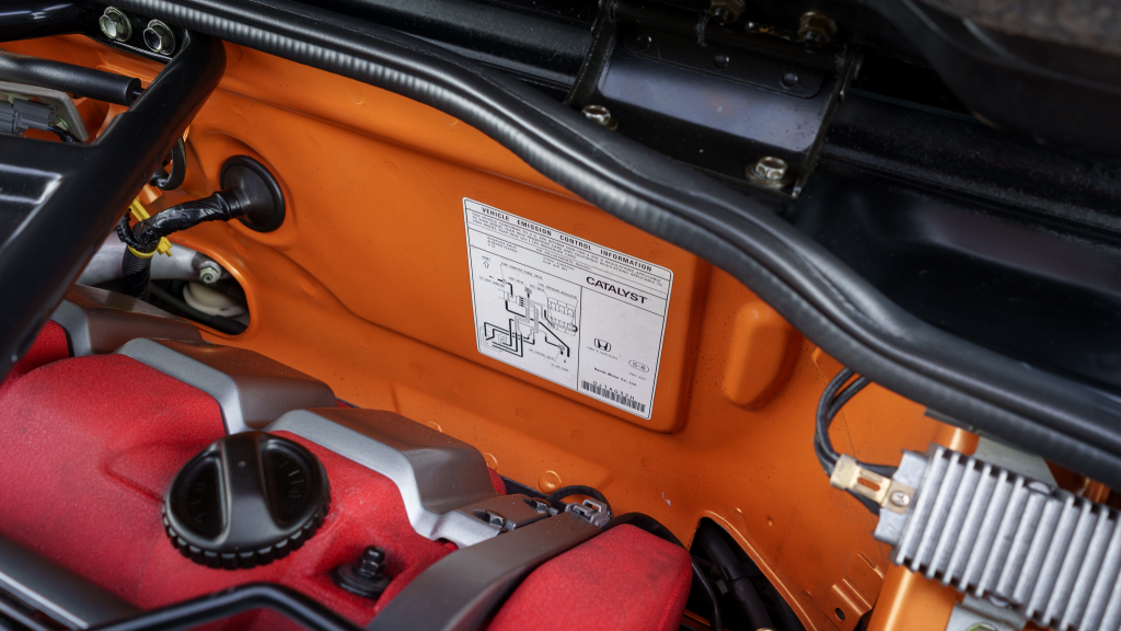 The cabin features power-adjustable sport seats upholstered in orange leather, while NSX-branded floor mats line the footwells. Interior appointments include automatic climate control, cruise control, a Bose sound system, and a cassette stereo. The stainless-steel door sill plates are stamped with the car’s serial number.