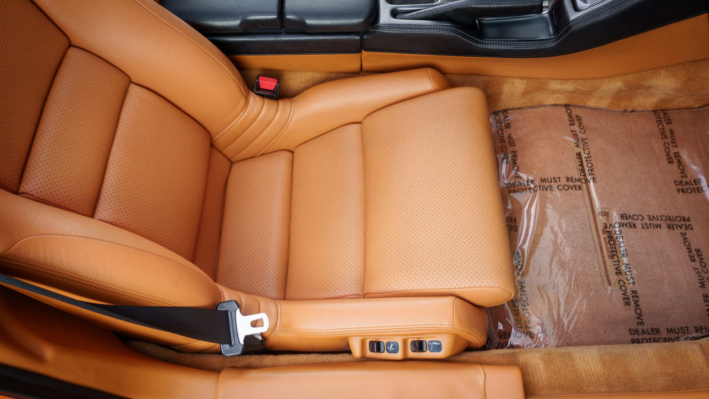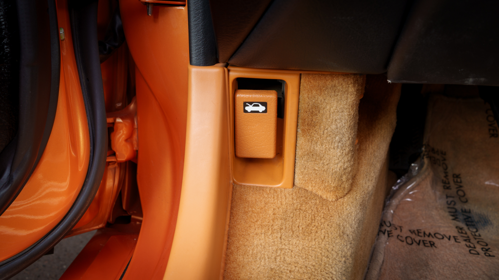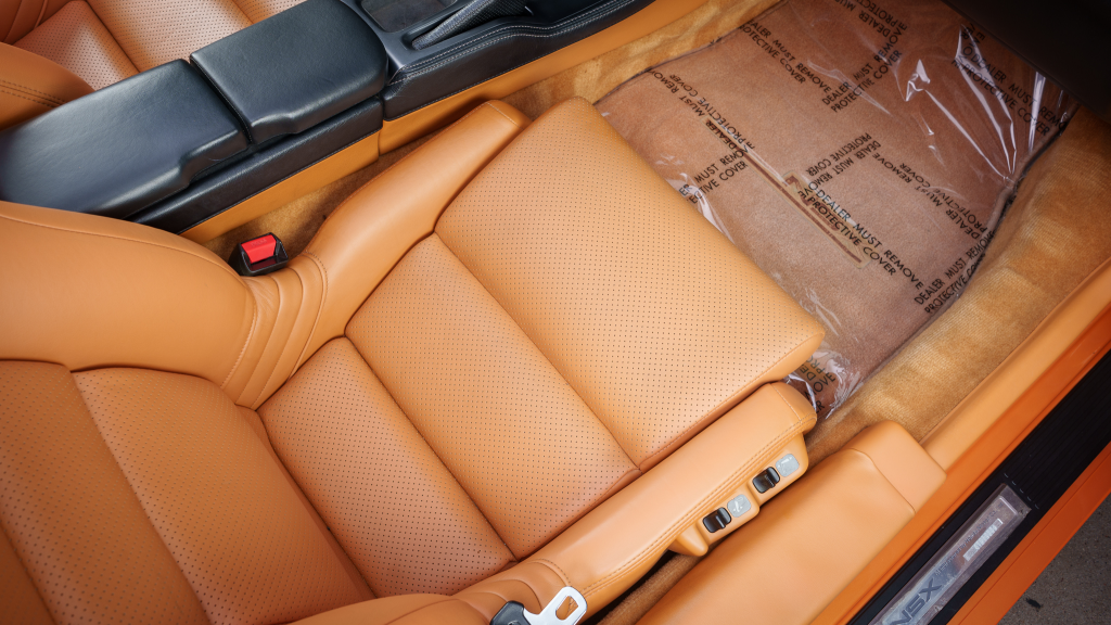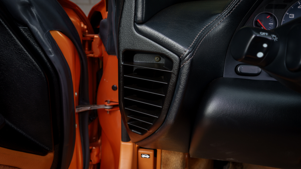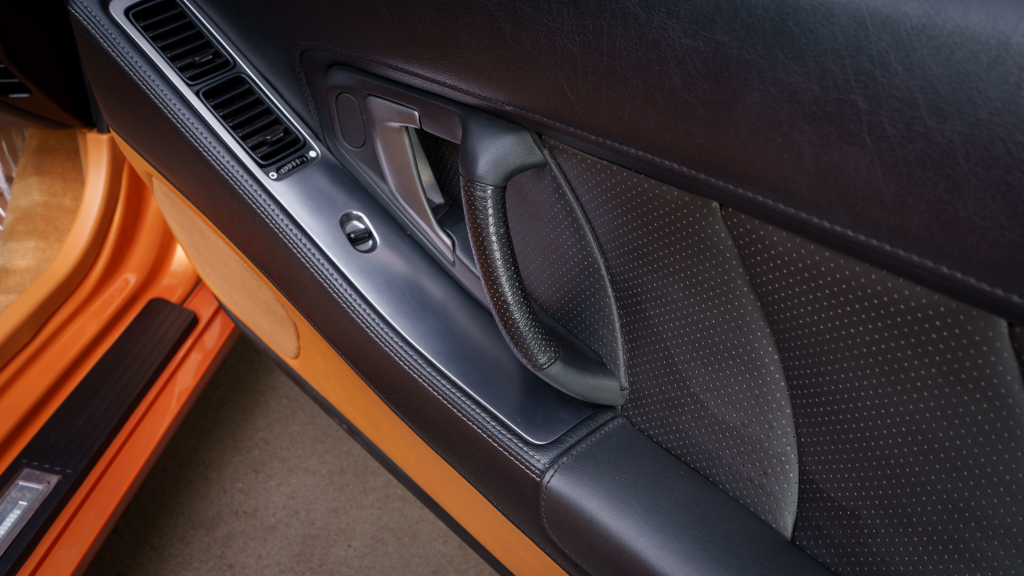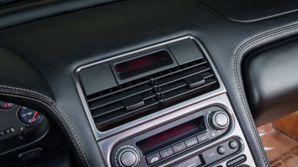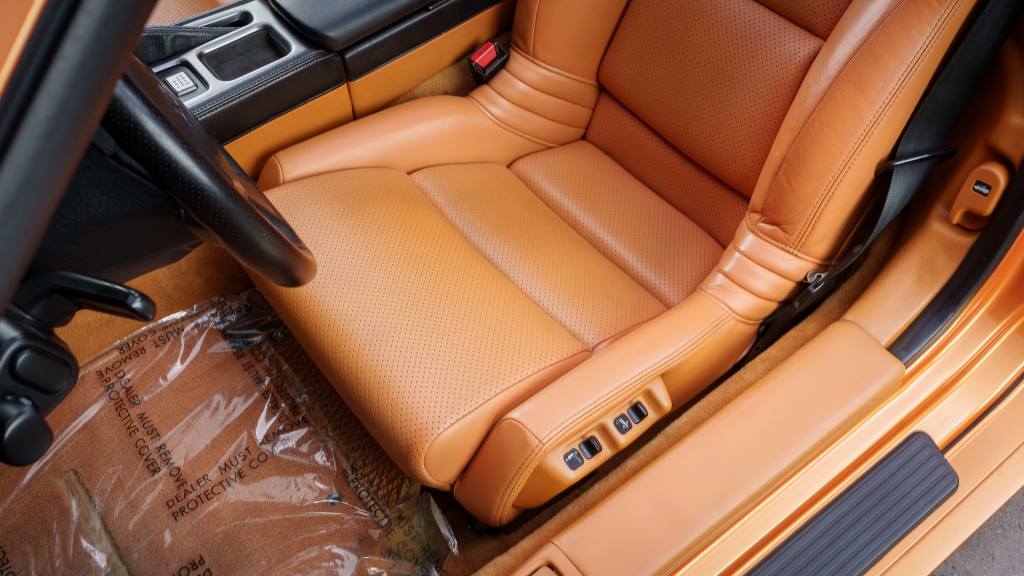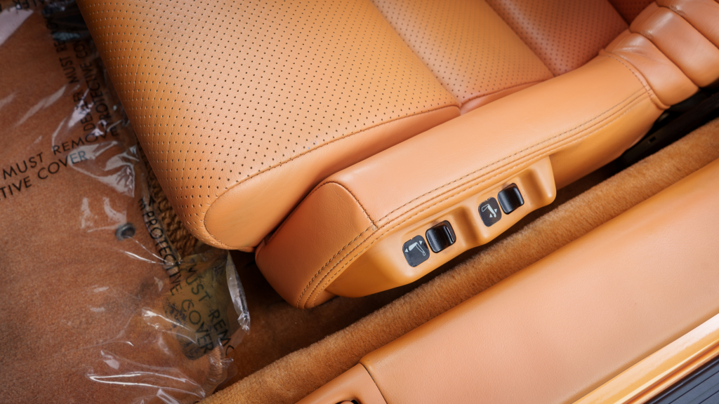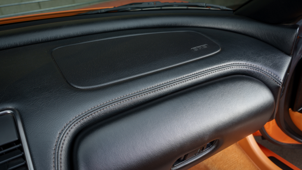 The cabin features power-adjustable sport seats upholstered in orange leather, while NSX-branded floor mats line the footwells. Interior appointments include automatic climate control, cruise control, a Bose sound system, and a cassette stereo. The stainless-steel door sill plates are stamped with the car’s serial number.