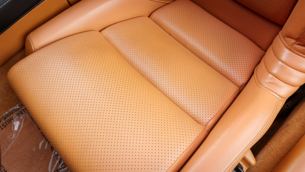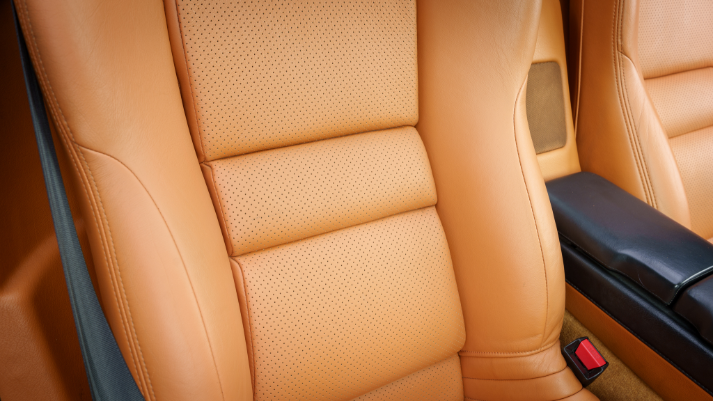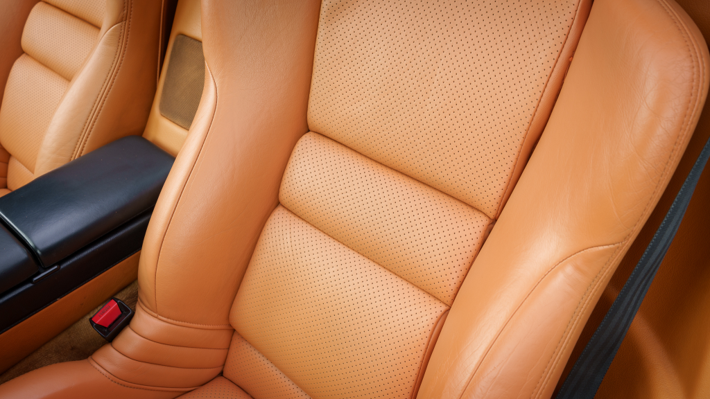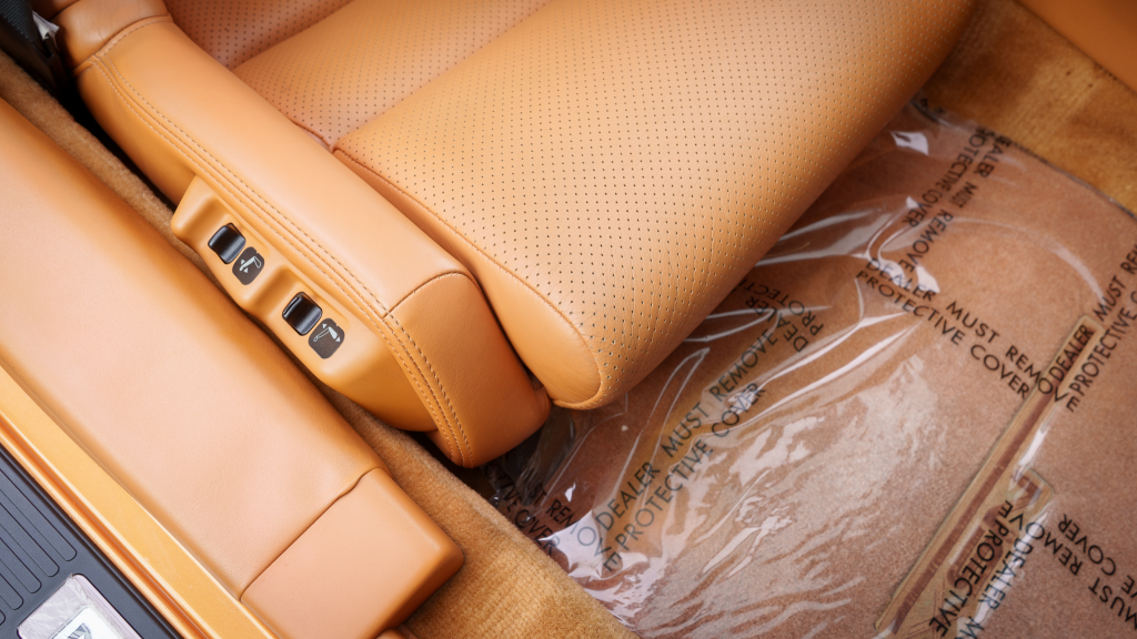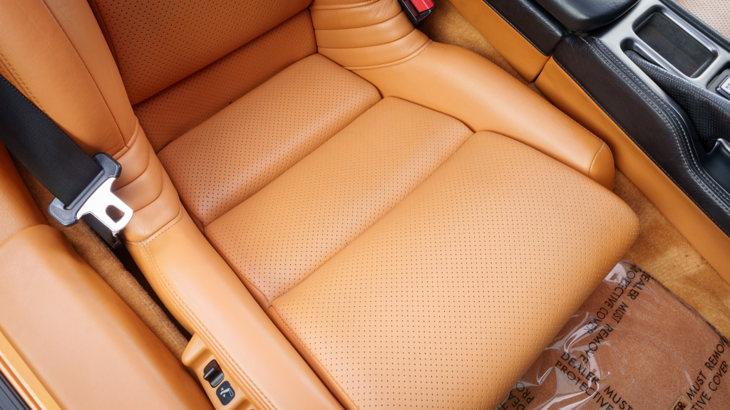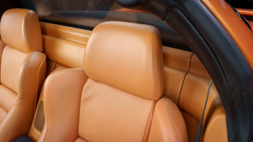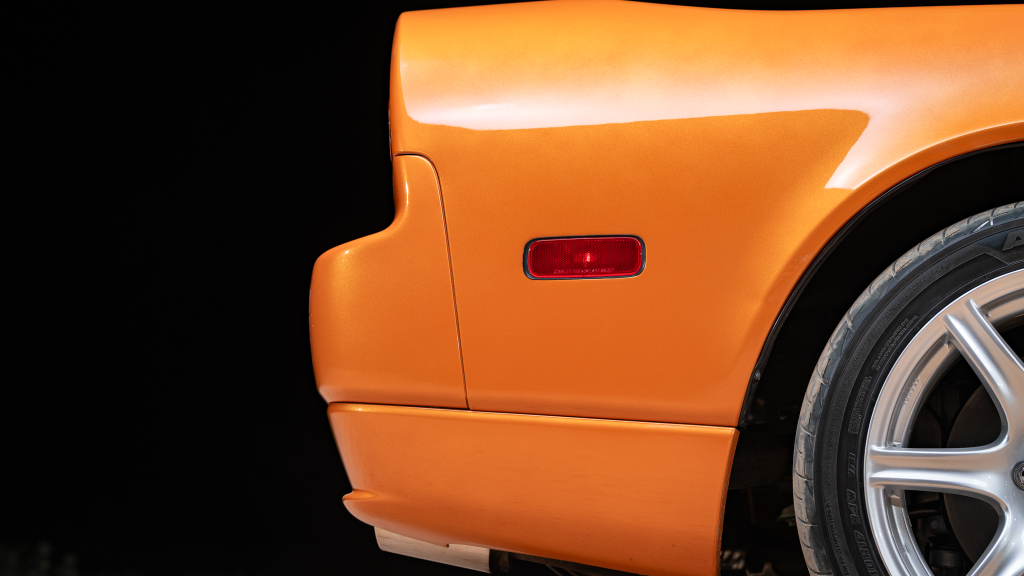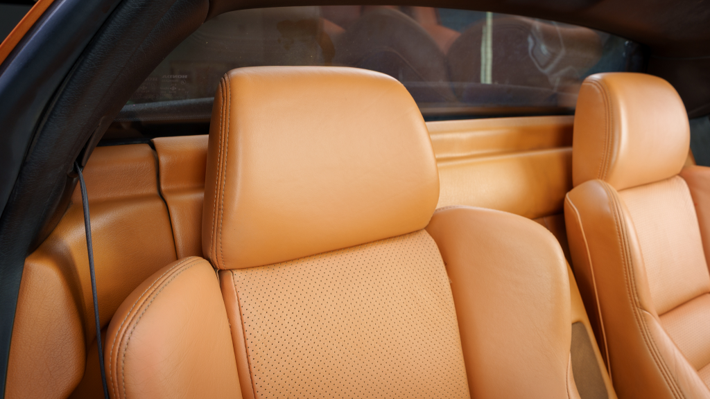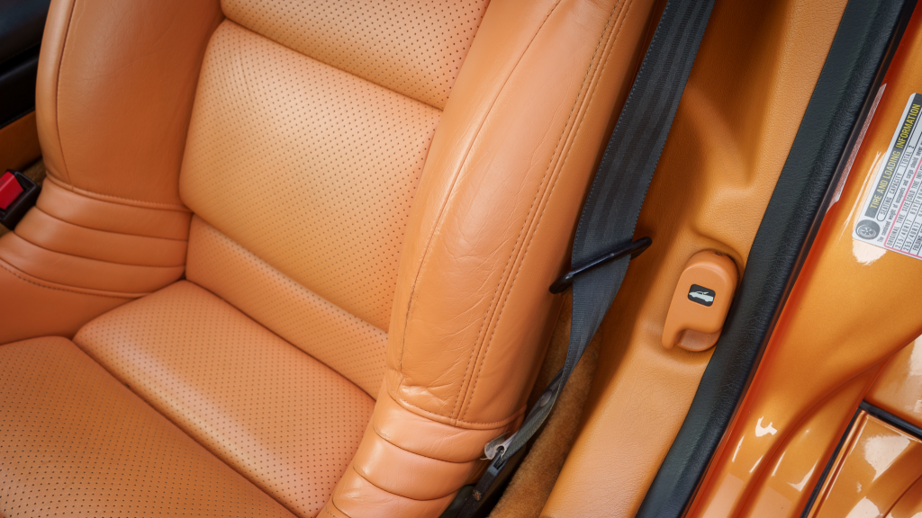 The cabin features power-adjustable sport seats upholstered in orange leather, while NSX-branded floor mats line the footwells. Interior appointments include automatic climate control, cruise control, a Bose sound system, and a cassette stereo. The stainless-steel door sill plates are stamped with the car’s serial number.