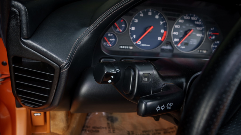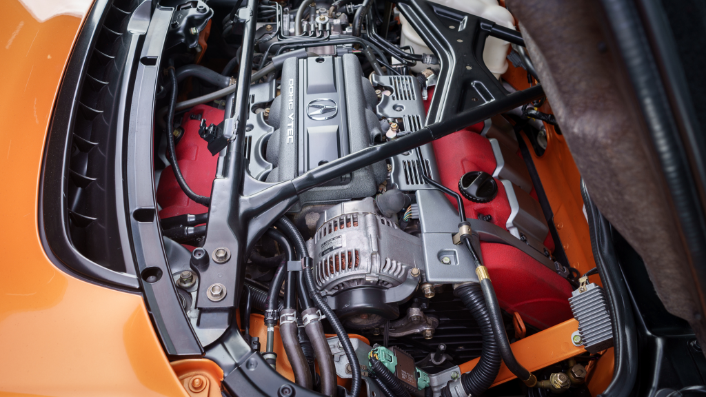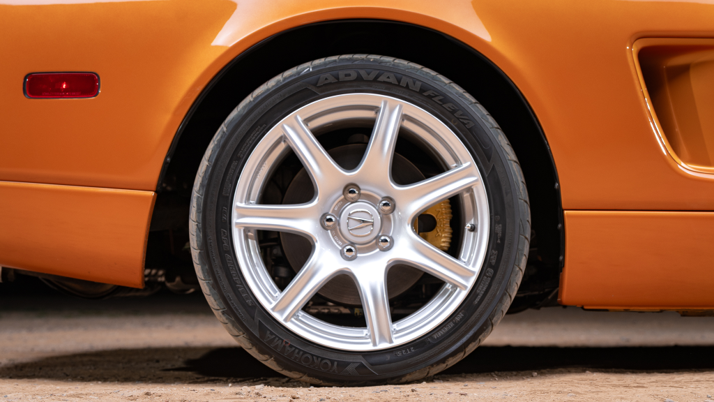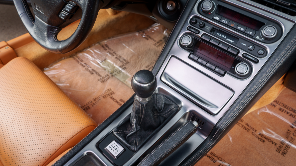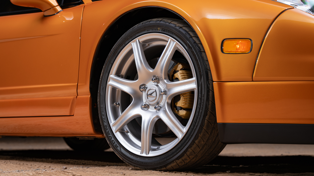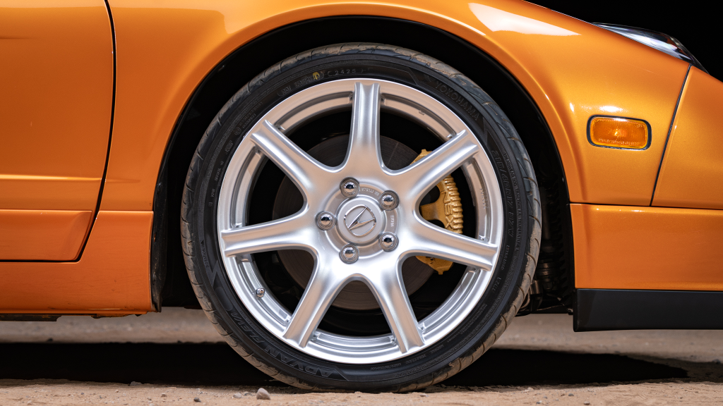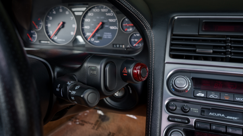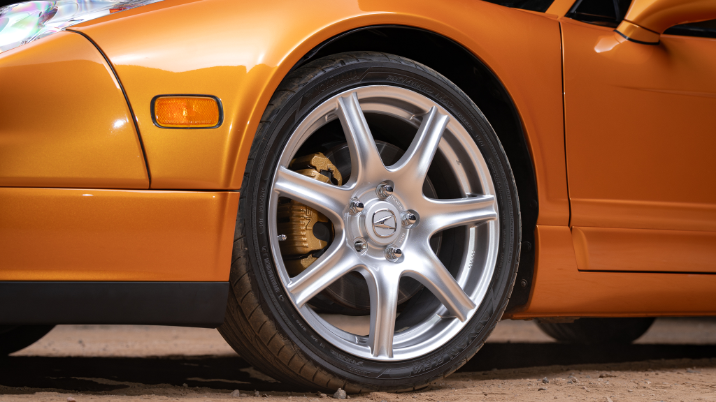 The 17” seven-spoke forged wheels wear Yokohama Advan tires that were mounted in preparation for the sale. The car features a four-wheel double-wishbone suspension with front and rear stabilizer bars, and braking is handled by NSX-branded calipers over vented rotors at each corner.