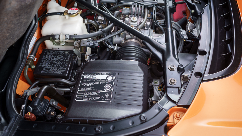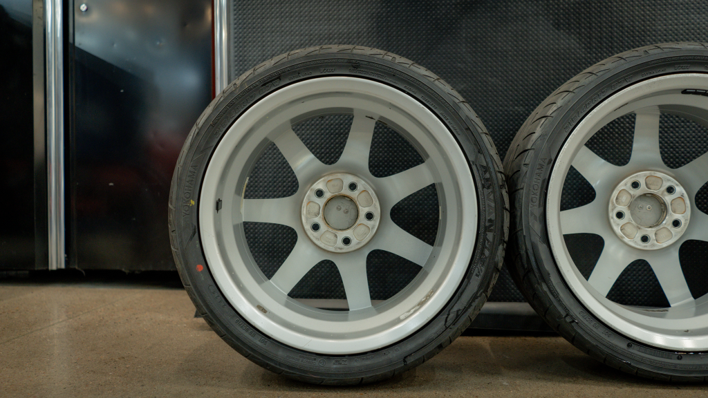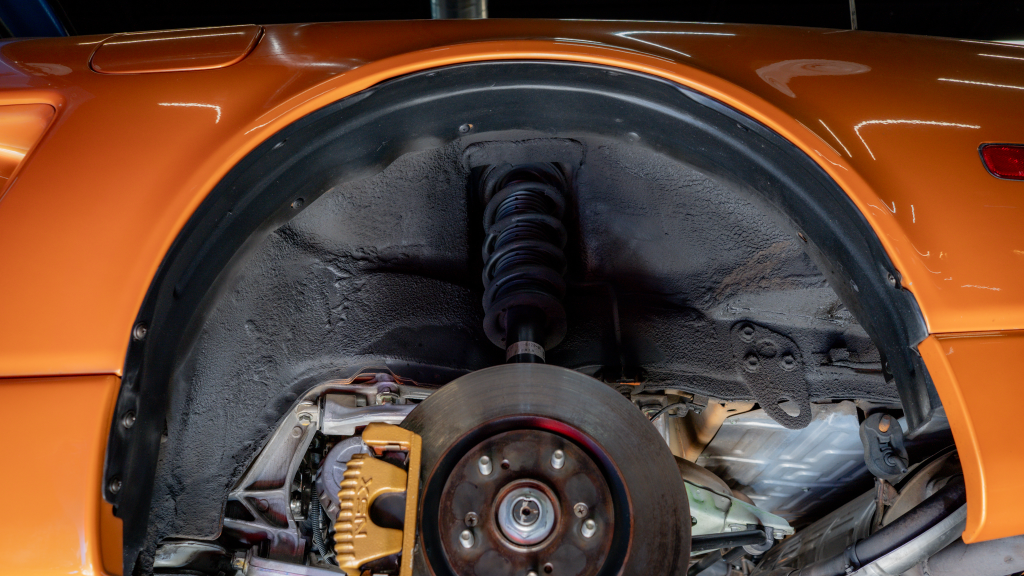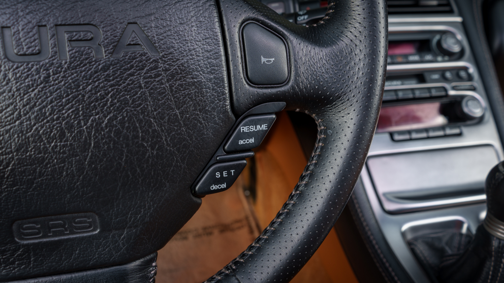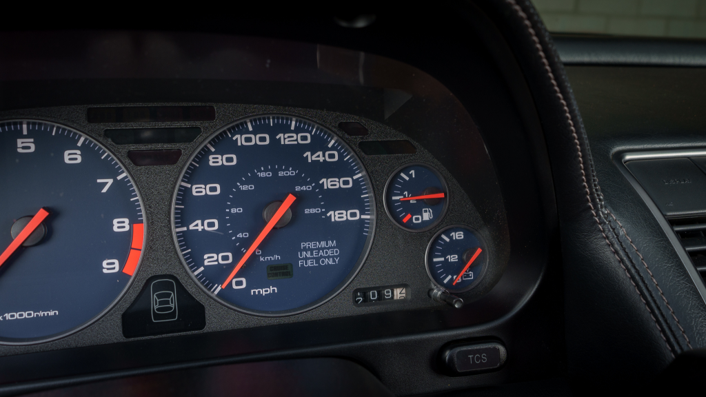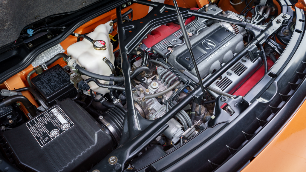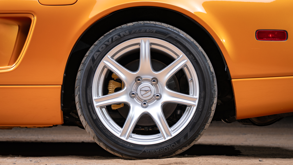 The 17” seven-spoke forged wheels wear Yokohama Advan tires that were mounted in preparation for the sale. The car features a four-wheel double-wishbone suspension with front and rear stabilizer bars, and braking is handled by NSX-branded calipers over vented rotors at each corner.