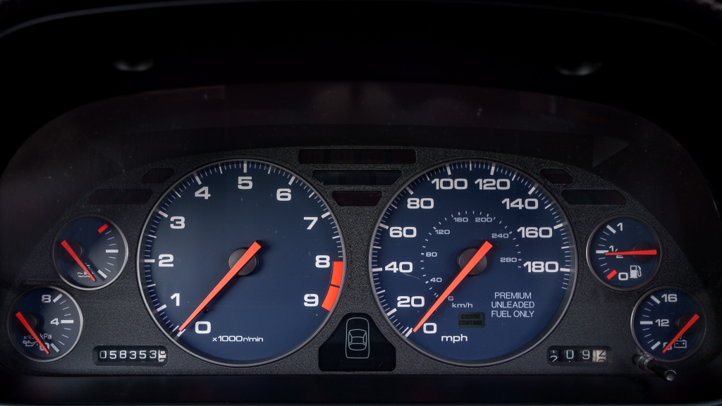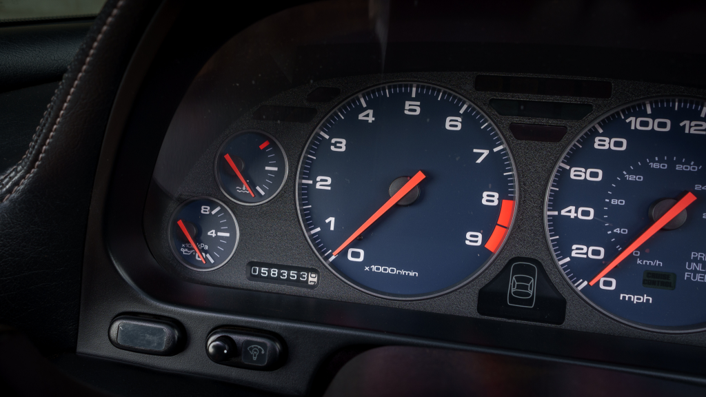 The leather-wrapped steering wheel frames a tachometer with an 8k-rpm redline, a 188-mph speedometer, and gauges for coolant temperature, oil pressure, voltage, and fuel level. The six-digit odometer shows 58k miles, approximately 47k of which were added under current ownership.