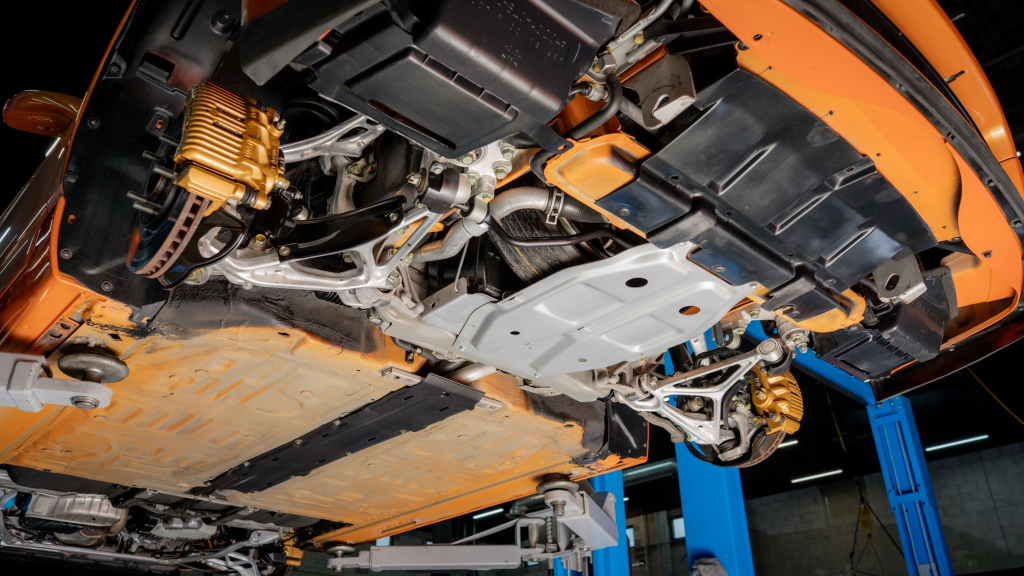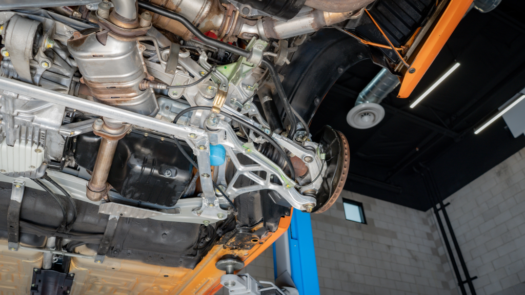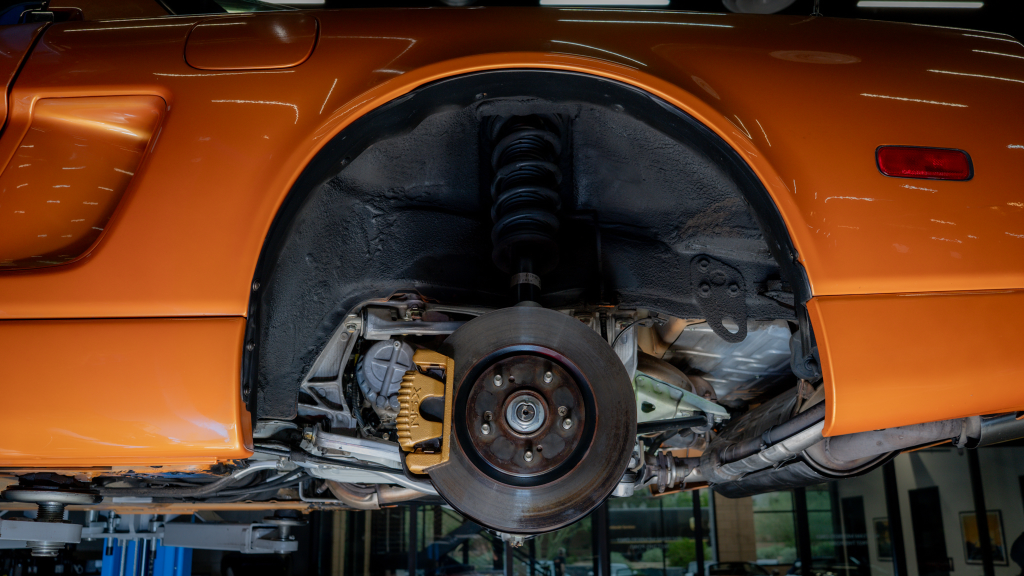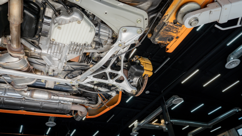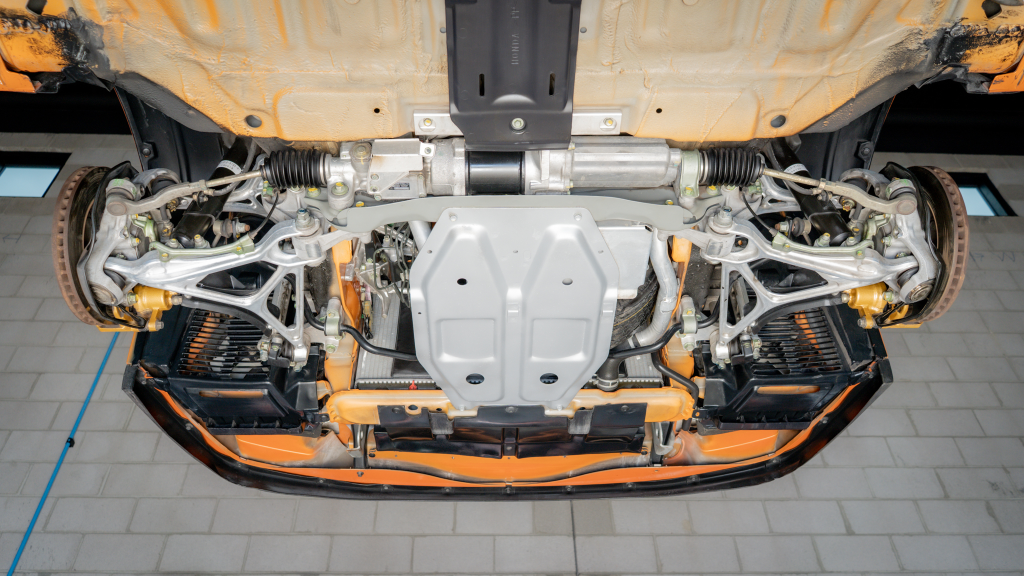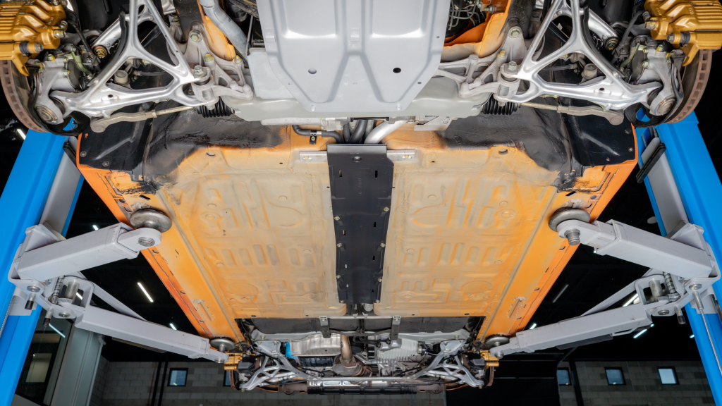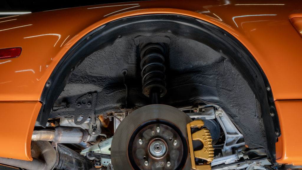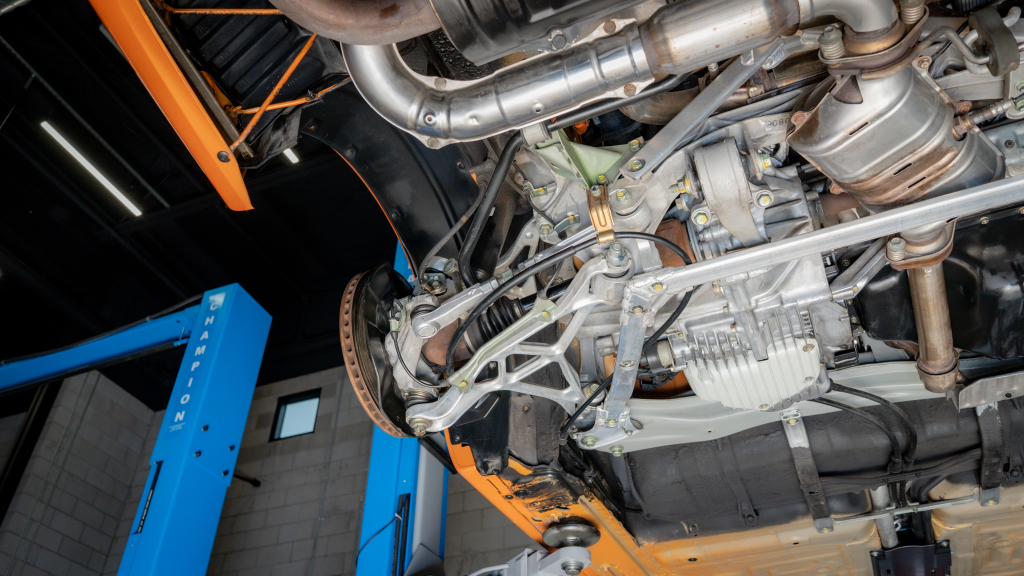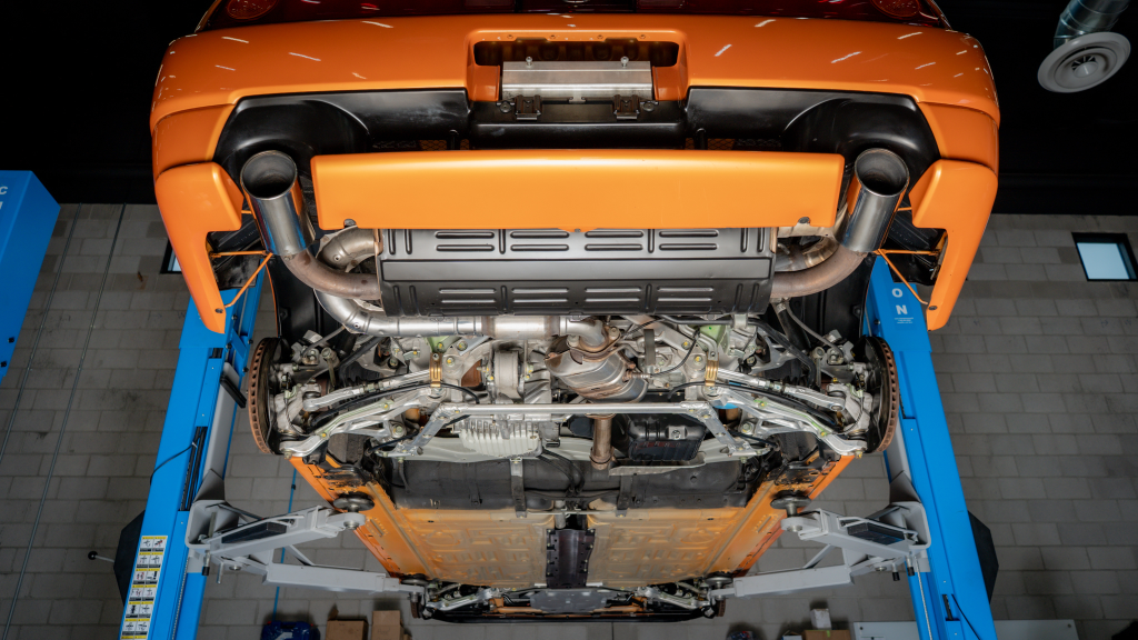 Power is routed to the rear wheels via a six-speed manual transaxle and a limited-slip differential. Additional photos of the underside are provided in the gallery.
