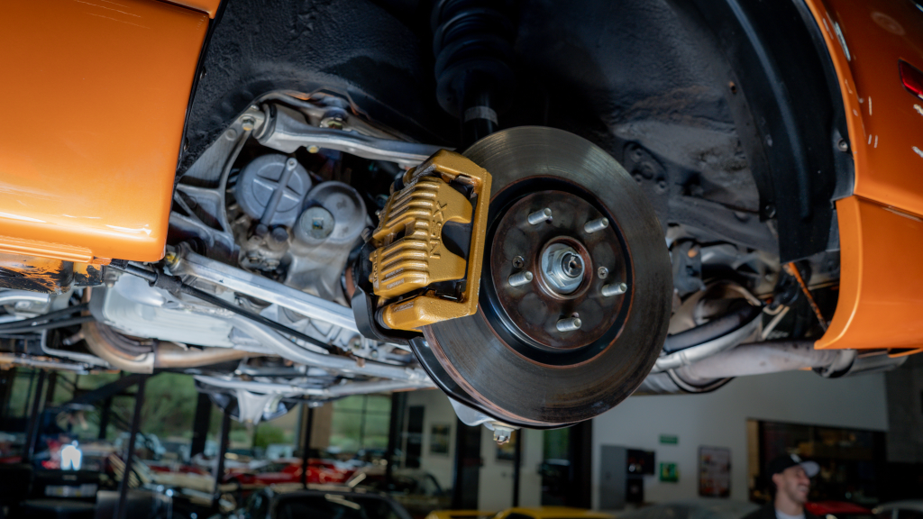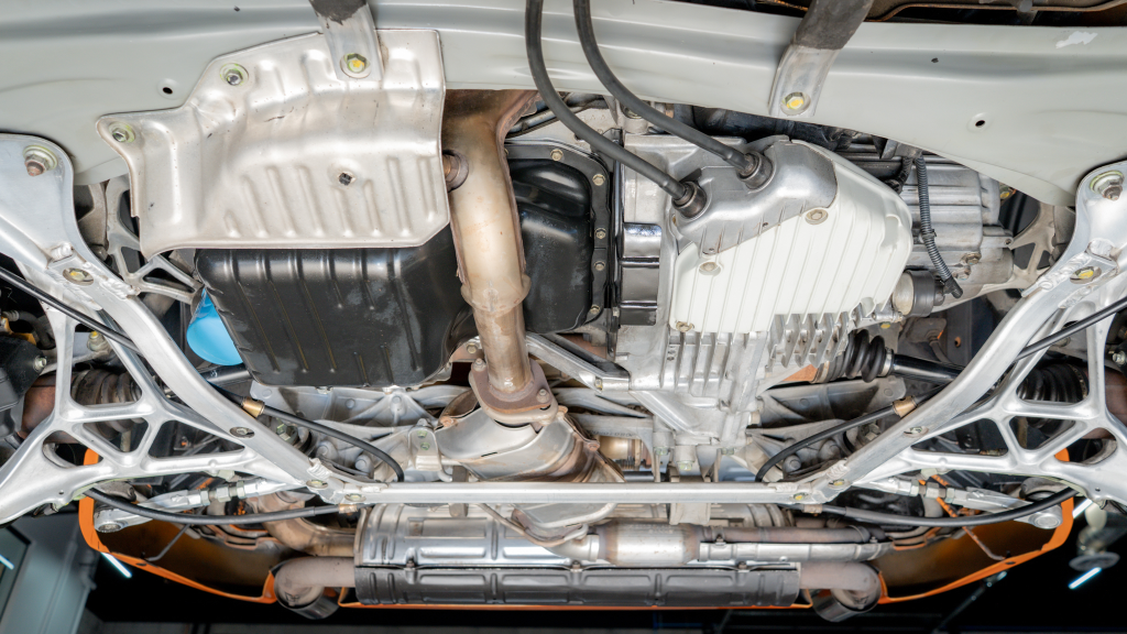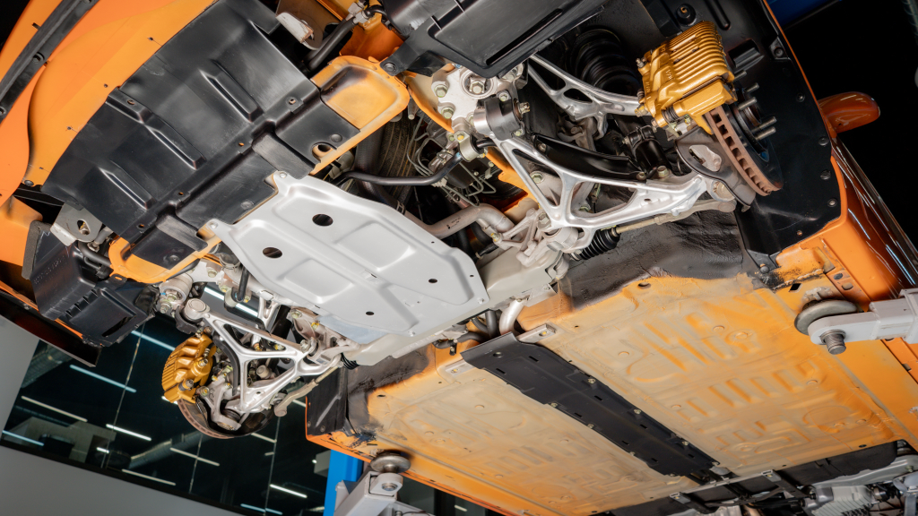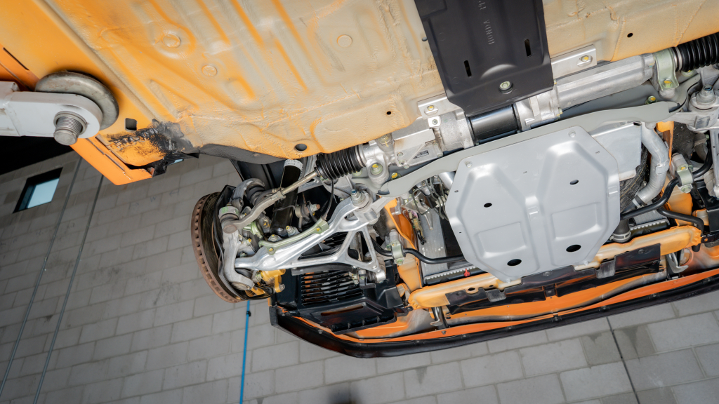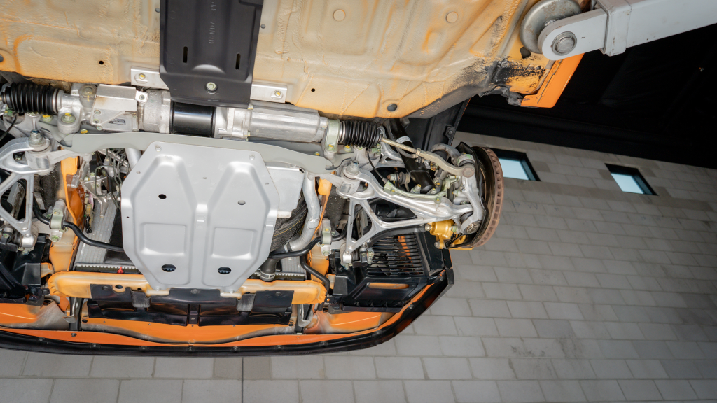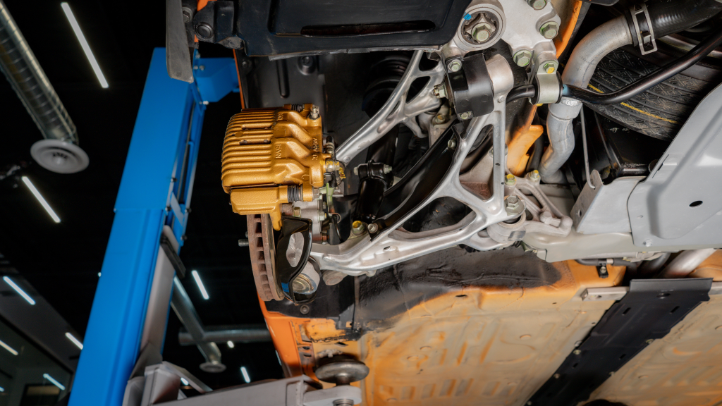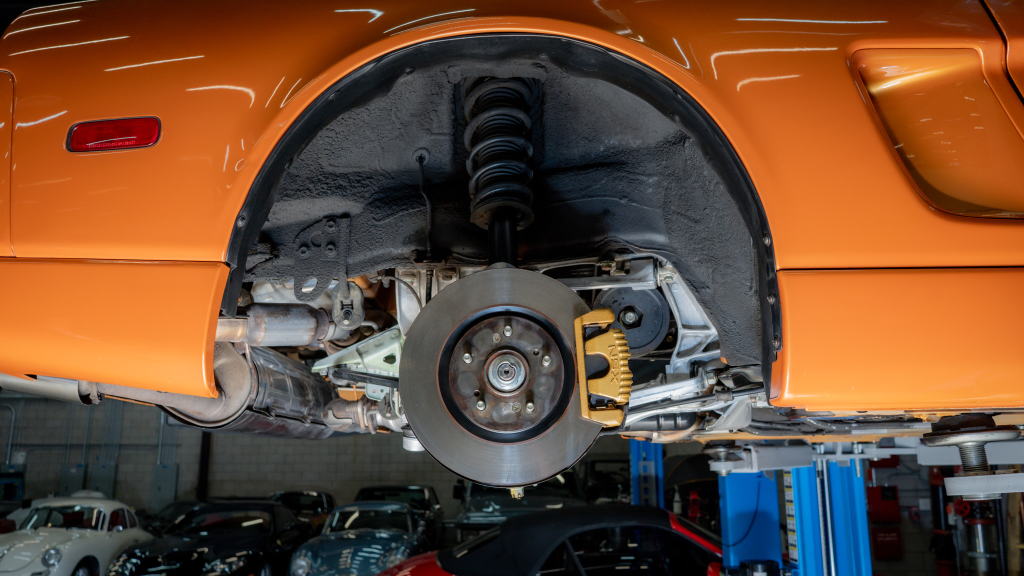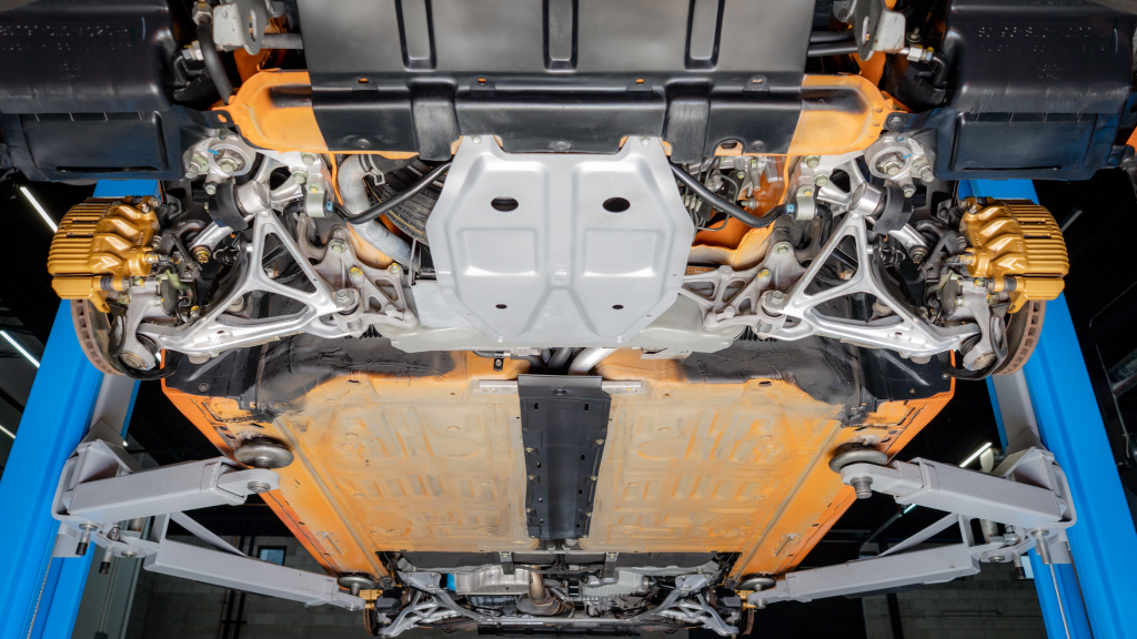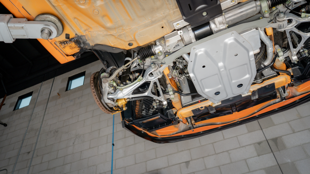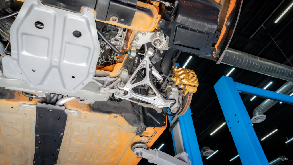 Power is routed to the rear wheels via a six-speed manual transaxle and a limited-slip differential. Additional photos of the underside are provided in the gallery.