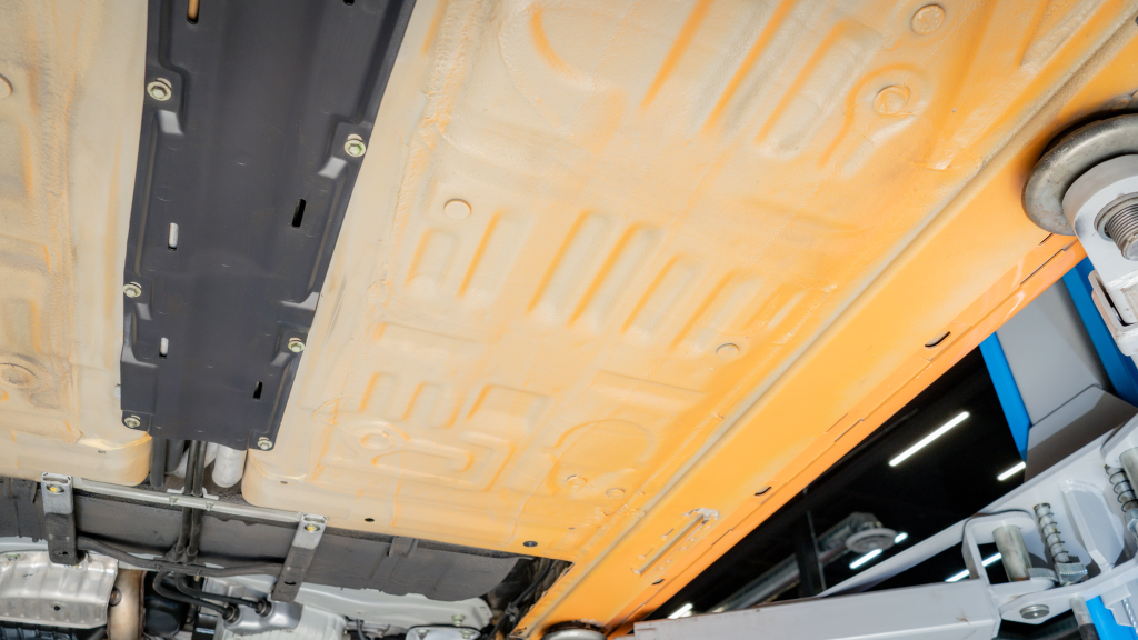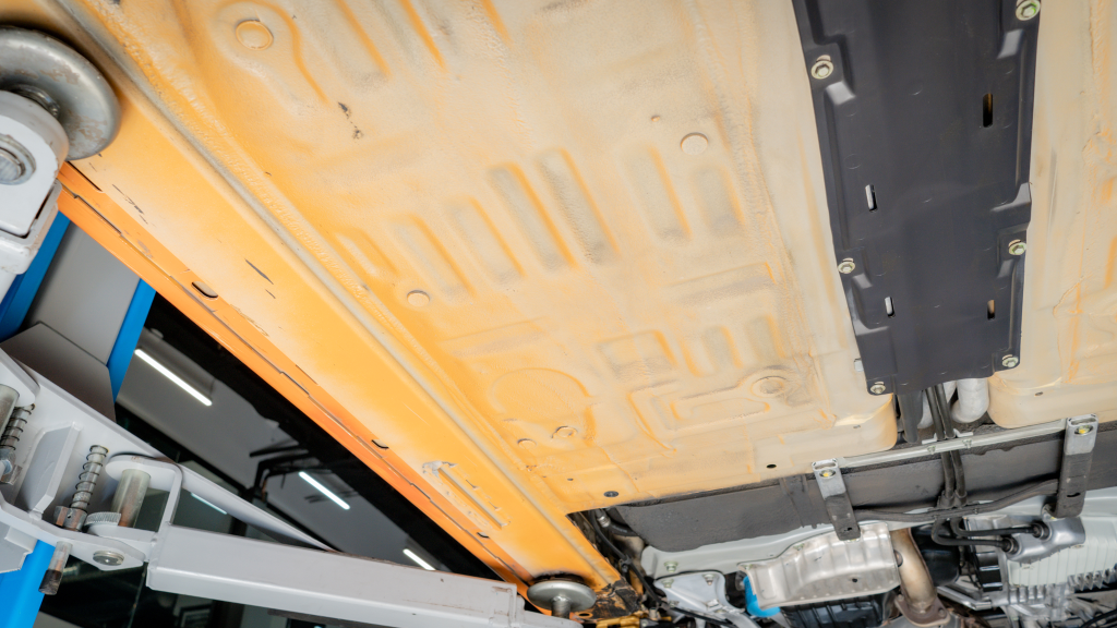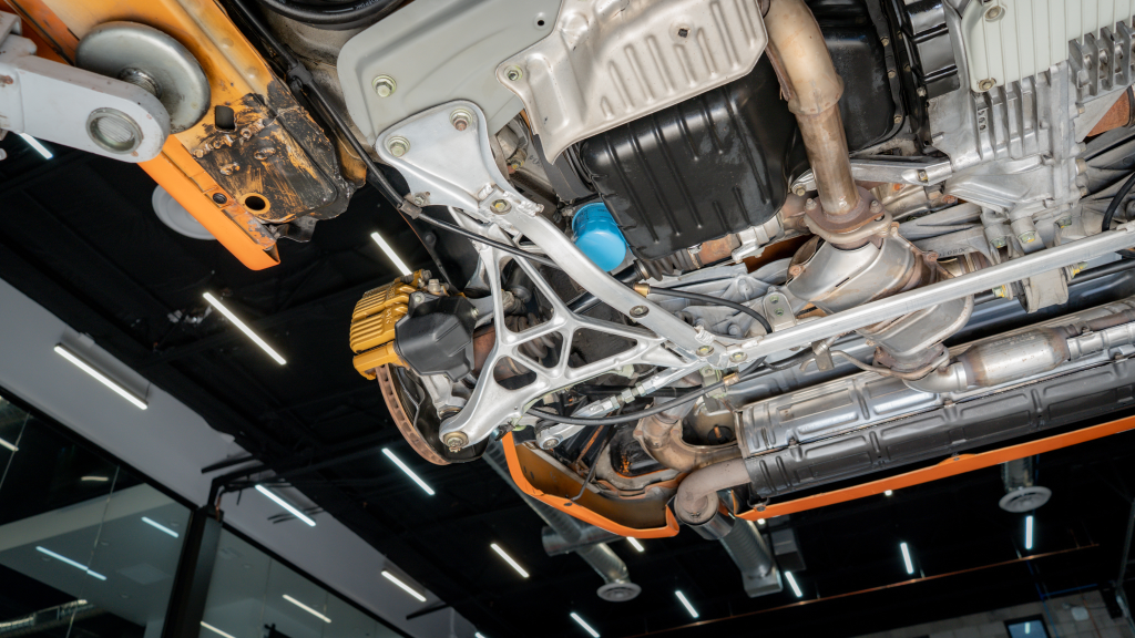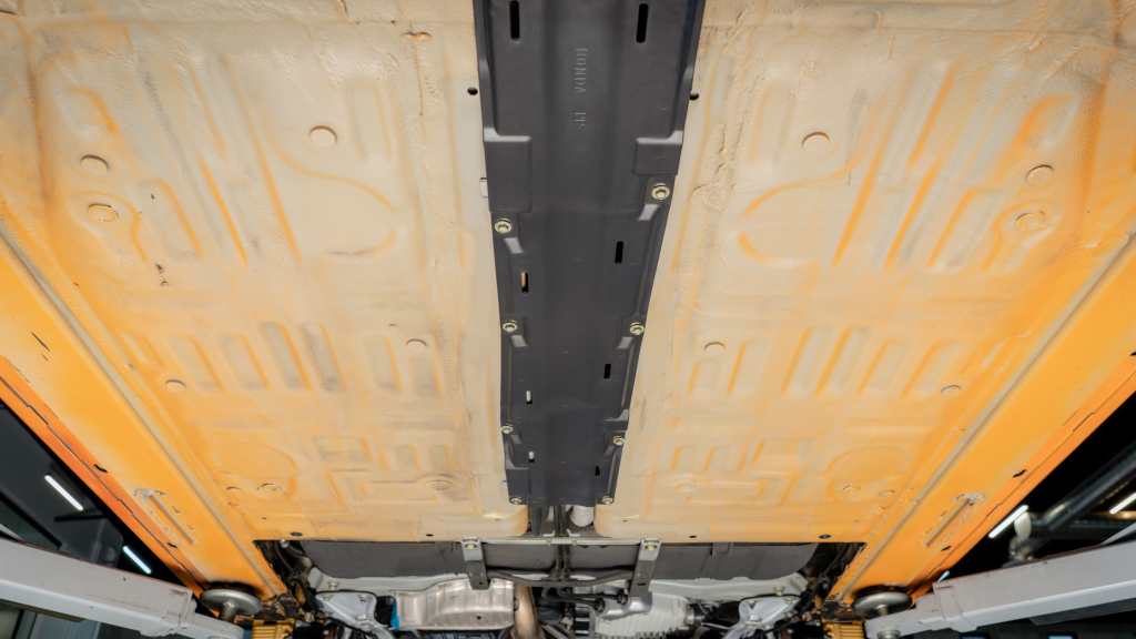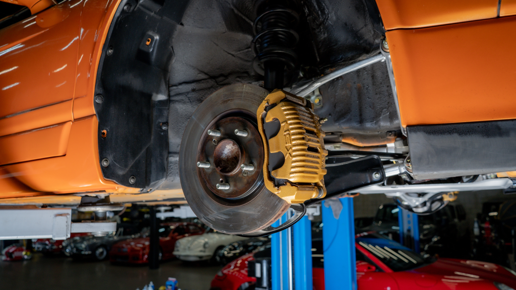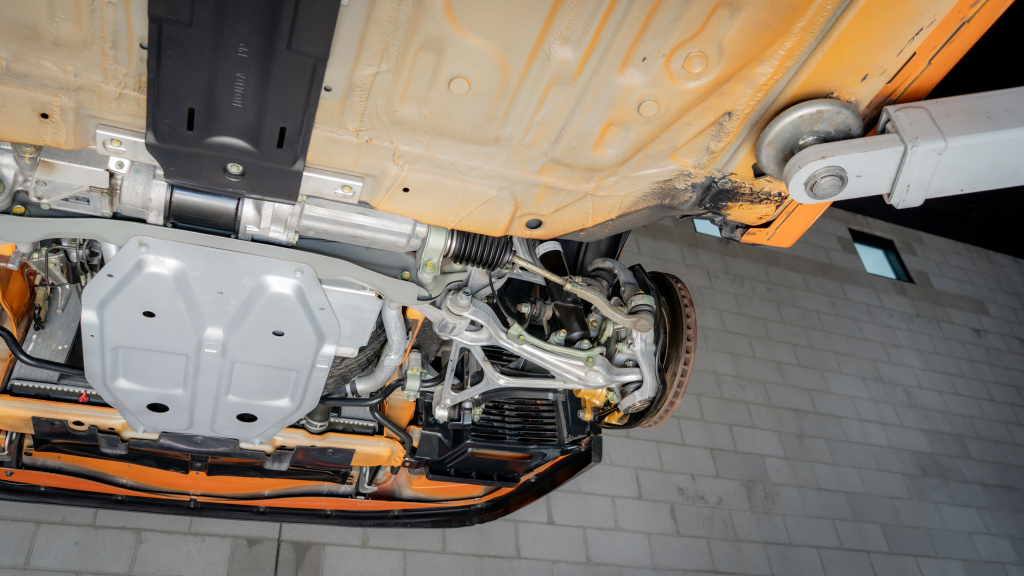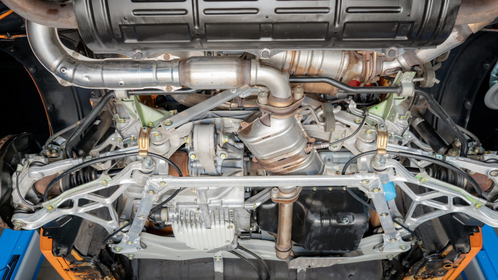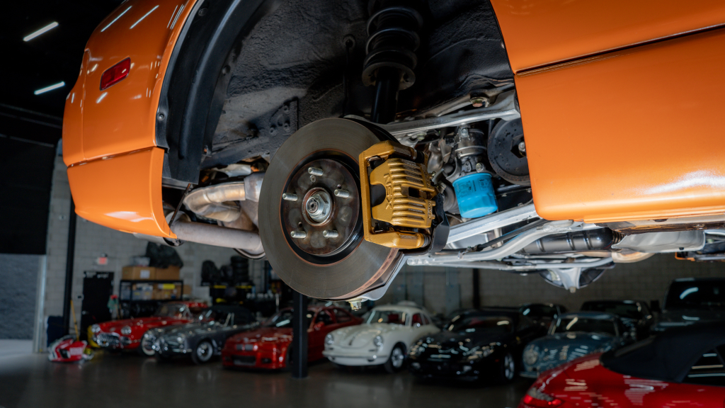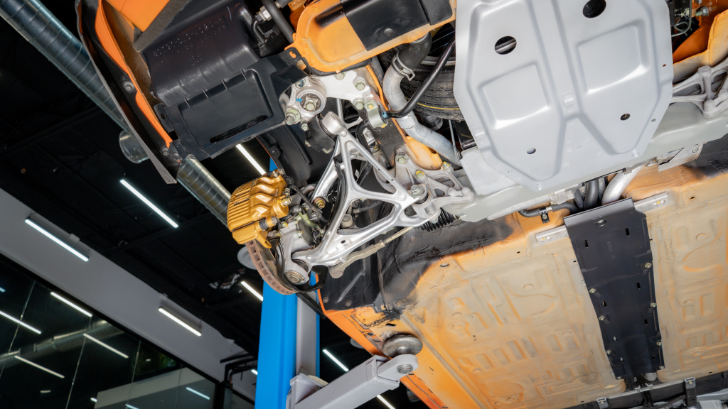 Power is routed to the rear wheels via a six-speed manual transaxle and a limited-slip differential. Additional photos of the underside are provided in the gallery.