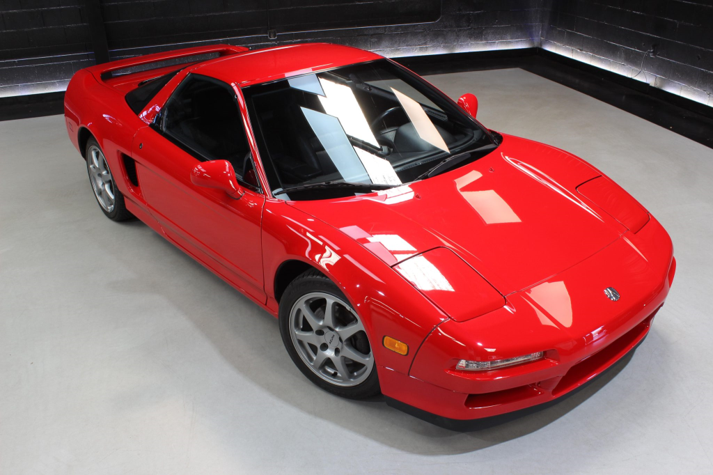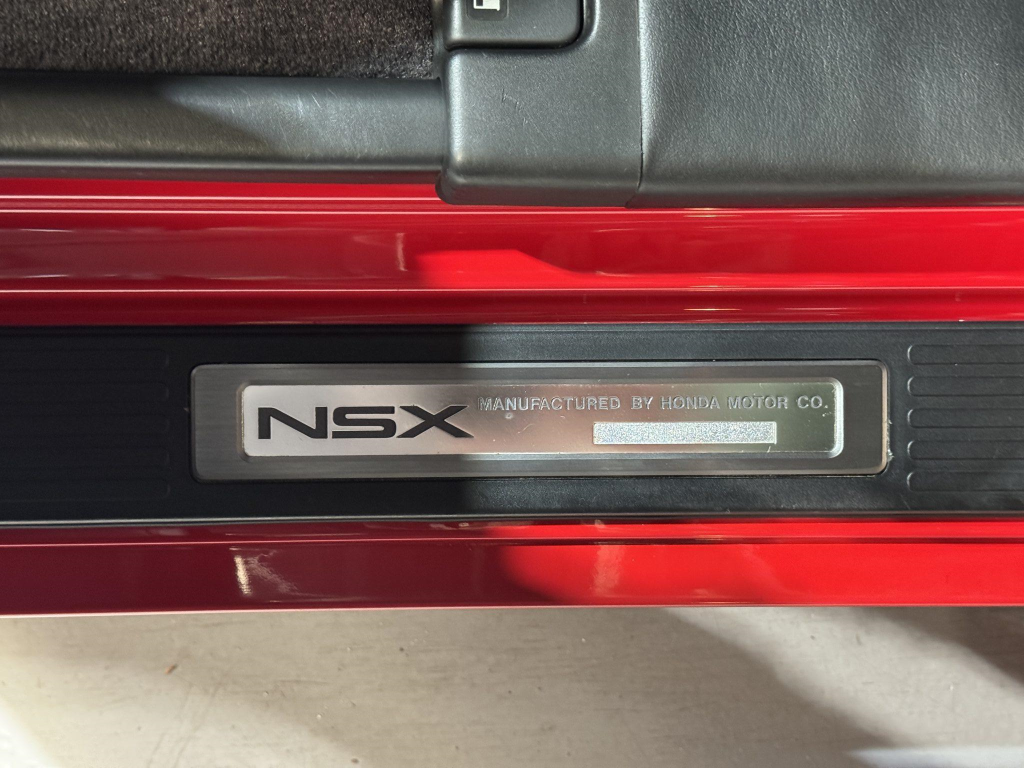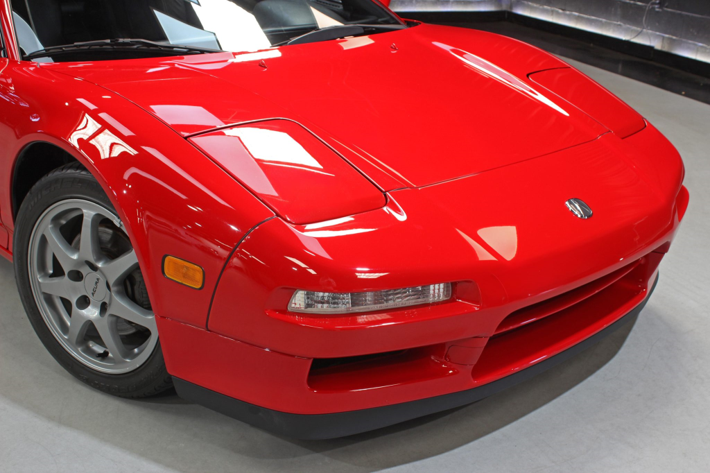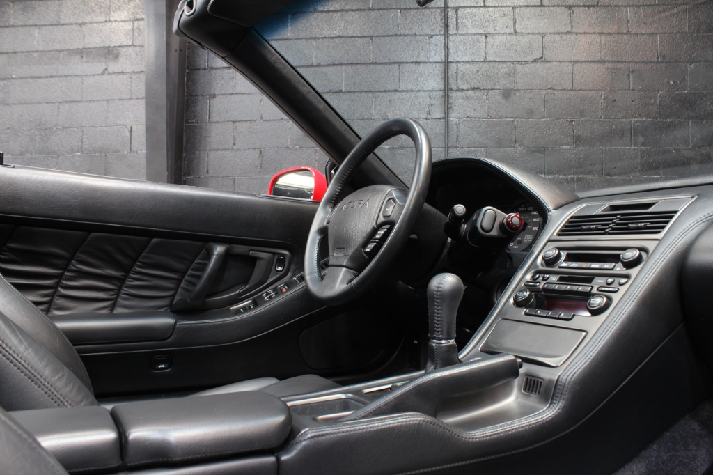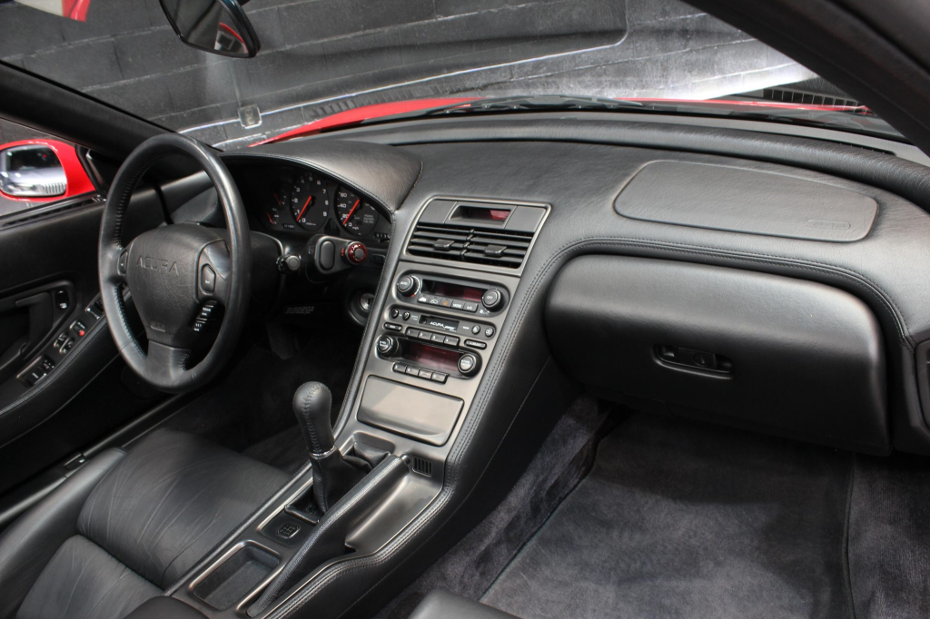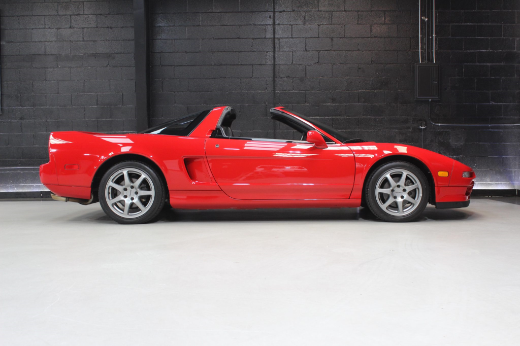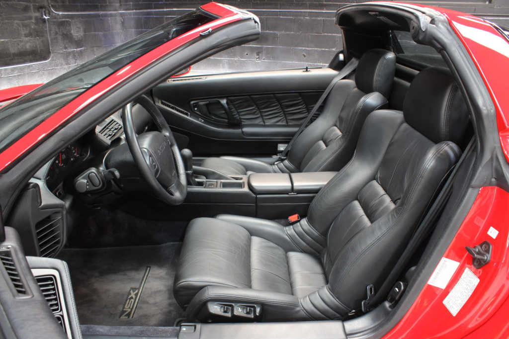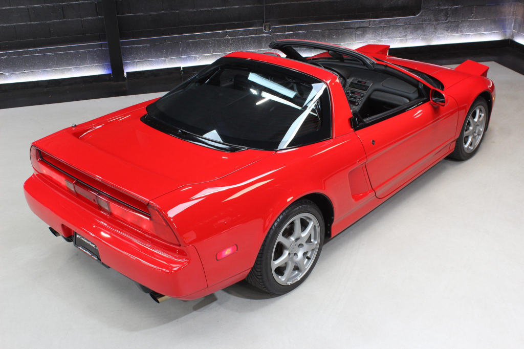 The NSX featured aluminum bodywork, and this example is finished in Formula Red with a body-color removable roof panel. Features include pop-up headlights, an integrated rear wing, side air intakes, power-adjustable side mirrors, and dual exhaust outlets.