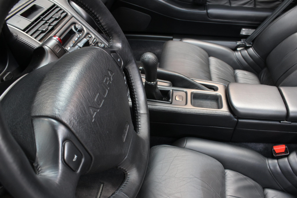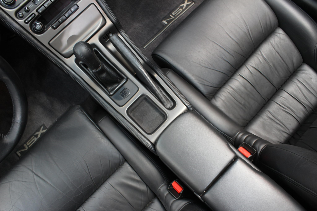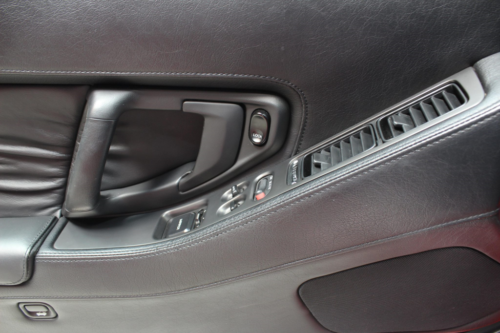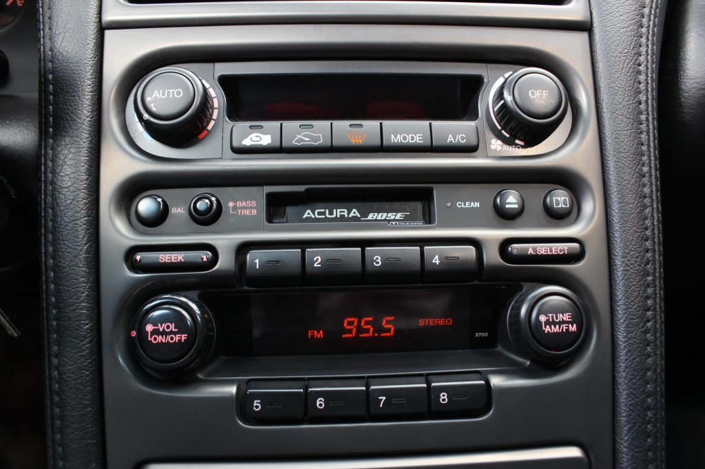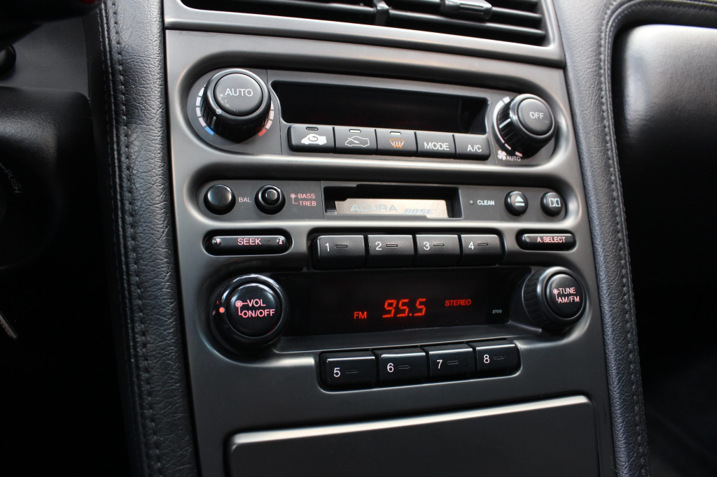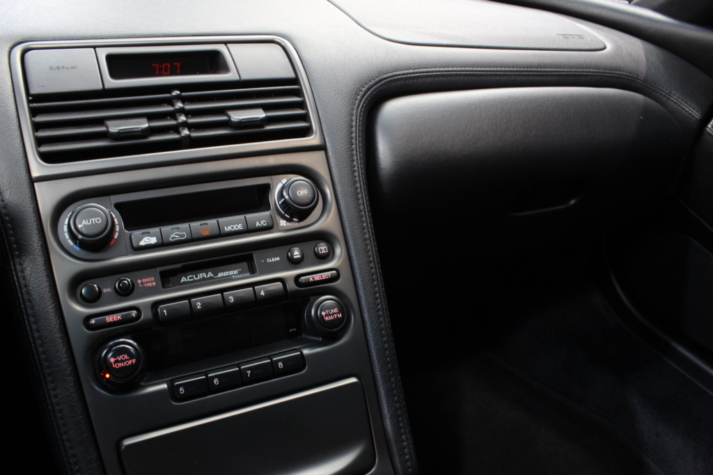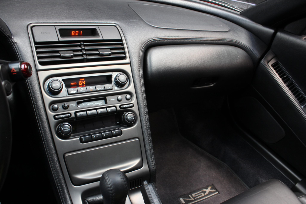 The cabin features power-adjustable sport seats upholstered in black leather, while NSX-branded floor mats line the footwells. Interior appointments include automatic climate control, cruise control, a Bose sound system, and a cassette stereo linked to a six-disc CD changer. The stainless-steel door sill plates are stamped with the car’s serial number. The climate control unit was repaired in December 2025.