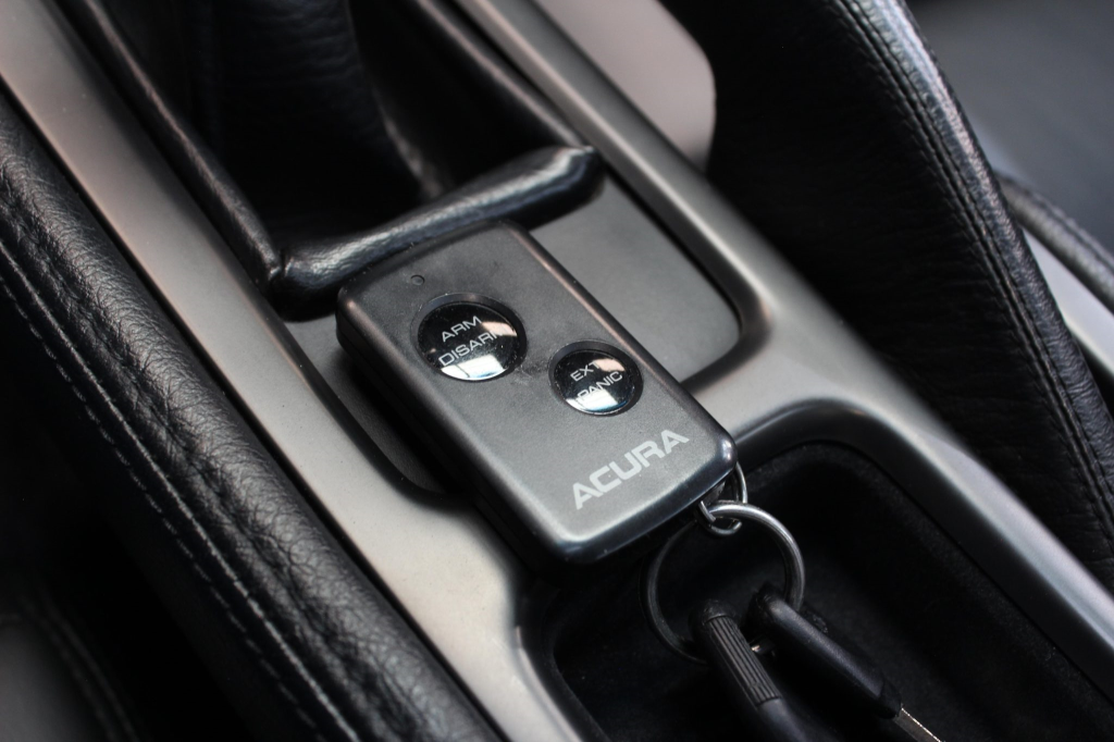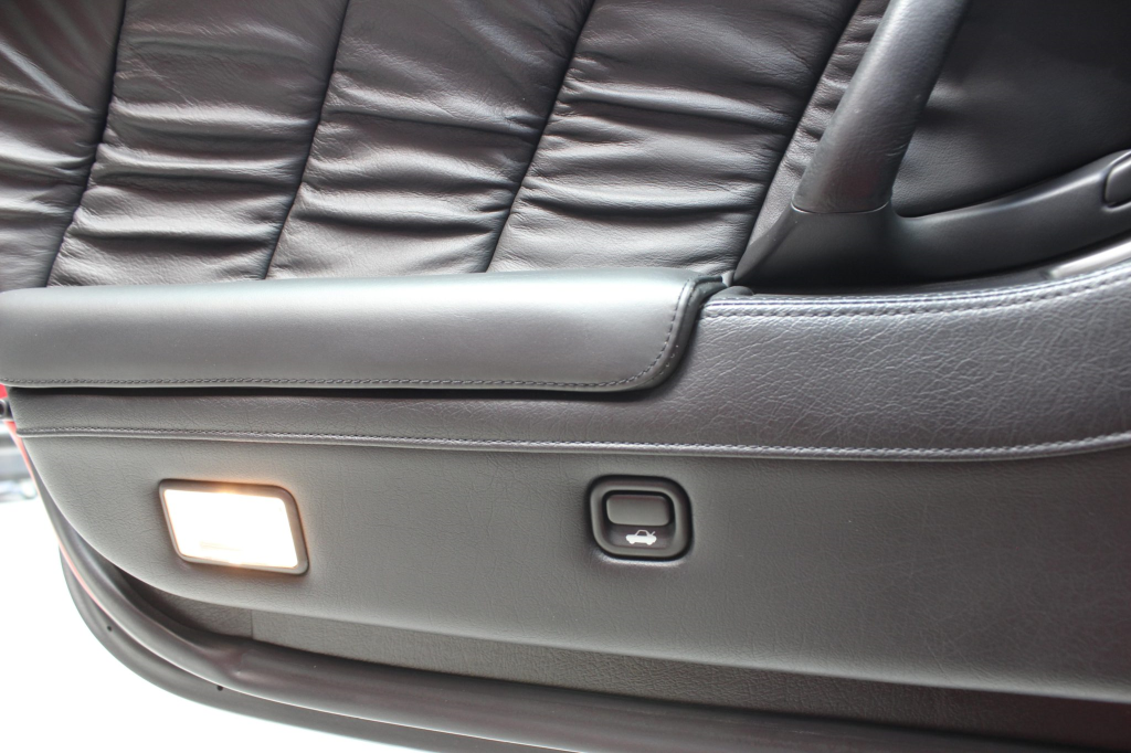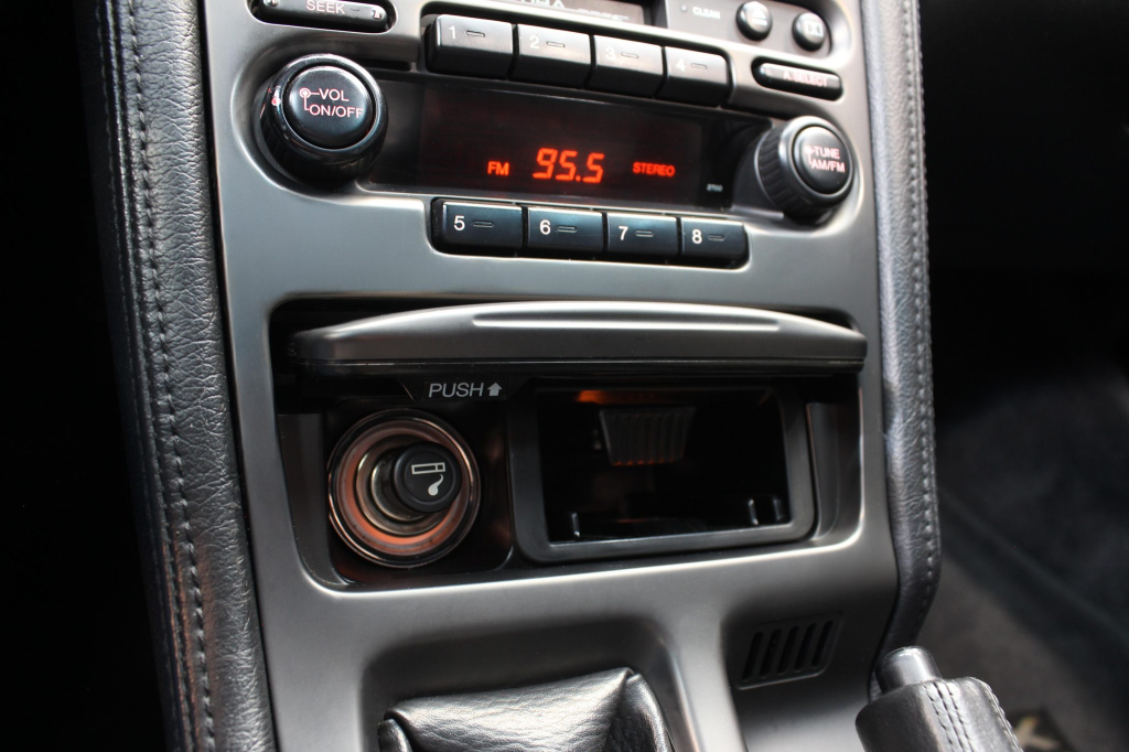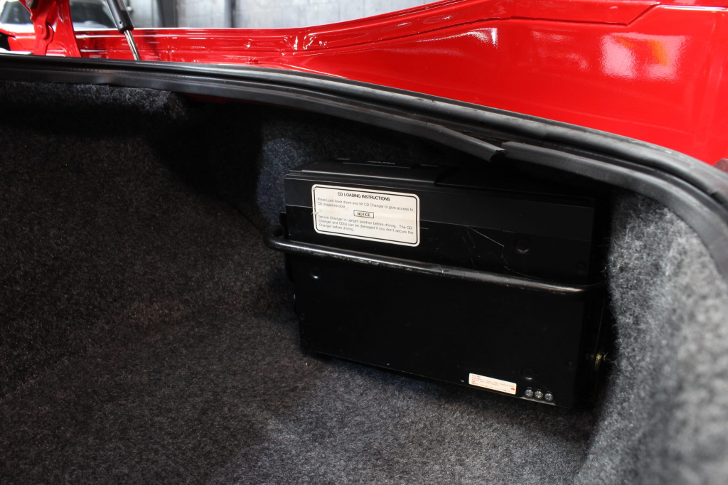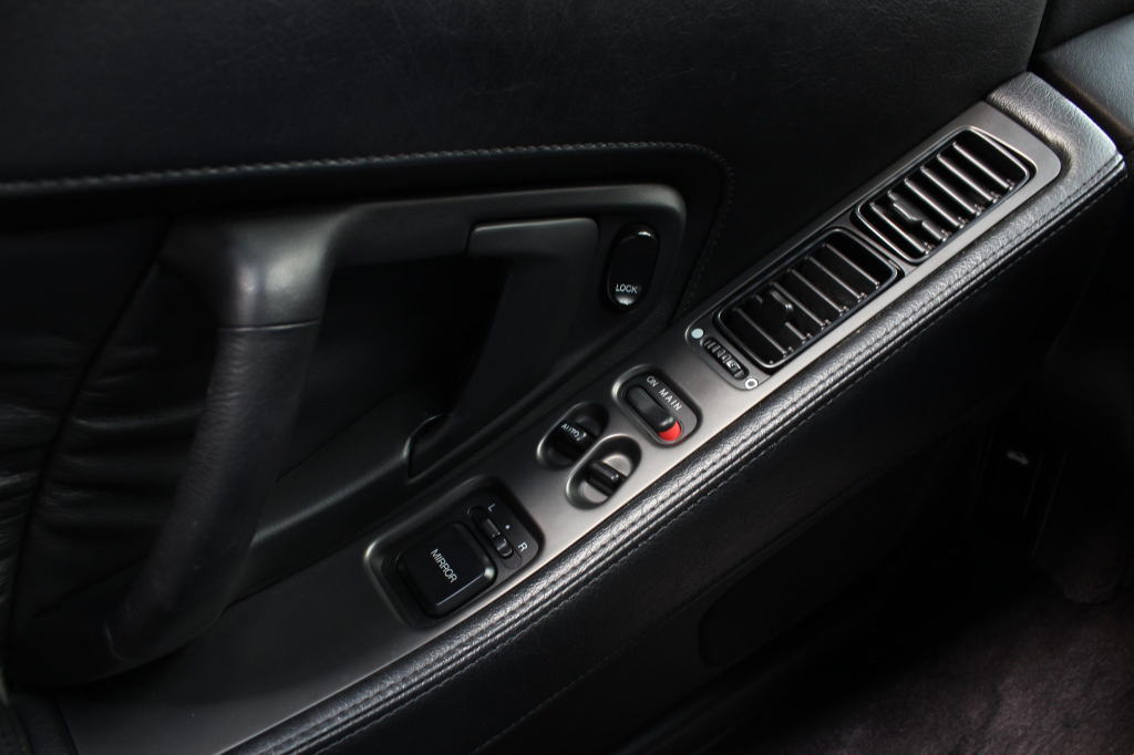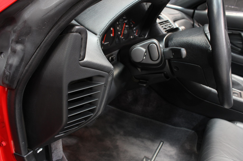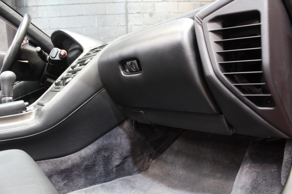 The cabin features power-adjustable sport seats upholstered in black leather, while NSX-branded floor mats line the footwells. Interior appointments include automatic climate control, cruise control, a Bose sound system, and a cassette stereo linked to a six-disc CD changer. The stainless-steel door sill plates are stamped with the car’s serial number. The climate control unit was repaired in December 2025.