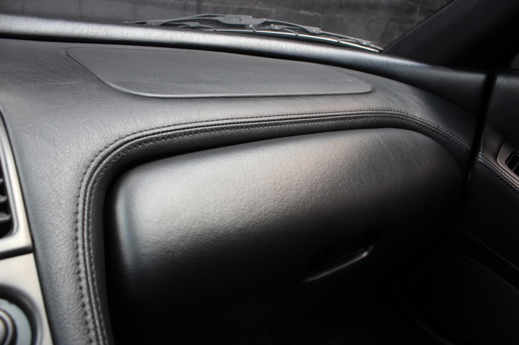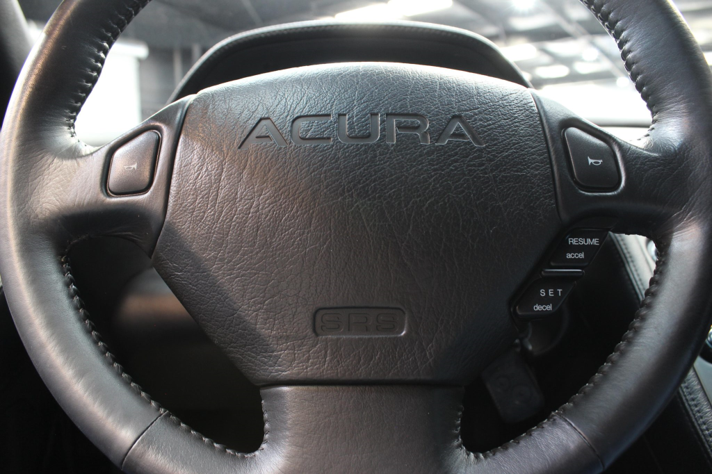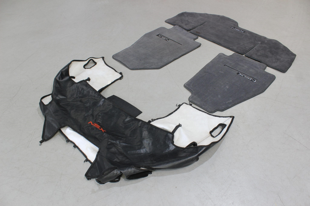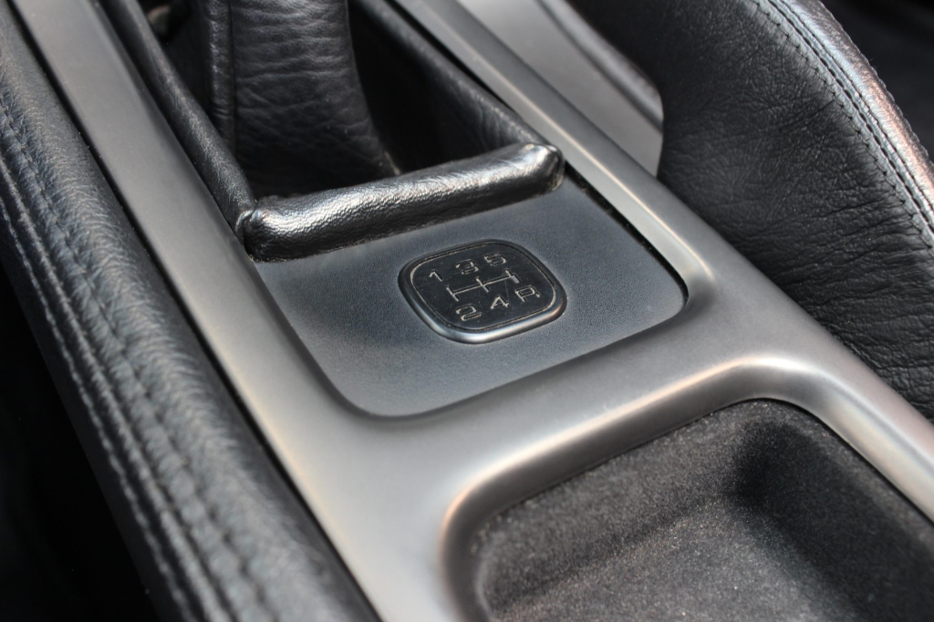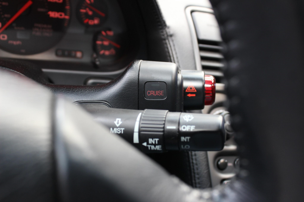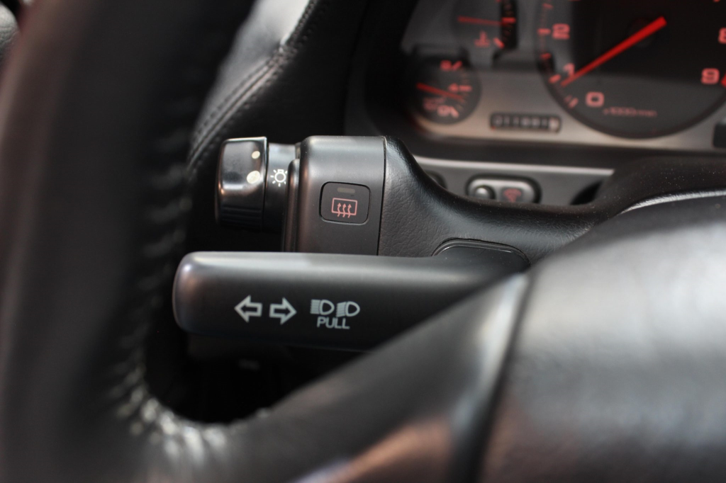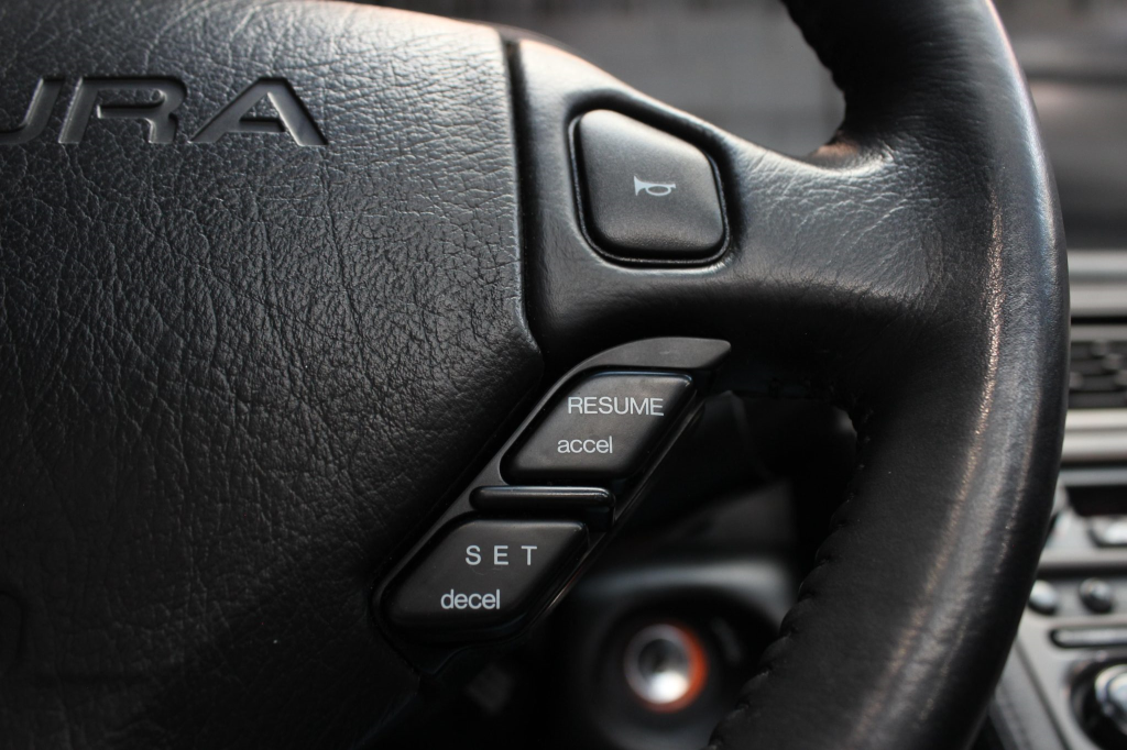 The cabin features power-adjustable sport seats upholstered in black leather, while NSX-branded floor mats line the footwells. Interior appointments include automatic climate control, cruise control, a Bose sound system, and a cassette stereo linked to a six-disc CD changer. The stainless-steel door sill plates are stamped with the car’s serial number. The climate control unit was repaired in December 2025.