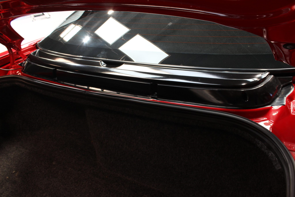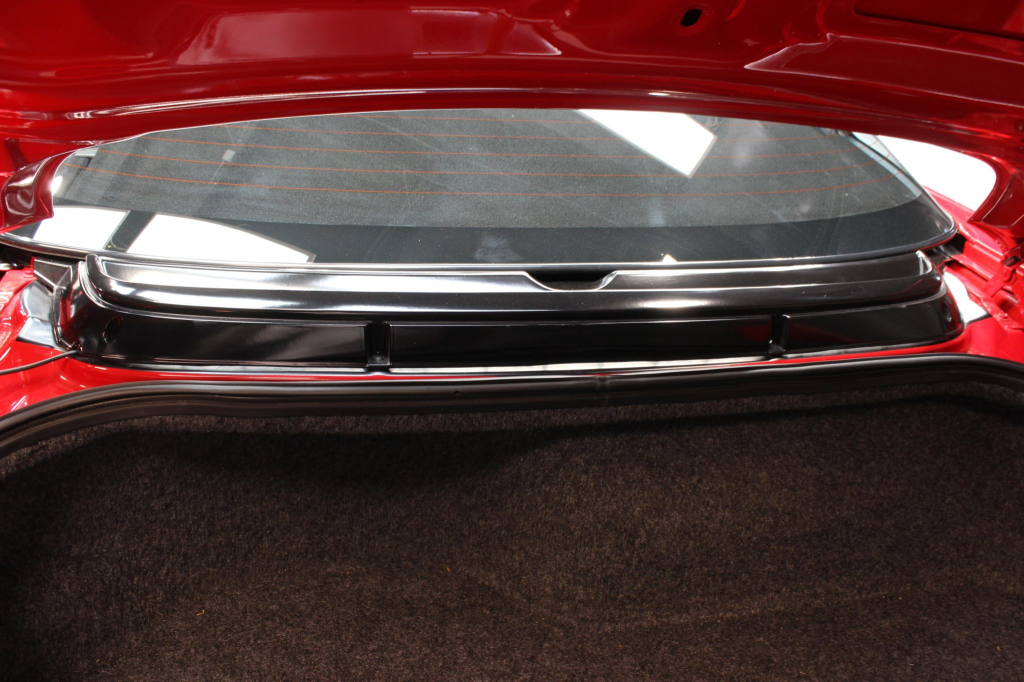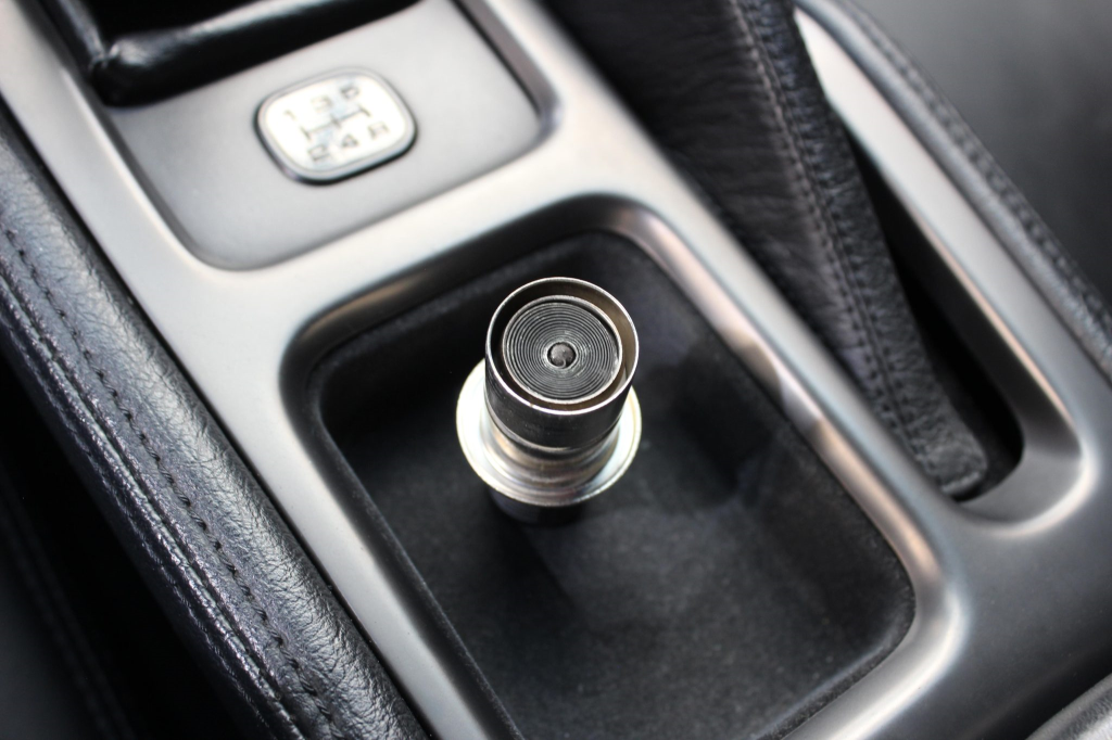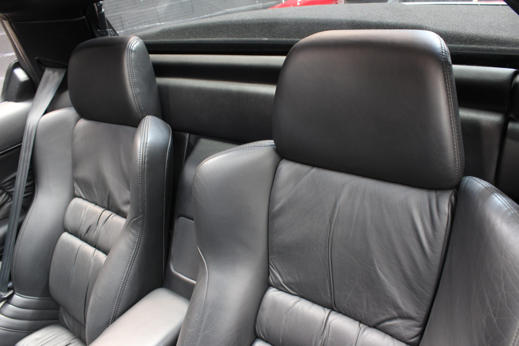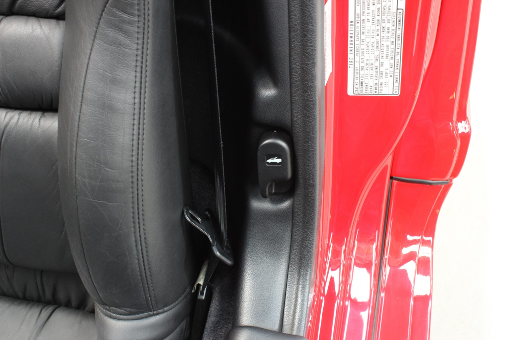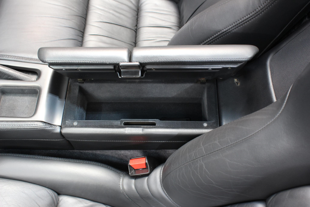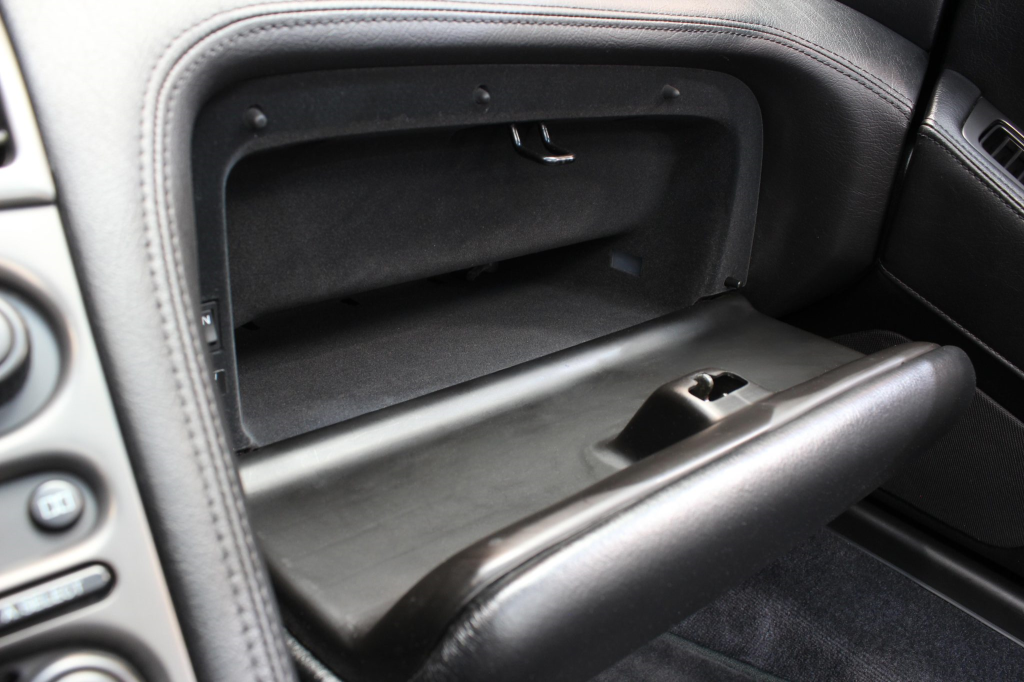 The cabin features power-adjustable sport seats upholstered in black leather, while NSX-branded floor mats line the footwells. Interior appointments include automatic climate control, cruise control, a Bose sound system, and a cassette stereo linked to a six-disc CD changer. The stainless-steel door sill plates are stamped with the car’s serial number. The climate control unit was repaired in December 2025.